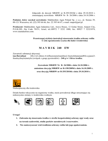 Załącznik do decyzji MRiRW nr R-293/2010d z dnia 29.10.2010 r. zmieniającej zezwolenie MRiRW Nr R- 26/2006 z dnia 24.10.2006 r. Podmiot, który uzyskał zezwolenie: Makhteshim Agan Poland Sp. z o.o., ul. Sienna 39, 00-121 Warszawa, tel. (22) 395 66 66, fax: 22 395 66 67, e-mail: [email protected]. Producent: Makhteshim Agan Industries Ltd., Arava House, 12 Golan Street, Airport City, P.O.B.289, Zip Code 70151, Izrael, tel.:00972 7 3232 1000, fax: 00927 7 32321074, www.maindustries.com. Przestrzegaj etykiety-instrukcji stosowania środka ochrony roślin w celu ograniczenia ryzyka dla ludzi i środowiska M A V R I K 240 EW Zawartość substancji aktywnej: tau-fluwalinat /(R)-2-[2-chloro-4-trifluorometyloanilino]-3metylobutanian(RS)-cyjano(3fenoksyfenylo)metylu (związek z grupy pyretroidów) - 240 g w 1 litrze środka. Zezwolenie MRiRW Nr R- 26/2006 z dnia 24.10.2006 r. zmienione decyzją MRiRW nr R-158/2009d z dnia 16.10.2009 r. oraz decyzją MRiRW nr R-293/2010d z dnia 29.10.2010 r. Niebezpieczny dla środowiska Działa bardzo toksycznie na organizmy wodne, może powodować długo utrzymujące się niekorzystne zmiany w środowisku wodnym. Uwaga! 1. Zabrania się stosowania środka w strefie bezpośredniej ochrony ujęć wody oraz na terenie uzdrowisk, otulin parków narodowych i rezerwatów. 2. Nie zanieczyszczać wód środkiem ochrony roślin lub jego opakowaniem. 1 I OPIS DZIAŁANIA Środek owadobójczy w formie emulsji (olej w wodzie) do sporządzania emulsji wodnej, o działaniu żołądkowym i kontaktowym przeznaczony do zwalczania szkodników rzepaku ozimego i jabłoni. Na roślinie działa powierzchniowo. II ZAKRES, TERMINY STOSOWANIA I DAWKI 1. ROŚLINY ROLNICZE RZEPAK OZIMY chowacz brukwiaczek Zalecana dawka: 0,2 l/ha. Opryskiwać w 7-10 dni po pierwszych nalotach szkodnika, ale przed złożeniem jaj. słodyszek rzepakowy (zabieg przeciwko słodyszkowi zwalcza również chowacza czterozębnego). Zalecana dawka: 0,2 l/ha. Opryskiwać zgodnie z sygnalizacją, po wystąpieniu chrząszczy na plantacji. szkodniki łuszczynowe (chowacz podobnik, pryszczarek kapustnik) Zalecana dawka 0,2 l/ha. Opryskiwać w początkowym okresie opadania płatków kwiatowych. Zalecana ilość wody: 150-400 l/ha. Zalecane opryskiwanie: średniokropliste. 2. ROŚLINY SADOWNICZE JABŁOŃ mszyca jabłoniowa Zalecana dawka: 0,2 l/ha. Zabieg wykonać po wystąpieniu szkodnika. Zalecana ilość wody: 500-750 l/ha. UWAGI: 1. Środek działa skuteczniej w temperaturze poniżej 200 C. W temperaturze wyższej zabiegi wykonywać pod koniec dnia. 2. Nie stosować na rośliny zwiędnięte lub porażone przez choroby. 2 3. Zabieg wykonać dokładnie, aby wszystkie części roślin były pokryte cieczą użytkową. III OKRES KARENCJI okres od dnia ostatniego zabiegu do dnia zbioru i przeznaczenia do konsumpcji RZEPAK OZIMY – 56 DNI JABŁOŃ – 14 DNI IV OKRES PREWENCJI DLA PSZCZÓŁ, LUDZI, ZWIERZĄT okres zapobiegający zatruciu NIE DOTYCZY V SPORZĄDZANIE CIECZY UŻYTKOWEJ Przed przystąpieniem do sporządzenia cieczy użytkowej dokładnie ustalić potrzebną jej ilość. Odmierzoną ilość środka wlać do zbiornika opryskiwacza napełnionego częściowo wodą (z włączonym mieszadłem) i uzupełnić wodą do potrzebnej ilości. Po wlaniu środka do zbiornika opryskiwacza nie wyposażonego w mieszadło hydrauliczne ciecz mechanicznie wymieszać. Opróżnione opakowania przepłukać trzykrotnie wodą, a popłuczyny wlać do zbiornika opryskiwacza z cieczą użytkową. Po pracy aparaturę dokładnie wymyć. VI PRZECHOWYWANIE Chronić przed dziećmi. Nie przechowywać razem z żywnością, napojami i paszami dla zwierząt. Przechowywać pojemnik szczelnie zamknięty w chłodnym miejscu. Przechowywać z dala od źródeł ciepła. Przechowywać wyłącznie w oryginalnym opakowaniu w temperaturze nie przekraczającej 0oC i 30oC. VII WARUNKI BEZPIECZNEGO STOSOWANIA ŚRODAK OCHRONY ROŚLIN Nie jeść i nie pić oraz nie palić tytoniu podczas stosowania produktu. Nosić odpowiednią odzież ochronną i odpowiednie rękawice ochronne. W razie połknięcia niezwłocznie zasięgnij porady lekarza - pokaż opakowanie lub etykietę. Środek i opakowanie usuwać jako odpad niebezpieczny. Resztki cieczy użytkowej rozcieńczyć wodą i wypryskać na powierzchni poprzednio opryskiwanej. 3 Wodę użytą do mycia aparatury wypryskać na powierzchni uprzednio opryskiwanej, stosując środki ochronny osobistej. Opróżnione opakowania po środku zwrócić do sprzedawcy, u którego środek został zakupiony. Zabrania się spalania opakowań po środku we własnym zakresie. UWAGA ! ZABRANIA SIĘ WYKORZYSTYWANIA OPRÓŻNIONYCH OPAKOWAŃ PO ŚRODKACH OCHRONY ROŚLIN DO INNYCH CELÓW, W TYM TAKŻE TRAKTOWANIA ICH JAKO SUROWCE WTÓRNE. W przypadku awarii lub jeżeli źle się poczujesz, niezwłocznie zasięgnij porady lekarza – jeżeli to możliwe, pokaż etykietę. VII ANTIDOTUM BRAK, STOSOWAĆ LECZENIE OBJAWOWE VIII POMOC MEDYCZNA W zaistniałych sytuacjach, kiedy wymagana jest lub konieczna inna pomoc medyczna niż ujęta w ostrzeżeniach skontaktować się z najbliższym ośrodkiem toksykologicznym: Gdańsk Kraków Lublin Łódź Poznań – (58) 682 04 04 – (12) 411 99 99 – (81) 740 89 83 – (42) 657 99 00 – (61) 847 69 46 Rzeszów – (17) 866 40 25 Sosnowiec – (32) 266 11 45 Tarnów – (14) 631 54 09 Warszawa – (22) 619 66 54 Wrocław – (71) 343 30 08 Okres ważności - 2 lata Data produkcji - ........ Zawartość netto - ........ Nr partii - ........ 4