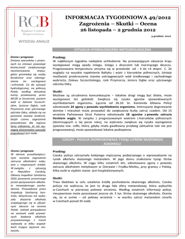 INFORMACJA TYGODNIOWA 49/2012 Zagrożenia – Skutki – Ocena 26 listopada – 2 grudnia 2012 3 grudnia 2012 WYDZIAŁ ANALIZ SYTUACJA HYDROLOGICZNO-METEOROLOGICZNA Ocena i prognoza: Zmiana warunków z jesiennych na zimowe powoduje koniecznośd zwiększonego monitorowania miejsc, gdzie gromadzą się osoby bezdomne oraz udostępnienia im noclegowni i schronisk. Co do sytuacji hydrologicznej, na północy Polski, według aktualnej oceny przekazanej przez WCZK w Szczecinie, poziom wód w Zalewie Szczecioskim, Jeziorze Dąbie, rzek Przymorza oraz ujściowego odcinka Odry, układa się na poziomie stanów średnich, dzięki czemu zagrożenie powodziowe dla regionu (przy założeniu, że nie wystąpią ekstremalne warunki pogodowe) jest małe. Przebieg: W najbliższym tygodniu nadejdzie ochłodzenie. Na przeważającym obszarze kraju występowad mogą opady śniegu, śniegu z deszczem lub marznącego deszczu. Prognozowana temperatura utrzyma się w przedziale od - 4 do +4 stopni C. Ze względu na wysokie napełnienie Bałtyku i wiatr z kierunków północnych, istnieje możliwośd przekroczenia stanów ostrzegawczych wód środkowego i zachodniego wybrzeża, Zalewu Szczecioskiego, rzek Przymorza, Jeziora Dąbie oraz ujściowego odcinka Odry. Skutki: Możliwe są utrudnienia komunikacyjne – lokalnie drogi mogą byd śliskie, może występowad też gołoledź. Zwiększa się ryzyko zgonów spowodowanych wychłodzeniem organizmu. Łącznie od 26.10. br. Komenda Główna Policji odnotowała 24 zgony z powodu wychłodzenia organizmu. Intensywne dogrzewanie domów i mieszkao może prowadzid do zwiększenia liczby zatrud czadem. Od 15 września Paostwowa Straż Pożarna odnotowała 18 zgonów z powodu zatrucia tlenkiem węgla. W związku z prognozowanym wiatrem z kierunków północnych (dominujących o tej porze roku), na wybrzeżu zwiększa się ryzyko wystąpienia zjawiska tzw. cofki, która, gdyby miała gwałtowny przebieg (aktualnie taki nie jest prognozowany), może spowodowad lokalne podtopienia. CZECHY - POLICJA SKONFISKOWAŁA TYSIĄC LITRÓW SKAŻONEGO ALKOHOLU Ocena i prognoza: W okresie przedświątecznym wzrasta zagrożenie zatrucia alkoholem nabytym z niepewnych źródeł. W związku z sytuacją w Republice Czeskiej, Główny Inspektor Sanitarny (GIS) ponownie przestrzega przed spożywaniem alkoholu niewiadomego pochodzenia. Prowadzone przez Inspekcję Sanitarną kontrole, dotychczas nie wykazały skażenia alkoholu znajdującego się w oficjalnym obrocie na terenie Polski. Jednak prowadzone na wniosek osób prywatnych badania alkoholu przywiezionego z Czech wykazały w kilku wypadkach trujące stężenie metanolu. Przebieg: Czeska policja zatrzymała kolejnego mężczyznę podejrzanego o wprowadzanie na rynek alkoholu skażonego metanolem. W jego domu znaleziono tysiąc litrów skażonego alkoholu. W ciągu kilku ostatnich dni, odnotowano zgony z powodu zatrucia alkoholem metylowym w Ostrawie i Frydku-Mistku, przy granicy z Polską. Kilka osób w ciężkim stanie jest hospitalizowanych. Skutki: Trwa śledztwo w celu ustalenia źródła pochodzenia skażonego alkoholu. Czeska policja nie wyklucza, że jest to druga fala afery metanolowej, która wybuchła w Czechach w pierwszej połowie września. Według ostatnich informacji policji, nieujawnione może pozostawad jeszcze ok. 5 tys. litrów skażonego alkoholu. Ocenia się, że w sumie – od połowy września – w wyniku zatrud metanolem zmarło w Czechach ponad 35 osób. INFORMACJA TYGODNIOWA 26.11 – 2.12. 2012 CHOROBA NIEBIESKIEGO JĘZYKA (BTV) – W GOSPODARSTWACH WOJ. PODLASKIEGO WYKRYTO FRAGMENT MATERIAŁU GENETYCZNEGO Ocena i prognoza: Choroba niebieskiego języka jest zakaźną lecz niezaraźliwą wirusową chorobą przeżuwaczy. Chorują głównie owce, rzadziej bydło i kozy. W Polsce choroba jest zwalczana z urzędu. Pierwszy przypadek BTV na terenie Polski odnotowano w 2006 roku. Zwalczanie choroby w głównej mierze polega na szczepieniach ochronnych owiec i bydła. RCB pozostaje w stałym kontakcie z CZK Ministra Rolnictwa i Rozwoju Wsi. Przebieg: Główny Lekarz Weterynarii (GLW) poinformował, że w ramach prowadzonego krajowego programu monitoringu choroby niebieskiego języka (BTV) w trzecim kwartale 2012 r. w trzech gospodarstwach na terenie woj. podlaskiego wykryto fragment materiału genetycznego BTV. Gospodarstwa te położone są wzdłuż granicy z Białorusią i Litwą, w powiatach - sokólskim, augustowskim oraz suwalskim. W żadnym z gospodarstw oraz na obszarze o promieniu 20 kilometrów wokół nich nie stwierdzono wśród zwierząt objawów klinicznych BTV. Skutki: W ww. gospodarstwach podjęto działania przewidziane przepisami, w tym wprowadzono zakaz w przemieszczaniu zwierząt oraz środki utrudniające przenoszenie zakażenia przez wektory (owady z rodzaju Culicoides). GLW poinformował, że otrzymał z Komisji Europejskiej informację o wystąpieniu podobnych problemów odnośnie choroby BTV na terytorium Litwy, Łotwy oraz Estonii. CYBERATAKI – HAKERZY ZAGRAŻAJĄ UŻYTKOWNIKOM ALLEGRO I PODSZYWAJĄ SIĘ POD POLICJĘ Ocena i prognoza: Skutecznośd hakerów uzależniona jest od świadomości użytkowników sieci. Konieczne jest propagowanie wiedzy o zabezpieczeniach komputerów osobistych, a także o potencjalnych zagrożeniach związanych z korzystaniem zwłaszcza z portali społecznościowych i zakupowych. Przebieg: W Internecie pojawiła się kolejna fala ataku spamowego na użytkowników serwisu aukcyjnego Allegro.pl. Wysyłane wiadomości e-mail zawierają odsyłacz do strony, na której może się znajdowad szkodliwy program. W sieci pojawiła się także nowa wersja wirusa Weelsof, atakująca komputery z systemami operacyjnymi MS Windows. Na ekranie zaatakowanego komputera pojawia się informacja o jego zablokowaniu przez policję (z logo policji i nazwą miasta). Dodatkowo, jeśli komputer ma wmontowaną kamerę, pojawia się komunikat o nagrywaniu obrazu w celu identyfikacji użytkowni