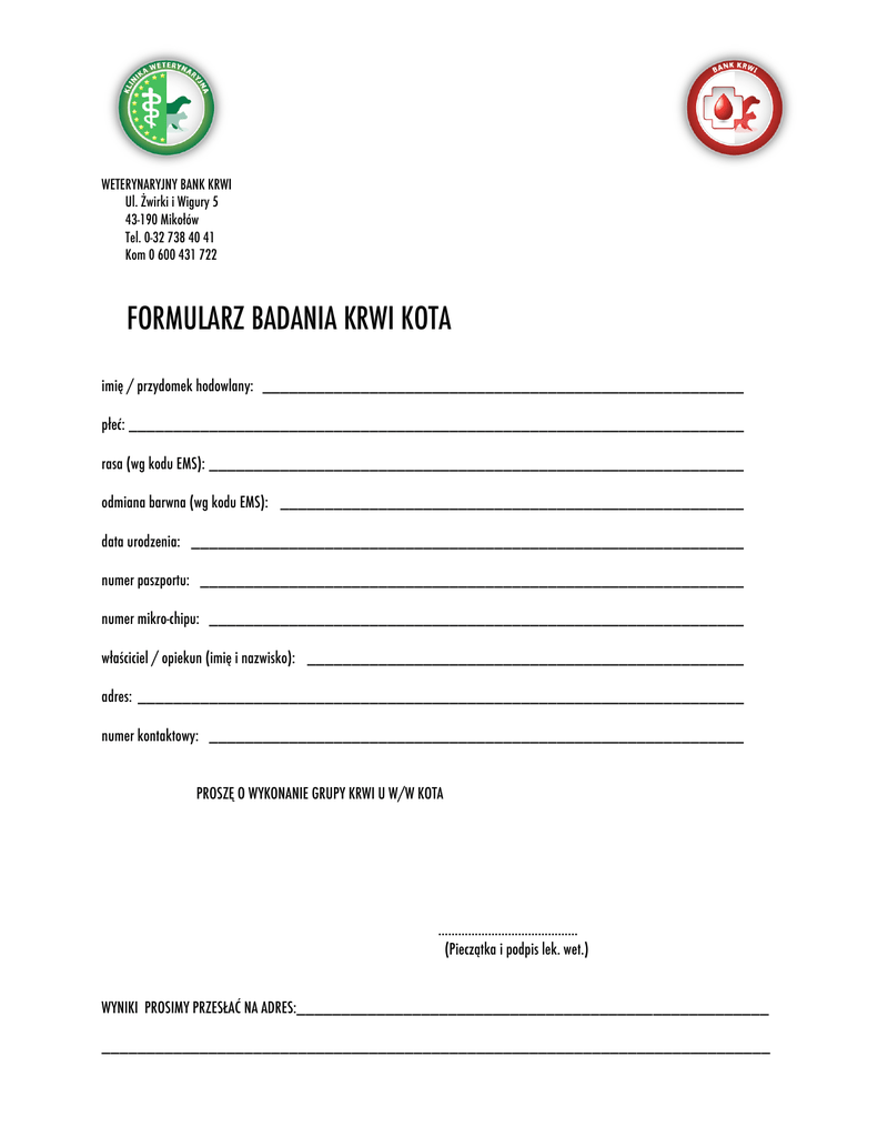 formularz badania krwi kota