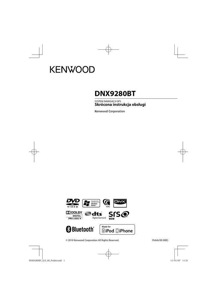 DNX9280BT SYSTEM NAWIGACJI GPS Skrócona instrukcja obsługi © 2010 Kenwood Corporation All Rights Reserved. DNX9280BT_Q-E_00_Polish.indd 1 Polish/00 (KEE) 11/01/07 11:31 Spis treści Informacje o skróconej instrukcji obsługi .. 2 Środki ostrożności ............................................... 3 Środki ostrożności dotyczące bezpieczeństwa oraz ważna informacja.. 4 Jak zacząć ............................................................... 6 Podstawy obsługi ................................................ 8 Zdejmowanie panelu monitora ...................10 Sposób odtwarzania nośników....................11 Sposób odtwarzania nośników....................12 Operacje na ekranie odtwarzania źródeł wizualnych........................................................14 Słuchanie radia ...................................................15 Informacje o skróconej instrukcji obsługi Niniejsza skrócona instrukcja obsługi wyjaśnia podstawowe funkcje urządzenia. Funkcje nieopisane w tej skróconej instrukcji znajdują się w instrukcji obsługi (plik PDF), która znajduje się na załączonej płycie CD-ROM „Instrukcja obsługi”. Aby przeczytać instrukcję obsługi na płycie CD-ROM, potrzebny jest komputer z systemem Microsoft® Windows XP/Vista/7 lub Mac OS X® 10.4 lub nowszym oraz programem Adobe® Reader™ 7.1, Adobe® Acrobat® 7.1 lub nowszym. Instrukcja obsługi może zostać zmieniona z powodu modyfikacji urządzenia. Możesz ściągnąć ostatnią wersję instrukcji obsługi z manual.kenwood.com/edition/im332/. Wykonywanie połączeń z zestawem słuchawkowym ...............................................16 System nawigacyjny.........................................18 Podstawy obsługi pilota .................................20 Wyposażenie .......................................................22 Procedura instalacji ..........................................22 Podłączenie .........................................................24 Podłączanie przewodów do terminali .......26 Podłączenie systemu........................................27 Podłączenie opcjonalnego wyposażenia ..28 Instalacja anteny GPS .....................................29 Instalacja przełącznika rozmowy i mikrofonu .........................................................29 Instalacja systemu multimedialnego .........30 Demontaż systemu multimedialnego .......31 2 | Skrócona instrukcja obsługi DNX9280BT_Q-E_00_Polish.indd 2 11/01/07 11:31 Środki ostrożności 2 OSTRZEŻENIE Aby zapobiec zranieniom czy zagrożeniu pożarem, należy stosować następujące środki ostrożności: • Nie patrz na ekran urządzenia przez dłuższy czas podczas prowadzenia pojazdu. • Aby nie dopuścić do zwarć, nigdy nie wkładaj ani nie wrzucaj do środka urządzenia żadnych przedmiotów metalowych (np. monet czy narzędzi metalowych). • Mocowanie i podłączenie przewodów produktu wymaga umiejętności i doświadczenia. Ze względów bezpieczeństwa, należy powierzyć te prace profesjonalistom. Środki ostrożności dotyczące korzystania z tego urządzenia • W przypadku napotkania trudności podczas instalacji, zasięgnij porady u dealera firmy Kenwood. • Kupując opcjonalne akcesoria, należy upewnić się u swojego sprzedawcy Kenwood, czy będzie działać z danym modelem i na danym obszarze. • Wybierz język wyświetlania menu, tagów plików audio, itd. Patrz <Ustawienie języka> (strona 6). • Funkcja Radio Data System nie będzie działać, jeśli żadna z lokalnych stacji radiowych nie nadaje w tym standardzie. Ochrona monitora Aby nie uszkodzić monitora, nie należy dotykać go długopisem lub podobnym przedmiotem z ostrym końcem. Zaparowanie soczewek Po włączeniu ogrzewania w samochodzie w zimnej temperaturze, na soczewce odtwarzacza urządzenia może zbierać się para. Jest to tak zwane zaparowanie soczewki, a skroplona woda na soczewce może uniemożliwiać odtwarzanie płyt. W takim przypadku należy wyjąć płytę i poczekać, aż skondensowana woda wyparuje. Jeśli DNX9280BT_Q-E_00_Polish.indd 3 urządzenie nadal działa nieprawidłowo, skontaktuj się ze sprzedawcą sprzętu Kenwood. Czyszczenie urządzenia Jeśli panel czołowy jest brudny, należy go wytrzeć suchą miękką ściereczką. Jeśli panel czołowy jest bardzo zabrudzony, należy wytrzeć zabrudzenie ściereczką nawilżoną w łagodnym detergencie, a następnie wytrzeć go ponownie suchą i miękką ściereczką. • Bezpośrednie spryskiwanie urządzenia środkiem czyszczącym, może uszkodzić części mechaniczne. Wycieranie panelu czołowego szorstką ściereczką, albo stosowanie lotnego płynu, takiego jak rozpuszczalnik czy alkohol, może uszkodzić powierzchnię lub zetrzeć napisy. Jak zresetować urządzenie Jeśli urządzenie lub podłączone urządzenie nie pracuje poprawnie, naciśnij przycisk Reset. Wszystkie ustawienia urządzenia zostaną przywrócone do wartości domyślnych po naciśnięciu przycisku Reset. Przycisk Reset • Należy wyjmować urządzenia USB przed naciśnięciem przycisku Reset. Dane w urządzeniu USB mogą zostać uszkodzone, gdy jest ono podłączone podczas naciskania przycisku Reset. Informacje na temat sposobu usuwania urządzenia USB można znaleźć w części<Sposób odtwarzania nośników> (strona 11). • Jeśli urządzenie zostanie włączone po wciśnięciu przycisku Reset, wyświetlony zostanie ekran konfiguracji wstępnej. Patrz część <Wstępna konfiguracja> (strona 6). Polski | 3 11/01/07 11:31 Środki ostrożności dotyczące bezpieczeństwa oraz ważna informacja Przeczytaj tą informację uważnie, zanim zaczniesz korzystać z systemu nawigacji samochodowej Kenwood postępuj zgodnie z instrukcjami zawartymi w tym podręczniku. Ani Kenwood ani Garmin nie powinni ponosić odpowiedzialności za problemy lub wypadki wynikające z niezapoznania się z instrukcjami zawartymi w tym podręczniku. 2OSTRZEŻENIA Nieunikanie następujących po