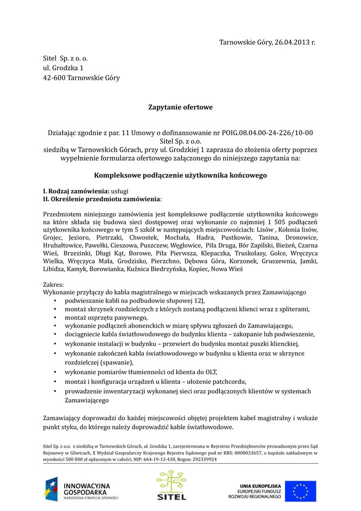 Tarnowskie Góry, 26.04.2013 r. Sitel Sp. z o. o. ul. Grodzka 1 42