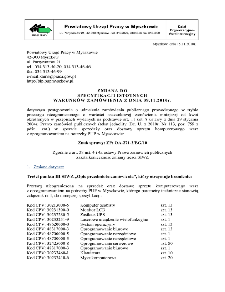 Zmiana SIWZ - Kontakt do urzędu pracy