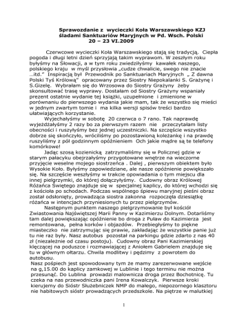 Sprawozdanie z wycieczki Koła Warszawskiego KZJ śladami Sanktuariów Maryjnych w Pd. Wsch. Polski 20 – 23 VI.2009 Czerwcowe wycieczki Koła Warszawskiego stają się tradycją. Ciepła pogoda i długi letni dzień sprzyjają takim wyprawom. W zeszłym roku byłyśmy na Słowacji, a w tym roku zwiedziłyśmy kawałek naszego, polskiego kraju w myśl przysłowia „cudze chwalicie, swego nie znacie …itd.” Inspiracją był Przewodnik po Sanktuariach Maryjnych „ Z dawna Polski Tyś Królową” opracowany przez Siostry Niepokalanki S. Grażynę i S.Gizelę. Wybrałam się do Wrzosowa do Siostry Grażyny żeby skonsultować trasę wyprawy. Dostałam od Siostry Grażyny wspaniały prezent ostatnie wydanie tej książki, uzupełnione i zmienione w porównaniu do pierwszego wydania jakie mam, tak że wszystko się mieści w jednym zwartym tomie i ma kilka wersji spisów treści bardzo ułatwiających korzystanie. Wyjechałyśmy w sobotę 20 czerwca o 7 rano. Tak naprawdę wyjeżdżałyśmy 2 razy bo za pierwszym razem nie przeczytałam listy obecności i ruszyłyśmy bez jednej uczestniczki. Na szczęście wszystko dobrze się skończyło, wróciliśmy po pozostawioną koleżankę i na prawdę ruszyliśmy z pół godzinnym opóźnieniem Och jakie mądre są te telefony komórkowe! Jadąc szosą kozienicką zatrzymaliśmy się w Policznej gdzie w starym pałacyku obejrzałyśmy przygotowane wnętrze na wieczorne przyjęcie weselne mojego siostrzeńca . Dalej , pierwszym obiektem było Wysokie Koło. Byłyśmy zapowiedziane, ale nasze opóźnienie powiększało się. Na szczęście weszłyśmy w trakcie opowiadania o tym miejscu dla innej pielgrzymki, do której dołączyłyśmy. Cudowny obraz Królowej Różańca Świętego znajduje się w specjalnej kaplicy, do której wchodzi się z kościoła po schodach. Podczas wspólnego śpiewu maryjnej pieśni obraz został odsłonięty, prowadząca siostra zakonna rozpoczęła dziesiątkę różańca w intencjach przyniesionych tu przez pielgrzymów. Następnym punktem naszego pielgrzymowanie był kościół Zwiastowania Najświętszej Marii Panny w Kazimierzu Dolnym. Dotarliśmy tam dalej powiększając opóźnienie bo droga z Puław do Kazimierza jest remontowana, pełna korków i objazdów. Przebiegłyśmy to piękne miasteczko nie zatrzymując się prawie, zakładając że wszystkie panie już tu nie raz były. Nasz autobus pozostał na parkingu gdzie zdarto z nas 40 zł (niezależnie od czasu postoju). Cudowny obraz Pani Kazimierskiej klęczącej na poduszce i rozmawiającej z Aniołem Gabrielem znajduje się tu w głównym ołtarzu. Chwila modlitwy i pędzimy z powrotem do autobusu. Nasz pośpiech jest spowodowany tym że mamy zarezerwowane wejście na g,15.00 do kaplicy zamkowej w Lublinie i tego terminu nie można przesunąć. Do Lublina prowadzi malownicza droga przez Bochotnicę. Tu czeka na nas przewodniczka pani Irena Kowalczyk. Pierwsze kroki kierujemy do Sióstr Służebniczek NMP do małego, niepozornego klasztoru nie habitowych sióstr prowadzących przedszkole. Na piętrze w malutkiej 1 wewnętrznej kaplicy w głównym ołtarzu znajduje się cudowny obraz Matki Bożej Latyczowskiej, pokryty srebrnymi sukniami i złotymi koronami. Jedna z sióstr wprowadza nas w historię wędrówki obrazu , po czym uruchamia magnetofon i słyszymy piękną opowieść o losach wizerunku NMP z dzieciątkiem. Modlimy się słowami modlitwy do Matki Bożej Latyczowskiej „Matko i Pani nasza Latyczowska, już od stuleci przychodzą ludzie przed Twoje oblicze. Przychodzą z bólem swego serca i odchodzą pocieszeni……Proszę Cię Maryjo , o mocną wiarę, nadzieję i miłość .Miej w swojej opiece moją rodzinę, parafię i cały kościół. Maryjo wyrwij z mego serca wątpliwości nienawiść, a wlej pokój i miłość…….” Mamy szczęście bo znajdujemy się u stóp oryginalnego obrazu. Po upadku komunizmu do Latyczowa na Ukrainę powędrowała jego kopia, inną kopię bez srebrnych okryć oglądamy w sąsiedniej salce przedszkolnej. Stąd mamy blisko na Krakowskie Przedmieście gdzie na ścianie dawnego domu rodziców bł. Siostry Marty Wołowskiej a obecnie banku znajduje się tablica pamiątkowa ku Jej czci. Następny punkt programu to zamek lubelski, w którym znajduje się obecnie muzeum. Dawniej , podczas wojny było tu ciężkie więzienie niemieckie a po wojnie w PRL okrutne więzienie nazwane kaźnią NKWD i UB. Zatrzymałyśmy się na dziedzińcu zamku z widokiem na starą basztę i pani Irena opowiedziała nam historię tego miejsca. O 15.00 mamy zarezerwowane wejście do niezwykle cennej kaplicy. Przechodzimy przez sale muzealne gdzie akurat trwają prace nad zmianą wystawy. Oglądamy tylko starodawny stół przy którym podpisywano traktat lubelski. Kościół Trójcy Świętej nazywany Kaplicą Zamkową jest jednym z najcenniejszych i najciekawszych zabytków sztuki średniowiecznej w Polsce i w Europie. Jest to miejsce, w którym spotkała się i współistnieje kultura Wschodu i Zachodu. We wnętrzu tej gotyckiej świątyni w 1418 roku wykonano bezcenne malowidła bizantyńsko-ruskie. Robi niezapomniane wrażenie. Jest pod pieczołowitą opieką konserwatorów. Udostępnia się grupom zwiedzających o pełnych godzinach , a po wyjściu osób zamyka się ją na pół godziny w celu utrzymania warunków klimatycznych. W przedsionku gdzie oczekuje się na wejście można obejrzeć i sfotografować reprodukcje fresków kaplicy. Widzimy rysunki przedstawiające postać króla Władysława Jagiełły wykonane przez współczesnego mu artystę, kto wie może właśnie tak wyglądał. Pobyt w Lublinie kończymy w Archikatedrze św. Jana Chrzciciela i św, Jana Ewangelisty. Podjeżdżamy w pobliże katedry autobusem i stajemy na małym ciasnym parkingu płatnym. W odróżnieniu od ceny parkowania w pobliskim Kazimierzu tu pół godziny pobytu kosztuje 1,50 zł. Cieszy nas ta różnica bardzo. Tym czasem w kościele akurat kończy 