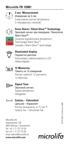 Microlife FR 1DM1 3 sec. Measurement Измерение за 3 сек. 3-sekundowy pomiar temperatury 3 másodperces mérésidő Fever Alarm / Silent GlowTM Technology Звуковой сигнал при лихорадке / Технология Silent GlowTM Gorączka sygnalizowana dźwiękowo / Technologia Silent GlowTM Lázriadó / Silent GlowTM technológia Illuminated display Подсветка дисплея Wyświetlacz ciekłokrystaliczny LCD Háttérvilágítás 12 Memories Память на 12 измерений Pamięć ostatnich 12 pomiarów 12 Memória Signal Tone Звуковой сигнал Sygnał dźwiękowy Hangjelzés Цельсий – Фаренгейт Pomiar temperatury w °C lub °F Celsius fok – Fahrenheit fok Microlife AG Espenstrasse 139 9443 Widnau / Switzerland Tel. +41 / 71 727 70 30 Fax +41 / 71 727 70 39 Email [email protected] www.microlife.com IB FR IDM1-S VarB-scan 0808 Celsius – Fahrenheit Microlife FR 1DM1 EN Forehead Thermometer Instruction Manual (1-12) RU Цифровой инфракрасный термометр для измерения температуры тела в области лба Руководство пользователя (13-24) PL Elektroniczny termometr do pomiaru Temperatury na czole Instrukcja używania (25-36) HU Homloklázmérő Használati útmutató (37-48) Forehead Thermometer Instruction Manual Please read these instructions carefully before using the instrument and keep them in a safe place. The Microlife Forehead Thermometer is a high quality product incorporating the latest technology and tested in accordance with international standards. With its unique technology, the Microlife Forehead Thermometer can provide a stable, heat-interferencefree reading with each measurement. The instrument performs a self-test every time it is switched on to always guarantee the specified accuracy of measurements. The Microlife Forehead Thermometer allows a simple and quick measurement of the body temperature. Please keep in mind that, - like any skin temperature -, the temperature at the temporal area might differ from the core body temperature (e.g. obtained by a rectal probe), which is due to a basic physiologic effect called vasoconstriction. Since vasoconstriction can occur in the early stages of fever, resulting in a cool skin effect, the recorded temperature using a forehead thermometer may be suspiciously low. Skin temperature of babies reacts very quickly on ambient temperature. Therefore do not take a measurement while or after nursing; skin temperature may be lower than core temperature. If the measurement result is not consistent with the patient's finding, always double check the result by another core body temperature measurement, e.g. use an IR – eardrum thermometer or a rectal pen-type thermometer. Batteries and electronic instruments must be disposed of inaccordance with the locally applicable regulations, not with domestic waste. 1 Table of Contents 1. The Advantages of your Thermometer 2. Important Safety Instructions 3. Product Description 4. How the Thermometer Measures Body Temperature 5. Control Displays and Symbols 6. Directions for Use 7. Changing from Fahrenheit to Celsius and vice-versa 8. Error Messages 9. How to Recall 12 Readings in Memory Mode 10. Cleaning and Storage 11. Replacing the Battery 12. Guarantee 13. Technical Specifications 14. www.microlife.com 2 1. The Advantages of your Thermometer Measurement in 3 seconds The innovative infrared technology allows measurement simply by scanning the eyebrow area. After a scanning time of 3 seconds the measurement will be displayed on the LCD. Accurate and reliable Due to the unique probe assembly construction, incorporating an advanced infrared sensor this device can offer a temperature measurement comparable to one taken from the oral site with a regular digital thermometer. Gentle and Easy to Use • Appealing Penguin style delights the children. • No need Probe Covers at all, which makes the thermometer simple and easy to use. • The thermometer can be used without interference to daily lifestyle. A measurement can be taken even while a child is sleeping. • The thermometer is less threatening to a child than a rectal thermometer and more pleasant to use than an oral thermometer. Auto-Display Memory The last reading is automatically displayed for 3 seconds when the unit is switched ON. Multiple Reading Recalls Users will be able to recall the last 12 readings when entering the recall mode, enabling efficient tracking of temperature variations. Safe and Hygienic • No risk of broken glass or mercury ingestion. • Completely safe for use on children. High Temperature Indication 10 short beeps and a red LCD backlight alert the patient that he/she may have a temperature above 37.5 °C. 3 2. Important Safety Instructions • • • • • Never use the thermometer for purposes other than those it has been intended for. Please follow the general safety precautions when using on children. Never immerse the thermometer into water or other liquids (not waterproof). For cleaning, please follow the instructions in the «Cleaning and Storage» section. Keep the instrument away from direct exposure to the sun and keep it in a dust-free, dry area at the temperature between 16 - 40 °C (60.8 - 104 °F). Do not use the thermometer if there are signs of damage on the measuring tip or on the instrument itself. If damaged, do not attempt to repair the instrument! Please contact your nearest Microlife customer service bureau. This thermometer consists of high-quality precision parts. Do not drop the instrument! Protect it from severe impact and shock. Do not twist the instrument and the measuring probe! WARNING: • Use of this thermometer is not intended as a substitute for consultation with your physician. • Thermometer is not waterproof! Please NEVER immerse into liquids! 3. Product Description (1) Probe 1 (2) START button 2 (3) LCD Display 3 (4) O/