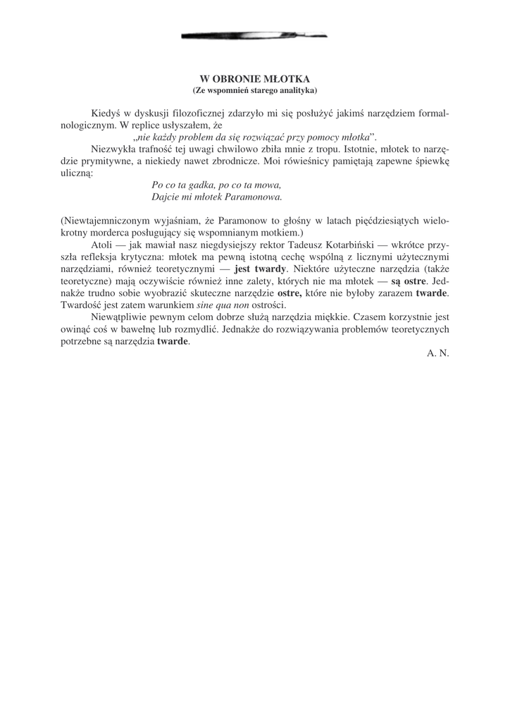 W OBRONIE MŁOTKA (Ze wspomnie starego analityka) Kiedy w dyskusji filozoficznej zdarzyło mi si posłu y jakim narz dziem formalnologicznym. W replice usłyszałem, e „nie ka dy problem da si rozwi za przy pomocy młotka”. Niezwykła trafno tej uwagi chwilowo zbiła mnie z tropu. Istotnie, młotek to narz dzie prymitywne, a niekiedy nawet zbrodnicze. Moi rówie nicy pami taj zapewne piewk uliczn : Po co ta gadka, po co ta mowa, Dajcie mi młotek Paramonowa. (Niewtajemniczonym wyja niam, e Paramonow to gło ny w latach pi dziesi tych wielokrotny morderca posługuj cy si wspomnianym motkiem.) Atoli — jak mawiał nasz niegdysiejszy rektor Tadeusz Kotarbi ski — wkrótce przyszła refleksja krytyczna: młotek ma pewn istotn cech wspóln z licznymi u ytecznymi narz dziami, równie teoretycznymi — jest twardy. Niektóre u yteczne narz dzia (tak e teoretyczne) maj oczywi cie równie inne zalety, których nie ma młotek — s ostre. Jednak e trudno sobie wyobrazi skuteczne narz dzie ostre, które nie byłoby zarazem twarde. Twardo jest zatem warunkiem sine qua non ostro ci. Niew tpliwie pewnym celom dobrze słu narz dzia mi kkie. Czasem korzystnie jest owin co w bawełn lub rozmydli . Jednak e do rozwi zywania problemów teoretycznych potrzebne s narz dzia twarde. A. N.