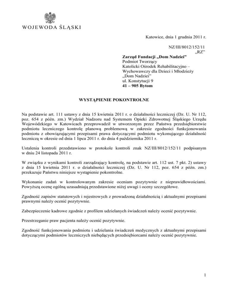 WO J E WO D A Ś LĄ S KI Katowice, dnia 1 grudnia 2011 r. NZ/III/8012/152/11 „RZ” Zarząd Fundacji „Dom Nadziei” Podmiot Tworzący Katolicki Ośrodek Rehabilitacyjno – Wychowawczy dla Dzieci i MłodzieŜy „Dom Nadziei” ul. Konstytucji 9 41 – 905 Bytom WYSTĄPIENIE POKONTROLNE Na podstawie art. 111 ustawy z dnia 15 kwietnia 2011 r. o działalności leczniczej (Dz. U. Nr 112, poz. 654 z późn. zm.) Wydział Nadzoru nad Systemem Opieki Zdrowotnej Śląskiego Urzędu Wojewódzkiego w Katowicach przeprowadził w utworzonym przez Państwa przedsiębiorstwie podmiotu leczniczego kontrolę planową problemową w zakresie zgodności funkcjonowania podmiotu z obowiązującymi przepisami prawa dotyczącymi podmiotu wykonującego działalność leczniczą w okresie od dnia 1 lipca 2011 r. do dnia 4 października 2011 r. Ustalenia kontroli przedstawiono w protokole kontroli znak NZ/III/8012/152/11 podpisanym w dniu 24 listopada 2011 r. W związku z wynikami kontroli zarządzający kontrolę, na podstawie art. 112 ust. 7 pkt. 2) ustawy z dnia 15 kwietnia 2011 r. o działalności leczniczej (Dz. U. Nr 112, poz. 654 z późn. zm.) przekazuje Państwu niniejsze wystąpienie pokontrolne. Wykonanie zadań w kontrolowanym zakresie oceniam pozytywnie z nieprawidłowościami. PowyŜszą ocenę ogólną uzasadniają przedstawione niŜej uwagi i oceny szczegółowe. Zgodność zapisów statutowych i rejestrowych z prowadzoną działalnością i aktualnymi przepisami prawnymi naleŜy ocenić pozytywnie. Zabezpieczenie kadrowe zgodnie z profilem udzielanych świadczeń naleŜy ocenić pozytywnie. Przestrzeganie praw pacjenta naleŜy ocenić pozytywnie. Zgodność funkcjonowania podmiotu i udzielania świadczeń medycznych z aktualnymi przepisami dotyczącymi podmiotów leczniczych niebędących przedsiębiorcami naleŜy ocenić pozytywnie. 1 Prowadzenie dokumentacji z nieprawidłowościami. organizacyjnej podmiotu naleŜy ocenić pozytywnie W trakcie kontroli ustalono, Ŝe w dokumentacji wskazanej na stronie 8 akapity od 6 do 9 protokołu kontroli brak było potwierdzenia spełniania wymagań zdrowotnych określonych w innych przepisach. PowyŜsze dotyczy dokumentów współpracy z Barbarą Poloczek, Ireneuszem Jelonkiem, Dagmarą Nowak i Joanną Basiuk – Król. PowyŜsza nieprawidłowość stanowiła naruszenie art. 17 ust. 1 pkt. 3) ustawy z dnia 15 kwietnia 2011 r. (Dz. U. Nr 112, poz. 654 z późn. zm.). Za powyŜszą nieprawidłowość odpowiadał Zarząd Fundacji „Dom Nadziei” z siedzibą w Bytomiu przy ul. Konstytucji 9 w składzie ElŜbieta Łobejko – Członek Zarządu Prezes, Michał Jurkiewicz – Wiceprezes Fundacji i Ewa Tkocz – Członek Zarządu Sekretarz. Usunięcie nieprawidłowości powodujących naruszenie zapisów art. 17 ust. 1 pkt. 3) ustawy z dnia 15 kwietnia 2011 r. (Dz. U. Nr 112, poz. 654 z późn. zm.) nastąpiło poprzez przedłoŜenie w dniu 24 listopada 2011 r. (dzień podpisania protokołu kontroli) dokumentów potwierdzających spełnianie wymagań zdrowotnych wymaganych w innych przepisach przez osoby wskazane na stronie 8 akapity od 6 do 9 protokołu kontroli, które w przedmiotowym podmiocie udzielają świadczeń na innej podstawie niŜ umowa o pracę. Kopie dokumentów włączono do akt sprawy (akta kontroli str. 34 – 35). W trakcie kontroli stwierdzono, Ŝe przedstawiony regulamin organizacyjny podmiotu nie zawierał określenia organizacji procesu udzielania świadczeń zdrowotnych w przypadku pobierania opłat. PowyŜsza nieprawidłowość stanowiła naruszenie zapisów art. 24 ust. 1 pkt. 10) ustawy z dnia 15 kwietnia 2011 r. o działalności leczniczej (Dz. U. Nr 112, poz. 654 z późn. zm.). Przestawiony regulamin nie zawierał takŜe określenia wysokości opłat za przechowywanie zwłok pacjenta przez okres dłuŜszy niŜ 72 godziny od osób lub instytucji uprawnionych do przechowywania zwłok na podstawie ustawy z dnia 31 stycznia 1959 r. o cmentarzach i chowaniu zmarłych (Dz. U. Nr 23, poz. 295 z późn. zm.) oraz od podmiotów, na zlecenie których przechowuje się zwłoki w związku z toczącym się postępowaniem karnym. PowyŜsza nieprawidłowość stanowiła naruszenie zapisów art. 24 ust. 1 pkt. 11) ustawy z dnia 15 kwietnia 2011 r. o działalności leczniczej (Dz. U. Nr 112, poz. 654 z późn. zm.). Ponadto regulamin nie zawierał określenia wysokości opłat za udzielanie świadczeń zdrowotnych innych niŜ finansowane ze środków publicznych. PowyŜsza nieprawidłowość stanowiła naruszenie zapisów art. 24 ust. 1 pkt. 12) ustawy z dnia 15 kwietnia 2011 r. o działalności leczniczej (Dz. U. Nr 112, poz. 654 z późn. zm.). Za powyŜsze nieprawidłowości odpowiedzialny był Zarząd Fundacji „Dom Nadziei” z siedzibą w Bytomiu przy ul. Konstytucji 9 w składzie ElŜbieta Łobejko – Członek Zarządu Prezes, Michał Jurkiewicz – Wiceprezes Fundacji i Ewa Tkocz – Członek Zarządu Sekretarz. 2 Usunięcie nieprawidłowości powodującej naruszenie art. 24 ust. 1 pkt. 10) do pkt. 12) ustawy z dnia 15 kwietnia 2011 r. (Dz. U. Nr 112, poz. 654 z późn. zm.) nastąpiło poprzez sporządzenie regulaminu organizacyjnego uzupełnionego o określenie organizacji procesu udzielania świadczeń zdrowotnych w przypadku pobierania opłat, określenie wysokości opłat za przechowywanie zwłok pacjenta przez okres dłuŜszy niŜ 72 godziny od osób lub instytucji uprawnionych do przechowywania zwłok oraz określenie wysokości opłat za udzielanie świadczeń zdrowotnych innych niŜ finansowane ze środków publicznych. Egzemplarz regulaminu organizacyjnego złoŜono w dniu 29 listopada 2011 r. w organie kontroli. Egzemplarz dołączono do akt sprawy (akta kontroli str. 36 – 59). Wobec powyŜszego zaleceń pokontrolnych nie wydaje się. z up. WOJEWODY ŚLĄSKIEGO (-) Ireneusz Ryszkiel Dyrektor Wydziału Nadzoru nad Systemem Opieki Zdrowotnej …............................................................................ (Podpi