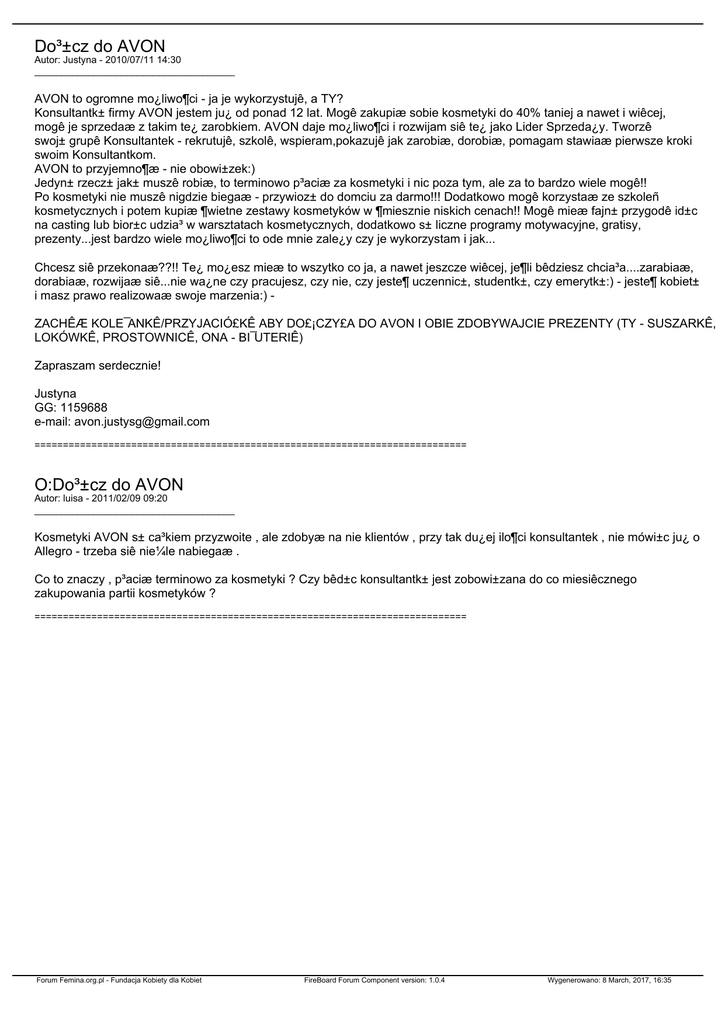Do³±cz do AVON Autor: Justyna - 2010/07/11 14:30 _____________________________________ AVON to ogromne mo¿liwo¶ci - ja je wykorzystujê, a TY? Konsultantk± firmy AVON jestem ju¿ od ponad 12 lat. Mogê zakupiæ sobie kosmetyki do 40% taniej a nawet i wiêcej, mogê je sprzedaæ z takim te¿ zarobkiem. AVON daje mo¿liwo¶ci i rozwijam siê te¿ jako Lider Sprzeda¿y. Tworzê swoj± grupê Konsultantek - rekrutujê, szkolê, wspieram,pokazujê jak zarobiæ, dorobiæ, pomagam stawiaæ pierwsze kroki swoim Konsultantkom. AVON to przyjemno¶æ - nie obowi±zek:) Jedyn± rzecz± jak± muszê robiæ, to terminowo p³aciæ za kosmetyki i nic poza tym, ale za to bardzo wiele mogê!! Po kosmetyki nie muszê nigdzie biegaæ - przywioz± do domciu za darmo!!! Dodatkowo mogê korzystaæ ze szkoleñ kosmetycznych i potem kupiæ ¶wietne zestawy kosmetyków w ¶miesznie niskich cenach!! Mogê mieæ fajn± przygodê id±c na casting lub bior±c udzia³ w warsztatach kosmetycznych, dodatkowo s± liczne programy motywacyjne, gratisy, prezenty...jest bardzo wiele mo¿liwo¶ci to ode mnie zale¿y czy je wykorzystam i jak... Chcesz siê przekonaæ??!! Te¿ mo¿esz mieæ to wszytko co ja, a nawet jeszcze wiêcej, je¶li bêdziesz chcia³a....zarabiaæ, dorabiaæ, rozwijaæ siê...nie wa¿ne czy pracujesz, czy nie, czy jeste¶ uczennic±, studentk±, czy emerytk±:) - jeste¶ kobiet± i masz prawo realizowaæ swoje marzenia:) ZACHÊÆ KOLE¯ANKÊ/PRZYJACIÓ£KÊ ABY DO£¡CZY£A DO AVON I OBIE ZDOBYWAJCIE PREZENTY (TY - SUSZARKÊ, LOKÓWKÊ, PROSTOWNICÊ, ONA - BI¯UTERIÊ) Zapraszam serdecznie! Justyna GG: 1159688 e-mail: [email protected] ============================================================================ O:Do³±cz do AVON Autor: luisa - 2011/02/09 09:20 _____________________________________ Kosmetyki AVON s± ca³kiem przyzwoite , ale zdobyæ na nie klientów , przy tak du¿ej ilo¶ci konsultantek , nie mówi±c ju¿ o Allegro - trzeba siê nie¼le nabiegaæ . Co to znaczy , p³aciæ terminowo za kosmetyki ? Czy bêd±c konsultantk± jest zobowi±zana do co miesiêcznego zakupowania partii kosmetyków ? ============================================================================ Forum Femina.org.pl - Fundacja Kobiety dla Kobiet FireBoard Forum Component version: 1.0.4 Wygenerowano: 8 March, 2017, 16:35