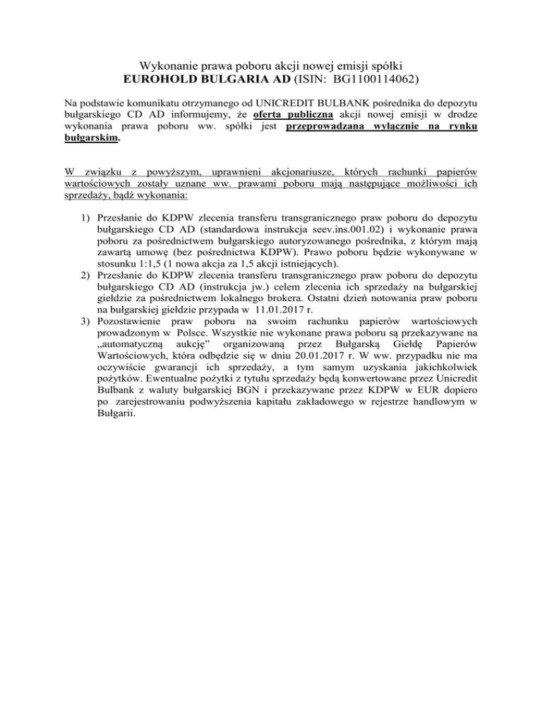 Wykonanie prawa poboru akcji nowej emisji spółki EUROHOLD BULGARIA AD (ISIN: BG1100114062) Na podstawie komunikatu otrzymanego od UNICREDIT BULBANK pośrednika do depozytu bułgarskiego CD AD informujemy, że oferta publiczna akcji nowej emisji w drodze wykonania prawa poboru ww. spółki jest przeprowadzana wyłącznie na rynku bułgarskim. W związku z powyższym, uprawnieni akcjonariusze, których rachunki papierów wartościowych zostały uznane ww. prawami poboru mają następujące możliwości ich sprzedaży, bądź wykonania: 1) Przesłanie do KDPW zlecenia transferu transgranicznego praw poboru do depozytu bułgarskiego CD AD (standardowa instrukcja seev.ins.001.02) i wykonanie prawa poboru za pośrednictwem bułgarskiego autoryzowanego pośrednika, z którym mają zawartą umowę (bez pośrednictwa KDPW). Prawo poboru będzie wykonywane w stosunku 1:1,5 (1 nowa akcja za 1,5 akcji istniejących). 2) Przesłanie do KDPW zlecenia transferu transgranicznego praw poboru do depozytu bułgarskiego CD AD (instrukcja jw.) celem zlecenia ich sprzedaży na bułgarskiej giełdzie za pośrednictwem lokalnego brokera. Ostatni dzień notowania praw poboru na bułgarskiej giełdzie przypada w 11.01.2017 r. 3) Pozostawienie praw poboru na swoim rachunku papierów wartościowych prowadzonym w Polsce. Wszystkie nie wykonane prawa poboru są przekazywane na „automatyczną aukcję” organizowaną przez Bułgarską Giełdę Papierów Wartościowych, która odbędzie się w dniu 20.01.2017 r. W ww. przypadku nie ma oczywiście gwarancji ich sprzedaży, a tym samym uzyskania jakichkolwiek pożytków. Ewentualne pożytki z tytułu sprzedaży będą konwertowane przez Unicredit Bulbank z waluty bułgarskiej BGN i przekazywane przez KDPW w EUR dopiero po zarejestrowaniu podwyższenia kapitału zakładowego w rejestrze handlowym w Bułgarii.