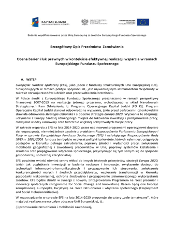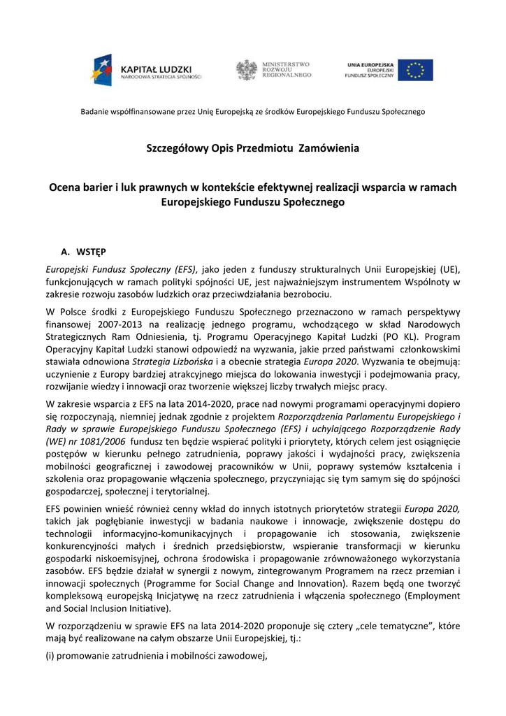 Badanie współfinansowane przez Unię Europejską ze środków Europejskiego Funduszu Społecznego Szczegółowy Opis Przedmiotu Zamówienia Ocena barier i luk prawnych w kontekście efektywnej realizacji wsparcia w ramach Europejskiego Funduszu Społecznego A. WSTĘP Europejski Fundusz Społeczny (EFS), jako jeden z funduszy strukturalnych Unii Europejskiej (UE), funkcjonujących w ramach polityki spójności UE, jest najważniejszym instrumentem Wspólnoty w zakresie rozwoju zasobów ludzkich oraz przeciwdziałania bezrobociu. W Polsce środki z Europejskiego Funduszu Społecznego przeznaczono w ramach perspektywy finansowej 2007-2013 na realizację jednego programu, wchodzącego w skład Narodowych Strategicznych Ram Odniesienia, tj. Programu Operacyjnego Kapitał Ludzki (PO KL). Program Operacyjny Kapitał Ludzki stanowi odpowiedź na wyzwania, jakie przed państwami członkowskimi stawiała odnowiona Strategia Lizbońska i a obecnie strategia Europa 2020. Wyzwania te obejmują: uczynienie z Europy bardziej atrakcyjnego miejsca do lokowania inwestycji i podejmowania pracy, rozwijanie wiedzy i innowacji oraz tworzenie większej liczby trwałych miejsc pracy. W zakresie wsparcia z EFS na lata 2014-2020, prace nad nowymi programami operacyjnymi dopiero się rozpoczynają, niemniej jednak zgodnie z projektem Rozporządzenia Parlamentu Europejskiego i Rady w sprawie Europejskiego Funduszu Społecznego (EFS) i uchylającego Rozporządzenie Rady (WE) nr 1081/2006 fundusz ten będzie wspierać polityki i priorytety, których celem jest osiągnięcie postępów w kierunku pełnego zatrudnienia, poprawy jakości i wydajności pracy, zwiększenia mobilności geograficznej i zawodowej pracowników w Unii, poprawy systemów kształcenia i szkolenia oraz propagowanie włączenia społecznego, przyczyniając się tym samym się do spójności gospodarczej, społecznej i terytorialnej. EFS powinien wnieść również cenny wkład do innych istotnych priorytetów strategii Europa 2020, takich jak pogłębianie inwestycji w badania naukowe i innowacje, zwiększenie dostępu do technologii informacyjno-komunikacyjnych i propagowanie ich stosowania, zwiększenie konkurencyjności małych i średnich przedsiębiorstw, wspieranie transformacji w kierunku gospodarki niskoemisyjnej, ochrona środowiska i propagowanie zrównoważonego wykorzystania zasobów. EFS będzie działał w synergii z nowym, zintegrowanym Programem na rzecz przemian i innowacji społecznych (Programme for Social Change and Innovation). Razem będą one tworzyć kompleksową europejską Inicjatywę na rzecz zatrudnienia i włączenia społecznego (Employment and Social Inclusion Initiative). W rozporządzeniu w sprawie EFS na lata 2014-2020 proponuje się cztery „cele tematyczne”, które mają być realizowane na całym obszarze Unii Europejskiej, tj.: (i) promowanie zatrudnienia i mobilności zawodowej, (ii) inwestowanie w edukację, umiejętności i uczenie się przez całe życie, (iii) promowanie włączenia społecznego i walka z ubóstwem, (iv) wzmacnianie potencjału instytucjonalnego i skuteczności administracji publicznej. W odniesieniu do wyżej wymienionych celów, EFS wspierać będzie konkretne priorytety inwestycyjne, wymienione w ww. Rozporządzeniu. B. KONTEKST BADANIA Jak pokazuje doświadczenie ostatnich kilku lat wdrażania Europejskiego Funduszu Społecznego, a także wyniki niektórych badań ewaluacyjnych1, pomimo skuteczności proponowanych form wsparcia, wysokiej oceny ich użyteczności czy trafności, efekty realizacji działań finansowanych z EFS są ograniczane m.in. przez istniejące bariery lub luki prawne. Przykłady takich ograniczeń zawarto poniżej. Jednym z istniejących problemów jest sytuacja osób w wieku 50+. Jak pokazują wyniki badania2 ponad dwie trzecie (68 proc.) spośród wszystkich niepracujących uprzednio uczestników projektów w wieku 50+ uważa, że w wyniku projektu umie lepiej szukać pracy, a 81 proc. czuje się bardziej pewnymi siebie. Niemniej jednak, m.in. z powodu istniejących przepisów prawnych, zakazujących pracodawcy zwolnienia osób w wieku przedemerytalnym (na 4 lata przed osiągnięciem wieku uprawniającego do pobierania świadczeń emerytalnych), wskaźnik zatrudnienia osób w tej grupie wiekowej jest niższy w porównaniu z innymi osobami, gdyż pracodawcy niechętnie zatrudniają osoby będące blisko tej granicy wiekowej. Należy podkreślić, że zapis ten ma na celu ochronę praw pracowniczych osób 50+, ale jednocześnie, paradoksalnie niekiedy działa na niekorzyść tych osób, którym znacznie trudniej jest znaleźć nowe zatrudnienie, kiedy zbliżają się do granicy wieku emerytalnego. Inny przykład to prowadzenie przedszkoli oraz innych form wychowania przedszkolnego, które należy do zadań własnych gminy i finansowane jest z dochodów własnych samorządu terytorialnego. Samorządy gminne nie otrzymują jednak subwencji oświatowej na prowadzenie edukacji przedszkolnej, co stanowi istotną barierę dla zapewnienia trwałości ośrodków wychowania przedszkolnego, wspieranych z EFS, które po zakończeniu finansowania ze środków tego funduszu, powinny być przejmowane przez podmioty odpowiedzialne za ich prowadzenie na poziomie gminy. Kolejnym przykładem są przepisy Ustawy o promocji zatrudnienia i instytucjach rynku pracy, które nakazują pozbawienie statusu osoby bezrobotnej osoby podlegające obowiązkowi ubezpieczenia społecznego z tytułu skierowania na staż, szkolenie lub inną formę aktywizacji zawodowej przez podmiot inny niż powiatowy urząd pracy (art. 2 ust. 1 pkt 2 lit. l). A zatem nabycie prawa do ubezpieczenia w wyniku otrzymania stypendium stażowego lub szkoleniowego wypłaconego przez podmiot inny niż PUP skutkuje wykreśleniem tych osób z rejestru. Przyjęcie takiego rozwiązania prowadzi do spadku zainteresowania osób bezrobotnych poszukiwaniem dodatkowych form aktywizacji zawodowej – poza instrumentami rynku 