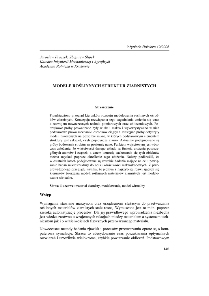 Praca zawiera przegląd i analizę najwaŜniejszych kierunków w modelowaniu roślinnych materiałów ziarnistych w celu wyłonienia koncepcji opisu struktury materiału najlepiej odzwierciedlającej stan rzeczywisty.
