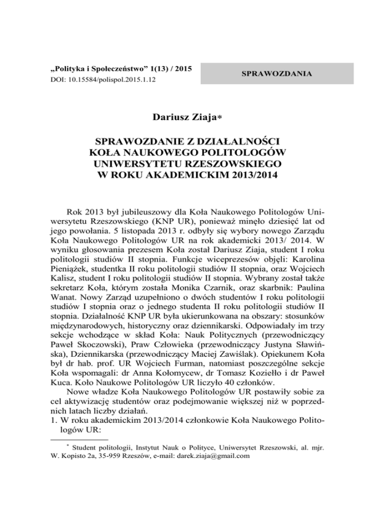 Sprawozdanie z działalności Koła Naukowego Politologów... „Polityka i Społeczeństwo” 1(13) / 2015 DOI: 10.15584/polispol.2015.1.12 139 SPRAWOZDANIA Dariusz Ziaja SPRAWOZDANIE Z DZIAŁALNOŚCI KOŁA NAUKOWEGO POLITOLOGÓW UNIWERSYTETU RZESZOWSKIEGO W ROKU AKADEMICKIM 2013/2014 Rok 2013 był jubileuszowy dla Koła Naukowego Politologów Uniwersytetu Rzeszowskiego (KNP UR), ponieważ minęło dziesięć lat od jego powołania. 5 listopada 2013 r. odbyły się wybory nowego Zarządu Koła Naukowego Politologów UR na rok akademicki 2013/ 2014. W wyniku głosowania prezesem Koła został Dariusz Ziaja, student I roku politologii studiów II stopnia. Funkcje wiceprezesów objęli: Karolina Pieniążek, studentka II roku politologii studiów II stopnia, oraz Wojciech Kalisz, student I roku politologii studiów II stopnia. Wybrany został także sekretarz Koła, którym została Monika Czarnik, oraz skarbnik: Paulina Wanat. Nowy Zarząd uzupełniono o dwóch studentów I roku politologii studiów I stopnia oraz o jednego studenta II roku politologii studiów II stopnia. Działalność KNP UR była ukierunkowana na obszary: stosunków międzynarodowych, historyczny oraz dziennikarski. Odpowiadały im trzy sekcje wchodzące w skład Koła: Nauk Politycznych (przewodniczący Paweł Skoczowski), Praw Człowieka (przewodniczący Justyna Sławińska), Dziennikarska (przewodniczący Maciej Zawiślak). Opiekunem Koła był dr hab. prof. UR Wojciech Furman, natomiast poszczególne sekcje Koła wspomagali: dr Anna Kołomycew, dr Tomasz Koziełło i dr Paweł Kuca. Koło Naukowe Politologów UR liczyło 40 członków. Nowe władze Koła Naukowego Politologów UR postawiły sobie za cel aktywizację studentów oraz podejmowanie większej niż w poprzednich latach liczby działań. 1. W roku akademickim 2013/2014 członkowie Koła Naukowego Politologów UR: Student politologii, Instytut Nauk o Polityce, Uniwersytet Rzeszowski, al. mjr. W. Kopisto 2a, 35-959 Rzeszów, e-mail: [email protected] 140 DARIUSZ ZIAJA zorganizowali i przeprowadzili 10 spotkań z przedstawicielami świata nauki, mediów i politykami, brali udział w licznych seminariach naukowych, festiwalach i kursach. Wykłady wygłosili: Wojciech Naja, wydawca i redaktor naczelny tygodnika „Reporter” (3 grudnia 2013 r.). Temat spotkania: Istota dziennikarstwa lokalnego; Stanisław Ożóg, Poseł na Sejm RP (9 grudnia 2013 r.). Temat spotkania: Praktyczne różnice pracy w parlamencie i samorządzie terytorialnym; Władysław Ortyl, Marszałek Województwa Podkarpackiego (11 grudnia 2013 r.). Temat spotkania: Jak skutecznie walczyć o unijne pieniądze na rozwój regionalny; Janusz Korwin-Mikke, Prezes Kongresu Nowej Prawicy (21 stycznia 2014 r.). Temat spotkania: Polityka, gospodarka i strategia dla Polski w 2014 roku; Radosław Szafrański, psycholog (5 marca 2014 r.). Temat szkolenia: Pasjonaci poszukiwani; Tomasz Kloc, były ekspert Grupy Lotos (12 marca 2014 r.). Temat spotkania: Bezpieczeństwo energetyczne Polski – szanse i zagrożenia; Tomasz Wójtowicz, Prezes Stowarzyszenia Projekt Strzyżów (27 marca 2014 r.). Temat spotkania: Humanista w społeczności lokalnej. Wykorzystanie wiedzy i umiejętności nabytych na studiach do kształtowania postaw lokalnych liderów; Tadeusz Isakowicz-Zaleski, historyk Kościoła (25 marca 2014 r.). Temat spotkania: Kierunek Wschód. Wokół Ukrainy, Kresów i Wołynia; Debata kandydatów do Parlamentu Europejskiego (6 maja 2014 r.). Temat spotkania: Polityka wschodnia UE; Dr hab. prof. nadzw. PWSZ im. Rotmistrza Witolda Pileckiego w Oświęcimiu Robert Borkowski (27 maja 2014 r.). Temat spotkania: Al’kaida – historia, struktura, ideologia. 2. Koło Naukowe Politologów UR to organizacja, w której studenci mogą zapoznać się z mechanizmami działania świata nauki. Do inicjatyw podejmowanych przez członków KNP UR należy również uczestniczenie i/lub współorganizacja konferencji naukowych. W roku akademickim 2013/2014 członkowie KNP UR wzięli udział w następujących konferencjach: Międzynarodowa Konferencja Naukowa „Między wschodem a zachodem. Kaukaz wczoraj i dziś”; organizatorzy: Instytut Historii Uniwersytetu Rzeszowskiego oraz Koło Naukowe Politologów UR (termin: 17–18 października 2013 r.). Konferencja Naukowa „Prawa człowieka w kontekście sytuacji uchodźców w Europie”; organizator: Wyższa Szkoła Inżynieryjno- Sprawozdanie z działalności Koła Naukowego Politologów... 141 Ekonomiczna w Rzeszowie; termin: 18 listopada 2013 r. Referat wygłosiła przedstawicielka KNP UR: Karolina Pieniążek. Międzynarodowa Konferencja Interdyscyplinarna: „Europa Środkowa. Historia – Polityka – Społeczeństwo”; organizator: Państwowa Wyższa Szkoła Zawodowa im. Rotmistrza W. Pileckiego w Oświęcimiu; termin: 16–17 grudnia 2013 r. Referat wygłosiła przedstawicielka KNP UR: Karolina Pieniążek. II Konferencja Naukowa „Katyń ocalić od zapomnienia”; organizator: Szkoła Podstawowa nr 25 w Rzeszowie; termin: 14 kwietnia 2014 r. Referat wygłosili przedstawiciele KNP UR: Dominik Boratyn, Karol Piękoś, Dariusz Ziaja. Konferencja Naukowa „Nauka i pasja kluczem do sukcesu”; organizator: Wyższa Szkoła Informatyki i Zarządzania w Rzeszowie; termin: 23 maja 2014 r. Referat wygłosił przedstawiciel KNP UR: Karol Piękoś.