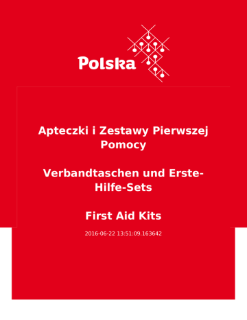 Apteczki i Zestawy Pierwszej Pomocy Verbandtaschen und ErsteHilfe-Sets First Aid Kits 2016-06-22 13:51:09.163642 2 3 Ova ponuda ne predstavlja reklamu Adres instytucji/firmy ogłaszającej ofertę Centrum Bezpieczeństwa Ruchu Drogowego Sp. z o.o. 90-406 Łódź Piotrkowska 17 Poland Kontakt osoba Tomasz Zagajewski [email protected] 42 678 91 00 www.centrumbrd.pl Opis reda Centrum BRD Ldt. is a manufacturer of first-aid kits and first-aid sets. We offer over 40 different types of products, from a small first-aid kits that perfectly fulfill the function of the gadget, to full, advanced sets, designed for the medical lifeguards. In the field of production of first aid sets and first aid kits, Centrum BRD, from the very beginning, the philosophy to maintain the highest quality and ensure complete professionalism has been adopted. It is possible to achieve it, inter alia, thanks to including approximately 97 % of the Polish and European products in the first aid kits. We also offer tables with the first aid instruction on it, that are compatible with the guidelines of the European Resuscitation Council. This product is available in different sizes and materials for example PVC, foil or Plexiglass. The perfect combination of first-aid kit and first-aid table is First-Aid Point. Rich equipment (with the possibility of extension of for example backboard) and clear instruction ensure comprehensive security of the workplaces, schools, sports facilities, etc. We invite you to familiarize with our catalog of products and services, which is attached. 4 Nabywcy z zagranicy ● Szwajcaria Certifikati ● ● ● ● ● Centrum Bezpieczeństwa Ruchu Drogowego has signed the European Road Safety Charter and thereby committed to share the responsibility for road safety in Europe NATO Commercial and Government Entity Code NCAGE The products are registered in the Office for Registration of Medicinal Products, Medical Devices and Biocidal Products Certificate European Resuscitation Council Quality certificate Centrum BRD Priznanja i nagrade ● ● ● ● ● Nominations for the Excellence in Road Safety Awards The award for the best Lodz product - first aid kit - in the tenth edition of the competition Łódź Proponuje Award of the Minister of Infrastructure for the most innovative products „Golden Shield Orlen” Award "Golden Globe " Polish Tourist Chamber CPV ● Security, fire-fighting, police and defence equipment Prilozi 5 apteczka podręczna.jpg samochodowa.jpg typ c.jpg punkt PP.jpg Vrsta ponude rodaja Rok za dostavu ponuda 01.11.2016 Vrijedi od 05.05.2016 Grane Przemysł farmaceutyczny 6 Zdrowie i medycyna Minimalna vrijednost ugovora 20.00 Valuti Kupci u inozemstvu DA 7
