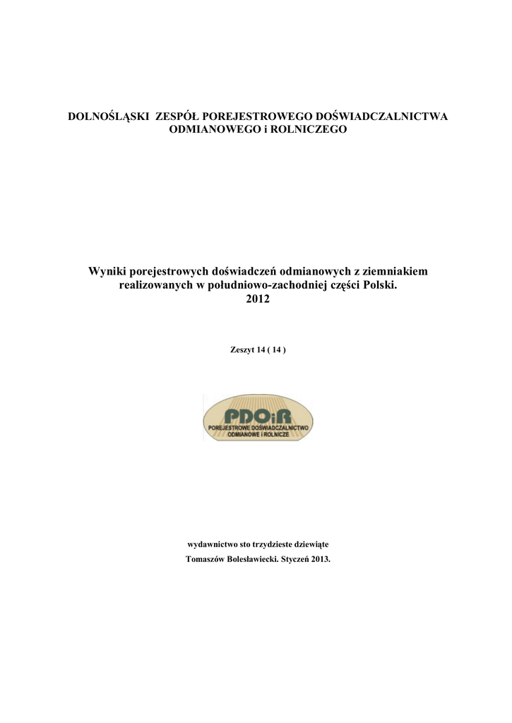 DOLNOŚLĄSKI ZESPÓŁ POREJESTROWEGO DOŚWIADCZALNICTWA ODMIANOWEGO i ROLNICZEGO Wyniki porejestrowych doświadczeń odmianowych z ziemniakiem realizowanych w południowo-zachodniej części Polski. 2012 Zeszyt 14 ( 14 ) wydawnictwo sto trzydzieste dziewiąte Tomaszów Bolesławiecki. Styczeń 2013. Dolnośląski Zespół Porejestrowego Doświadczalnictwa Odmianowego i Rolniczego Przewodnicząca: mgr inż. Anna Kamińska Dyrektor SDOO Zybiszów Z-ca: prof. dr hab. Jan Kaczmarek Z-ca: prof. dr hab. Henryk Bujak z-ca sekretarz: mgr inż. Ewa Śmiałek Stacja Koordynująca PDO na Dolnym Śląsku: COBORU Stacja Doświadczalna Oceny Odmian w Zybiszowie 55-080 Kąty Wrocławskie Dyrektor: mgr inż. Anna Kamińska www.zybiszow.coboru.pl Tel. 71-334-20-10 Opracował: dr Przemysław Majchrowski Publikacja chroniona prawem wydawcy; każda reprodukcja całości lub jej części wymaga zgody wydawcy Wydawca: SDOO Zybiszów Wyniki porejestrowych doświadczeń odmianowych z ziemniakiem realizowanych w południowo-zachodniej części Polski. 1. Wstęp Sprzyjające warunki klimatyczne i glebowe w naszym kraju powinny zachęcać do uprawy ziemniaków. Pomimo tego ich uprawa w ostatnim dziesięcioleciu systematycznie malała (rys. 1). Według danych GUS powierzchnia pól produkcyjnych ziemniaka w 2012 roku była niższa o 7,3 % niż w roku 2011 i wynosiła 373 tys. ha. W ostatnim roku zmalała również powierzchnia upraw nasiennych ziemniaka. Według danych Głównego Inspektoratu Państwowej Inspekcji Ochrony Roślin i Nasiennictwa powierzchnia upraw wynosiła 5330,7 ha (5445,1 ha w 2011 r). Reprodukcja materiału sadzeniakowego zarejestrowanych odmian ziemniaka (123 w KR, wg stanu na 25.01.2013) jest zróżnicowana, cztery najpopularniejsze odmiany miały w udziale 29,1 % całego areału plantacji nasiennych. Znaczną część tej powierzchni (24,4 %) zajmowały odmiany nie wpisane do krajowego rejestru (KR), pochodzące ze Wspólnotowego Katalogu Odmian Roślin Rolniczych (CCA). Możliwość zakupu kwalifikowanego materiału sadzeniakowego 80% zarejestrowanych w Polsce odmian jest znacznie ograniczona. Do Krajowego Rejestru Odmian w roku 2013 wpisano 6 nowych odmian ziemniaka, skreślono 13. Obecnie w krajowym rejestrze (marzec 2013) znajduje się 129 odmian ziemniaka. Z przeprowadzonych analiz, opartych na wynikach doświadczeń degeneracyjnych, wykonanych w IHAR – Oddział Bonin wynika, że optymalna częstotliwość wymiany sadzeniaków w gospodarstwach nastawionych na towarową produkcję wynosi trzy lata. Niewielki udział plantacji nasiennych w stosunku do ogólnej powierzchni uprawy, wynoszący 1,4 %, nie pozwala na pożądaną częstotliwość wymiany materiału sadzeniakowego. Szacuje się, że udział sadzeniaków kwalifikowanych w zużyciu sadzeniaków ogółem nadal nie przekracza 7 %. Niewielki poziom produkcji nasiennej nie pozwala na wykorzystanie większego potencjału plonowania odmian nowych. W efekcie plonowanie ziemniaków w skali kraju jest o połowę niższe od uzyskiwanego w doświadczeniach COBORU (rys.1). Rysunek 1. Ziemniak. Powierzchnia uprawy, plonowanie w kraju i w doświadczeniach COBORU. Lata 2003-2012. Stały napływ nowych odmian, również tych z katalogu CCA, pozwala producentom rolnym na coraz większy wybór odmian dostosowanych do charakteru produkcji i warunków siedliskowych. Wobec wysokich nakładów ponoszonych na produkcję ziemniaków, producent poszukuje odmian o ustalonej renomie na rynku, stabilnych w plonowaniu i odpornych na choroby. Celem badań było sprawdzenie obecnej wartości gospodarczej odmian, znajdujących się w obrocie nasiennym, i równoczesne porównanie ich z odmianami nowymi, wchodzącymi dopiero do uprawy. W opracowaniu przedstawiono wyniki plonowania i zawartości skrobi dla regionu Polski południowo-zachodniej, natomiast odporność badanych odmian na mątwika ziemniaczanego i podstawowe choroby oraz cechy morfologiczne i ocenę właściwości konsumpcyjnych zestawiono na podstawie badań ogólnokrajowych. Pojedyncze doświadczenia odmianowe realizowane w ramach PDOiR, prowadzone z ziemniakiem na terenie województw, uniemożliwiały prawidłowe wartościowanie odmian. W celu tworzenia list odmian zalecanych do uprawy (LOZ) wyodrębniono w kraju cztery regiony o podobnych warunkach glebowych i siedliskowych do uprawy ziemniaka oraz o zbliżonych oczekiwaniach konsumentów. Obszar Polski południowo-zachodniej obejmujący 4 województwa reprezentowało w 2012 roku 8 punktów doświadczalnych (rys 2.). Rysunek 2. Ziemniak. Lokalizacja doświadczeń z ziemniakiem w 2012 roku. 2. Przebieg warunków atmosferycznych w jednostkach doświadczalnych prowadzących doświadczenia PDOiR z ziemniakiem w 2012 roku W roku 2012 doświadczenia Porejestrowego Doświadczalnictwa Odmianowego i Rolniczego z ziemniakiem na terenie województw: dolnośląskiego, łódzkiego, opolskiego i śląskiego realizowano w 7 stacjach doświadczalnych COBORU i jednej jednostce hodowli roślin. Tabela 1 Ziemniak. Miesięczne sumy opadów w jednostkach doświadczalnych prowadzących doświadczenia porejestrowe na terenie województw: dolnośląskiego, łódzkiego, opolskiego i śląskiego w 2012 roku. Opady [mm] Lp. Miesiąc 1 Kwiecień 2 Maj 3 Czerwiec 4 Lipiec 5 Sierpień 6 Wrzesień Suma V-VII Suma V-VIII Suma V-IX ZDOO w Lućmierzu ZDOO w Masłowicach ZDOO w Naroczycach SDOO w Pawłowicach HZ Zamarte O/Olesno SDOO w Sulejowie ZDOO w Tarnowie SDOO w Zybiszowie 51 26 48 83 45 46 157 202 248 15 56 89 40 46 34 185 231 265 41 49 107 140 95 30 296 391 421 65 35 71 54 49 39 160 209 248 26 37 81 69 57 46 187 244 290 44 23 69 60 54 37 152 206 243 30 56 64 145 69 58 265 334 392 33 35 82 102 62 45 219 281 326 Rozwój ziemniaka zależy nie tylko od warunków siedliskowych, lecz również od uwarunkowań klimatycznych. Optymalny przebieg warunków pogodowych w czasie wegetacji oraz zdrowy, kwalifikowany materiał sadzeniakowy stanowią podstawę uzyskania plonu o pożądanyc
