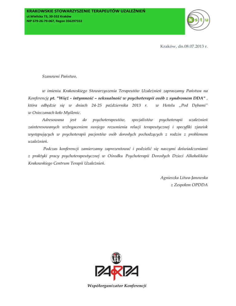 KRAKOWSKIE STOWARZYSZENIE TERAPEUTÓW UZALEŻNIEŃ ul.Wielicka 73, 30-552 Kraków NIP 679-26-79-067, Regon 356297553 Kraków, dn.08.07.2013 r. Szanowni Państwo, w imieniu Krakowskiego Stowarzyszenia Terapeutów Uzależnień zapraszamy Państwa na Konferencję pt. "Więź - intymność – seksualność w psychoterapii osób z syndromem DDA" , która odbędzie się w dniach 24-25 października 2013 r. w Hotelu „Pod Dębami” w Osieczanach koło Myślenic. Adresowana jest do psychoterapeutów, specjalistów psychoterapii uzależnień zainteresowanych wzbogaceniem swojego rozumienia relacji terapeutycznej i specyfiki zjawisk występujących w psychoterapii pacjentów osób dorosłych pochodzących z rodzin z problemem uzależnień. Podczas konferencji zamierzamy zaprezentować i podzielić się naszymi doświadczeniami z praktyki pracy psychoterapeutycznej w Ośrodku Psychoterapii Dorosłych Dzieci Alkoholików Krakowskiego Centrum Terapii Uzależnień. Agnieszka Litwa-Janowska z Zespołem OPDDA Współorganizator Konferencji KRAKOWSKIE STOWARZYSZENIE TERAPEUTÓW UZALEŻNIEŃ ul.Wielicka 73, 30-552 Kraków NIP 679-26-79-067, Regon 356297553 Informacje organizacyjne: Ilość miejsc na konferencji jest ograniczona – decyduje kolejność zgłoszeń poprzez rejestrację online na stronie organizatora www.kctu.pl lub www.kstu.pl oraz dokonanie wpłaty, Opłata konferencyjna wynosi 400 zł do 31/08 po tym terminie wynosi 480 zł (rezygnacja z noclegu nie wpływa na wysokość opłaty), Organizator zapewnia uczestnikom pobyt i wyżywienie, Opłatę konferencyjną prosimy wpłacać na konto: Krakowskie Stowarzyszenie Terapeutów Uzależnień, Credit Agricole, nr rachunku: 21194010763085194800130000 Przy wpłacie prosimy zamieścić dopisek „ konferencja DDA” oraz podać swoje dane (imię, nazwisko, instytucja wpłacająca); W przypadku rezygnacji z konferencji opłaty nie będą zwracane; W związku z limitem miejsc na warsztatach o uwzględnieniu preferencji decyduje kolejność zgłoszeń; Dojazd na konferencję we własnym zakresie - na stronie internetowej www.poddebami.pl znajduje się mapka dojazdowa do Osieczan Uczestnicy zostaną powiadomieni drogą email o zakwalifikowaniu się na konferencję, Organizatorzy zastrzegają sobie możliwość odmowy uczestnictwa w konferencji w przypadku wyczerpania limitu miejsc oraz możliwość zmiany programu W przypadku dodatkowych pytań – kontakt Lilla Barańska lub tel. 12/633-50-08 w godzinach 8.00 – 15.00, email [email protected] Współorganizator Konferencji kom.505/163-624
