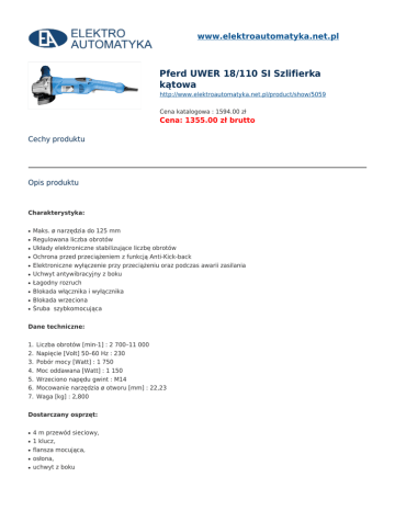 www.elektroautomatyka.net.pl Pferd UWER 18/110 SI Szlifierka kątowa http://www.elektroautomatyka.net.pl/product/show/5059 Cena katalogowa : 1594.00 zł Cena: 1355.00 zł brutto Cechy produktu Opis produktu Charakterystyka: ● ● ● ● ● ● ● ● ● ● Maks. ø narzędzia do 125 mm Regulowana liczba obrotów Układy elektroniczne stabilizujące liczbę obrotów Ochrona przed przeciążeniem z funkcją Anti-Kick-back Elektroniczne wyłączenie przy przeciążeniu oraz podczas awarii zasilania Uchwyt antywibracyjny z boku Łagodny rozruch Blokada włącznika i wyłącznika Blokada wrzeciona Śruba szybkomocująca Dane techniczne: 1. 2. 3. 4. 5. 6. 7. Liczba obrotów [min-1] : 2 700–11 000 Napięcie [Volt] 50–60 Hz : 230 Pobór mocy [Watt] : 1 750 Moc oddawana [Watt] : 1 150 Wrzeciono napędu gwint : M14 Mocowanie narzędzia ø otworu [mm] : 22,23 Waga [kg] : 2,800 Dostarczany osprzęt: ● ● ● ● ● 4 m przewód sieciowy, 1 klucz, flansza mocująca, osłona, uchwyt z boku ELEKTRO-AUTOMATYKA Sprzedaż elektronarzędzi, urządzeń spawalniczych, maszyn budowlanych, pneumatyki, narzędzi warsztatowych, firmowych ubrań roboczych oraz maszyn ogrodowo leśnych. Sklep Bochnia ul. Brzeska 50 32-700 Bochnia Sklep Brzesko ul. Szarych Szeregów 23 32-800 Brzesko Serwis, Magazyn ul. Św. Brata Alberta 4 32-800 Brzesko tel. 691 572 333 e-mail: [email protected] tel. 609 523 230 e-mail: [email protected] tel. 609 523 645 e-mail: [email protected]