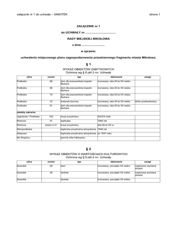 załącznik nr 1 do uchwały – GNIOTEK strona 1 ZAŁĄCZNIK nr 1 do UCHWAŁY nr ..................................... RADY MIEJSKIEJ MIKOŁOWA z dnia ............................ w sprawie: uchwalenia miejscowego planu zagospodarowania przestrzennego fragmentu miasta Mikołowa. §1 ulica numer WYKAZ OBIEKTÓW ZABYTKOWYCH Ochrona wg § 8 pkt.3 nn. Uchwały typ datowanie Podleska 66 dom dla pracowników kopalni Barbara murowany, lata 20-te XX wieku Podleska 68 dom dla pracowników kopalni Barbara murowany, lata 20-te XX wieku Podleska 70 dom dla pracowników kopalni Barbara murowany, lata 20-te XX wieku Podleska 72 budynek biurowy murowany, lata 20-te XX wieku Podleska 81 dom dla pracowników kopalni Barbara murowany, lata 20-te XX wieku Jagodowa / Podleska 102 krzyŜ przydroŜny XIX/XX wiek Rolnicza 41 kapliczka 1946 rok Rolnicza przed nr 41 krzyŜ przydroŜny lata 80-te XX w. uwagi silnie przebudowany obiekty sakralne Staropodleska kapliczka przydroŜna skrzynkowa 1948 rok Wiązowa kapliczka przydroŜna skrzynkowa po 1937 roku Na Wzgórzu pomnik ofiar hitleryzmu §2 ulica WYKAZ OBIEKTÓW O WARTOŚCIACH KULTUROWYCH Ochrona wg § 8 pkt.4 nn. Uchwały numer typ datowanie uwagi Szarotek 28 dom murowany, początek XX wieku częściowa wymiana stolarki Szarotek 28 stodoła murowana, początek XX wieku częściowa wymiana stolarki stodoła murowana, początek XX wieku Szarotek załącznik nr 1 do uchwały – GNIOTEK strona 2 §3 WYKAZ STANOWISK ARCHEOLOGICZNYCH Ochrona wg § 8 pkt.1 nn. Uchwały Nr na planie Nr na obszarze funkcja obiektu bliŜsza chronologia materiał masowy kultura obszar AZP 100-46 Agn01 44 ślady osadnictwa czasy nowoŜytne Agn02 5 ślady osadnictwa czasy nowoŜytne Agn03 3 ślady osadnictwa późne średniwiecze XVI-XVII wiek obszar AZP 100-47 5 fragmentów ceramiki Nr na obszarze – stanowiska na obszarach AZP nr 100-46 oraz 100-47 znaleziska wyodrębnione