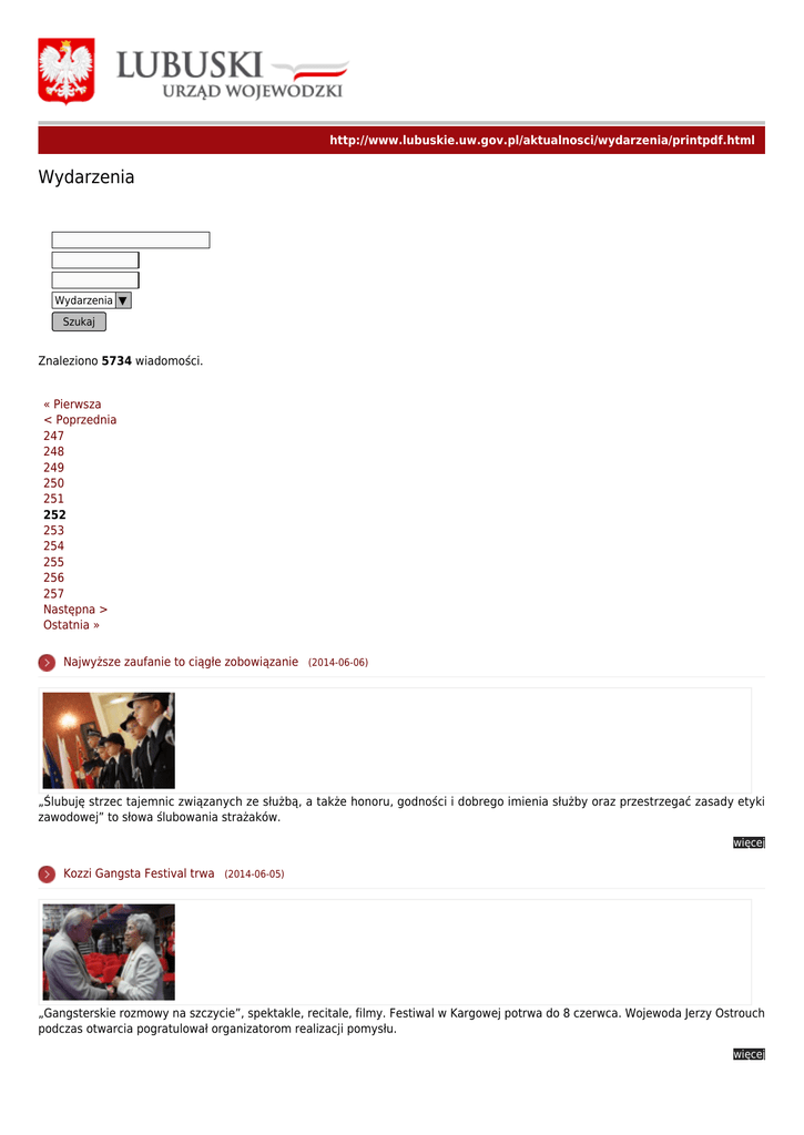 http://www.lubuskie.uw.gov.pl/aktualnosci/wydarzenia/printpdf.html Wydarzenia Wydarzenia ▼ Szukaj Znaleziono 5734 wiadomości. « Pierwsza < Poprzednia 247 248 249 250 251 252 253 254 255 256 257 Następna > Ostatnia » Najwyższe zaufanie to ciągłe zobowiązanie (2014-06-06) „Ślubuję strzec tajemnic związanych ze służbą, a także honoru, godności i dobrego imienia służby oraz przestrzegać zasady etyki zawodowej” to słowa ślubowania strażaków. więcej Kozzi Gangsta Festival trwa (2014-06-05) „Gangsterskie rozmowy na szczycie”, spektakle, recitale, filmy. Festiwal w Kargowej potrwa do 8 czerwca. Wojewoda Jerzy Ostrouch podczas otwarcia pogratulował organizatorom realizacji pomysłu. więcej Prymusi w LUW (2014-06-05) Prymusi wśród szóstoklasistów, uczniowie SP 15 z Gorzowa Wlkp. odwiedzili LUW. W ramach kilkugodzinnej wizyty w urzędzie uczniowie poznali zadania Wojewody i specyfikę pracy urzędników. więcej Ale nam się wydarzyło…. (foto) (2014-06-05) Wydarzenia sprzed 25 lat ukształtowały nową polską rzeczywistość. - To dzięki wysiłkowi, niezłomności i zaangażowaniu osób, którym dziś chcę gorąco podziękować, możemy żyć w wolnej, suwerennej i niepodległej Ojczyźnie - powiedział Jerzy Ostrouch. Z inicjatywy Wojewody Lubuskiego w gorzowskim teatrze im. Juliusza Osterwy odbyła się uroczysta gala z okazji 25-lecia wolności. więcej Niech nam rośnie Dąb Wolności! (2014-06-05) - Nie ma lepszego miejsca dla tego drzewa, które będzie świadkiem dokonań przyszłych pokoleń - powiedział wojewoda Jerzy Ostrouch rozpoczynając uroczystość sadzenia Dębu Wolności. Stanął w parku tuż przy pomniku marszałka Józefa Piłsudskiego w Gorzowie Wlkp., nieopodal pomika Adama Mickiewicza. więcej Gimnazjaliści z całej Polski rywalizowali w Drzonkowie (2014-06-05) Podczas Ogólnopolskiego Turnieju Szkół Gimnazjalnych w Tenisie Stołowym Dziewcząt i Chłopców rozgrywanego w imieniu Wojewody Lubuskiego Halina Kunicka przybliżyła uczniom akcję Kibic na 6. więcej Światowy Dzień Ochrony Środowiska (2014-06-05) Pod honorowym patronatem Wojewody Lubuskiego w czwartek, 5 czerwca, odbyła się konferencja z okazji Światowego Dnia Ochrony Środowiska. W sali wykładowej zaproszenie prelegenci przestawili swoje prezentacje, zaś dla wszystkich gości biblioteki, na parterze prezentowały się stoiska promocyjne instytucji i firm biorących udział w konferencji. więcej Konwent lubuskich włodarzy (2014-06-04) Dyskusja z udziałem Marszałka Województwa Lubuskiego Elżbiety Polak i Wojewody Lubuskiego Jerzego Ostroucha była jednym punktów posiedzenia Konwentu Zrzeszenia PBiWWL. więcej O paradoksach naszej wolności (2014-06-04) - Mamy wielki dług w stosunku do parlamentarzystów wybranych w 1989 r. Ich praca i dorobek to wielkie dzieło włożone w budowę państwa polskiego i założeń ustrojowych państwa. Za to dzisiaj bardzo dziękuję – powiedział wojewoda Jerzy Ostrouch podczas konferencji naukowej „Paradoksy naszej wolności, Społeczeństwo polskie 25 lat po czerwcu ’89", która odbyła się na Uniwersytecie Zielonogórskim. więcej Udało się nam …. (2014-06-04) - Wspólnie cieszmy się wolnością - zaapelował wicewojewoda Jan Świrepo, który wziął udział w inauguracji gorzowskich jubileuszowych wydarzeń na Starym Rynku. więcej « Pierwsza < Poprzednia 247 248 249 250 251 252 253 254 255 256 257 Następna > Ostatnia »