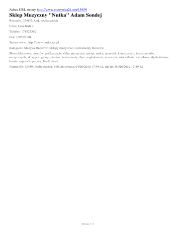 Adres URL strony http://www.rozrywka24.net/13959 Sklep Muzyczny "Nutka" Adam Sondej Rzeszów, 35-032, woj. podkarpackie Ulica: Lisa-Kuli 2 Telefon: 178525380 Fax: 178525380 Strona www: http://www.nutka.ipr.pl Kategorie: Muzyka Rzeszów, Sklepy muzyczne i instrumenty Rzeszów Słowa kluczowe: rzeszów, podkarpacie, sklep muzyczny, sprzęt, nutka, sprzedaż, klasycznych, instrumentów, muzycznych, skrzypce, gitary, pianina, instrumenty, dęte, nagłośnienie, sceniczne, oświetlenie, estradowe, dyskotekowe, komis, naprawa, peavey, line6, alesis Numer ID: 13959, liczba odsłon: 160, aktywacja: 04/06/2010 17:49:42, edycja: 04/06/2010 17:49:42 Strona 1 / 1