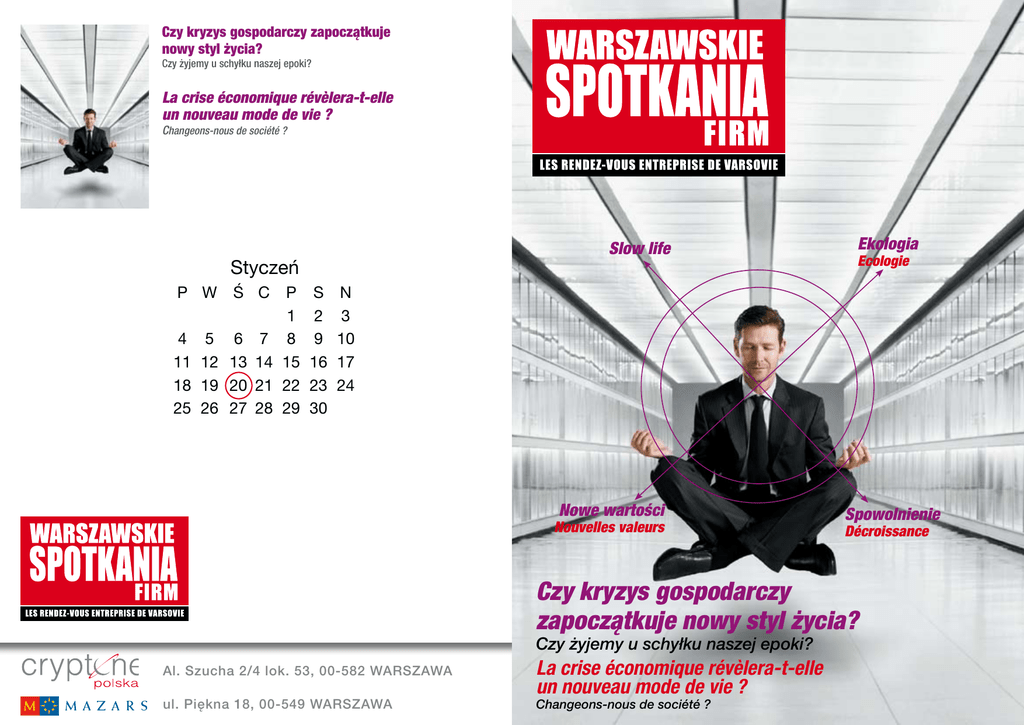 Czy kryzys gospodarczy zapoczątkuje nowy styl życia? Czy żyjemy u schyłku naszej epoki? La crise économique révèlera-t-elle un nouveau mode de vie ? Changeons-nous de société ? Slow life Styczeń Ekologia Ecologie P W Ś C P S N 4 5 6 7 11 12 13 14 18 19 20 21 25 26 27 28 1 8 15 22 29 2 9 16 23 30 3 10 17 24 Nowe wartości Nouvelles valeurs Spowolnienie Décroissance Czy kryzys gospodarczy zapoczątkuje nowy styl życia? Czy żyjemy u schyłku naszej epoki? Al. Szucha 2/4 lok. 53, 00-582 Warszawa ul. Piękna 18, 00-549 Warszawa La crise économique révèlera-t-elle un nouveau mode de vie ? Changeons-nous de société ? Daniel Teboul Michel Kiviatkowski Prezes Zarządu Cryptone Polska Agencja Reklamowa Wspólnik - Prezes Zarządu, Mazars w Polsce Audyt - Ksiegowość - Doardztwo Podatkowe Gérant de Cryptone Polska, Agence de Communication Associé Gérant de Mazars Pologne, Audit - Comptabilité - Conseil Fiscal Mają przyjemność zaprosić Państwa na śniadanie biznesowe pod tytułem Sont heureux de vous inviter à un petit-déjeuner sur le thème Czy kryzys gospodarczy zapoczątkuje nowy styl życia? «Czy żyjemy u schyłku naszej epoki?» La crise économique révèlera-t-elle un nouveau mode de vie ? «Changeons-nous de société ?» Środa, 20 stycznia 2010 o godz. 8.30 Mercredi 20 janvier 2010 à 8h30 Mazars, ul. Piękna 18, 00-549 Warszawa Prosimy o potwierdzenie przybycia przed 13.01.2010 - RSVP avant le 13/01/2010 Mazars: Dział Komunikacji Mazars - tel. 022 255 52 00 - fax 022 255 52 99 - [email protected] Cryptone Polska: Agnieszka Stańczyk-Małecka - tel. 022 628 87 44 - fax 022 628 88 29 - [email protected] tłumaczenie symultaniczne francusko-polskie zapewnione - traduction simultanée franco-polonaise assurée
