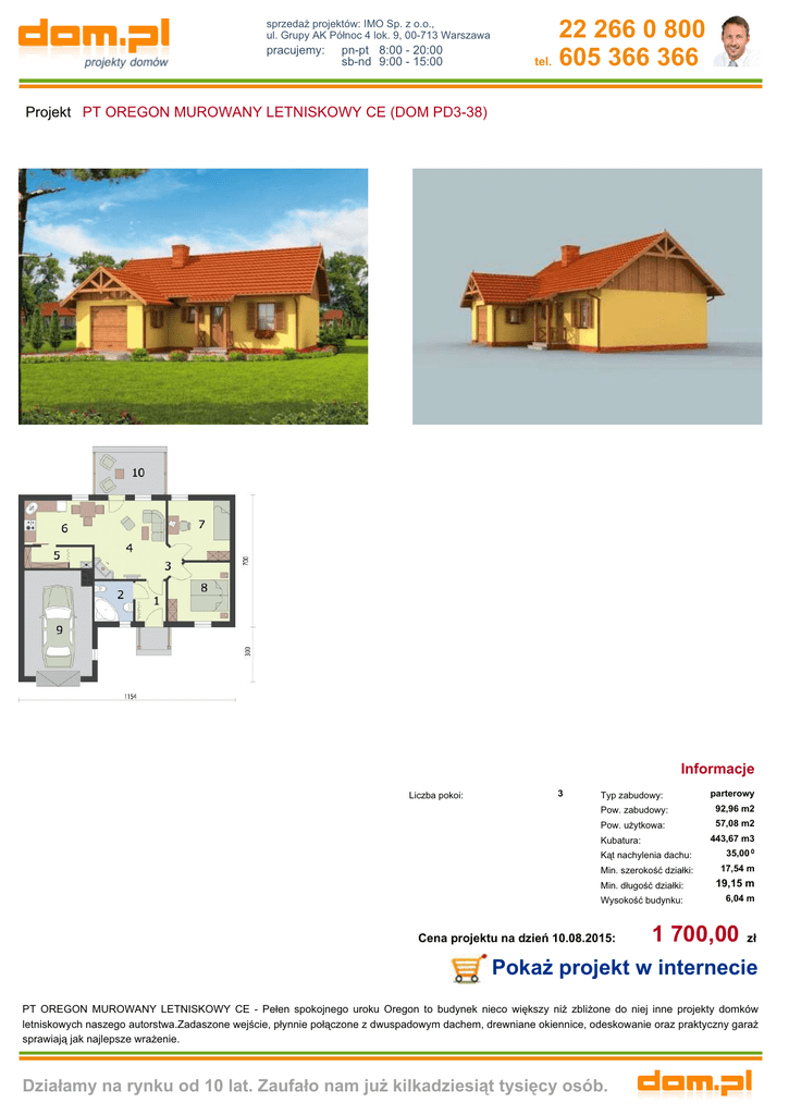 sprzedaż projektów: IMO Sp. z o.o., ul. Grupy AK Północ 4 lok. 9, 00-713 Warszawa pracujemy: pn-pt 8:00 - 20:00 sb-nd 9:00 - 15:00 22 266 0 800 tel. 605 366 366 Projekt PT OREGON MUROWANY LETNISKOWY CE (DOM PD3-38) Informacje Liczba pokoi: 3 Typ zabudowy: parterowy Pow. zabudowy: 92,96 m2 Pow. użytkowa: 57,08 m2 443,67 m3 Kubatura: Kąt nachylenia dachu: 35,00 0 Min. szerokość działki: 17,54 m Min. długość działki: 19,15 m Wysokość budynku: 6,04 m Cena projektu na dzień 10.08.2015: 1 700,00 zł Pokaż projekt w internecie PT OREGON MUROWANY LETNISKOWY CE - Pełen spokojnego uroku Oregon to budynek nieco większy niż zbliżone do niej inne projekty domków letniskowych naszego autorstwa.Zadaszone wejście, płynnie połączone z dwuspadowym dachem, drewniane okiennice, odeskowanie oraz praktyczny garaż sprawiają jak najlepsze wrażenie. Działamy na rynku od 10 lat. Zaufało nam już kilkadziesiąt tysięcy osób.