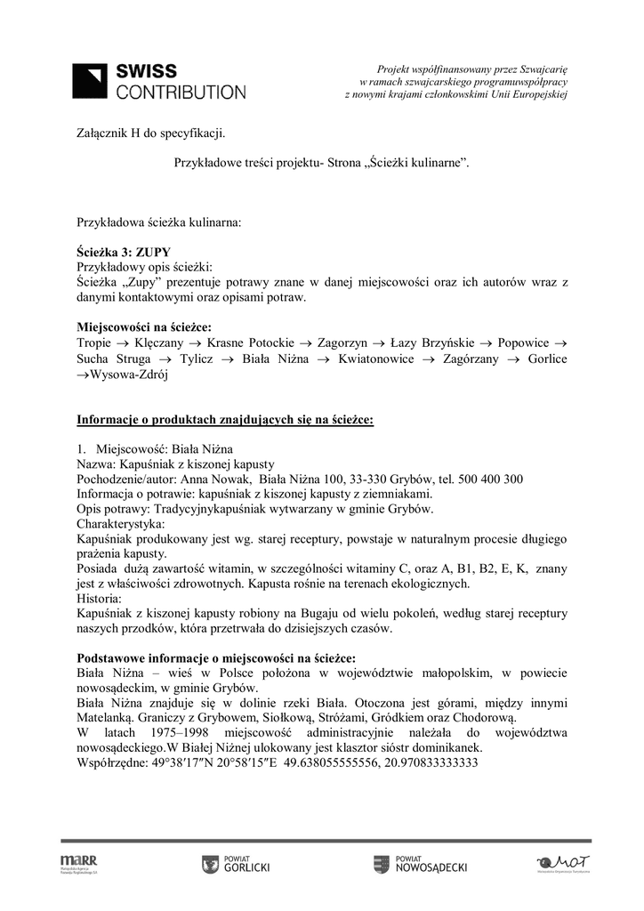 Projekt współfinansowany przez Szwajcarię w ramach szwajcarskiego programuwspółpracy z nowymi krajami członkowskimi Unii Europejskiej Załącznik H do specyfikacji. Przykładowe treści projektu- Strona „Ścieżki kulinarne”. Przykładowa ścieżka kulinarna: Ścieżka 3: ZUPY Przykładowy opis ścieżki: Ścieżka „Zupy” prezentuje potrawy znane w danej miejscowości oraz ich autorów wraz z danymi kontaktowymi oraz opisami potraw. Miejscowości na ścieżce: Tropie Klęczany Krasne Potockie Zagorzyn Łazy Brzyńskie Popowice Sucha Struga Tylicz Biała Niżna Kwiatonowice Zagórzany Gorlice Wysowa-Zdrój Informacje o produktach znajdujących się na ścieżce: 1. Miejscowość: Biała Niżna Nazwa: Kapuśniak z kiszonej kapusty Pochodzenie/autor: Anna Nowak, Biała Niżna 100, 33-330 Grybów, tel. 500 400 300 Informacja o potrawie: kapuśniak z kiszonej kapusty z ziemniakami. Opis potrawy: Tradycyjnykapuśniak wytwarzany w gminie Grybów. Charakterystyka: Kapuśniak produkowany jest wg. starej receptury, powstaje w naturalnym procesie długiego prażenia kapusty. Posiada dużą zawartość witamin, w szczególności witaminy C, oraz A, B1, B2, E, K, znany jest z właściwości zdrowotnych. Kapusta rośnie na terenach ekologicznych. Historia: Kapuśniak z kiszonej kapusty robiony na Bugaju od wielu pokoleń, według starej receptury naszych przodków, która przetrwała do dzisiejszych czasów. Podstawowe informacje o miejscowości na ścieżce: Biała Niżna – wieś w Polsce położona w województwie małopolskim, w powiecie nowosądeckim, w gminie Grybów. Biała Niżna znajduje się w dolinie rzeki Biała. Otoczona jest górami, między innymi Matelanką. Graniczy z Grybowem, Siołkową, Stróżami, Gródkiem oraz Chodorową. W latach 1975–1998 miejscowość administracyjnie należała do województwa nowosądeckiego.W Białej Niżnej ulokowany jest klasztor sióstr dominikanek. Współrzędne: 49°38′17″N 20°58′15″E 49.638055555556, 20.970833333333 Projekt współfinansowany przez Szwajcarię w ramach szwajcarskiego programuwspółpracy z nowymi krajami członkowskimi Unii Europejskiej Przykładowe inne potrawy znajdujące się na ścieżce 3: 1. Nazwa: Barszcz z uszkami grzybowymi Miejscowość: Gorlice Pochodzenie/autor: Anna Nowak, ul. Kolejowa 15, Gorlice Informacja o potrawie: barszcz gotowany z naturalnego zakwasu buraczanego z uszkami grzybowymi w cieście z otrąb pszennych. 2. Nazwa: Zupa kurkowa Miejscowość: Popowice Pochodzenie/autor: Maria Nowak, ul. Kościuszki 30, 38-300 Popowice, tel. (18) 3002030 Informacja o potrawie: zupa na rosole z kurek smażonych na maśle i duszonych w słodkiej śmietanie. Projekt współfinansowany przez Szwajcarię w ramach szwajcarskiego programuwspółpracy z nowymi krajami członkowskimi Unii Europejskiej Załącznik I do specyfikacji. Przykładowe treści projektu -Stronę „Agroturystyka – wyszukiwarka” Lista znalezionych obiektów: Obiekt 1 Rytro, „Pokoje gościnne Kasia”, Rytro 1, 33-333 Rytro Obiekt 2 Piwniczna Zdrój, „Gospodarstwo Agroturystyczne”, Piwniczna 1, 33-333 Piwniczna Obiekt 3 Wysowa Zdrój, „Pensjonat Ania”, Wysowa Zdrój 1, 33-333 Wysowa Zdrój Zobacz więcej „Pensjonat Ania” Wysowa Zdrój 1, 33-333 Wysowa Zdrój Współrzędne GPS: 49.435278N, 20.711389E Strona internetowa: www.pensjonatania.com.pl Właściciel: Anna Nowak Opis: „Pensjonat Ania” zaprasza do drewnianego domu z bali, wybudowanego na przełomie XIX – XX wieku oraz dawnej stajenki zaadaptowanej na dwa niezależne studia. Dom został pieczołowicie wyremontowany i przystosowany do wypoczynku w komfortowych warunkach. To spełnienie marzeń o wygodnej wiejskiej chacie, której wystrój oddaje klimat dawnych lat. Kryta trzciną "Stajenka" jest wykończona w prostym, wiejskim stylu z odrobiną fantazji. Mam nadzieję, że przyjeżdżając do Pensjonatu Ania zapomnicie Państwo o troskach dnia codziennego i znajdziecie tu chwilę spokoju, zadumy i radości. Piktogramy: Obiekt w kategorii: turystyka rodzinna aktywny wypoczynek ekoturystyka turystyka wypoczynkowa Charakterystyka obiektu: miód zioła nalewki Projekt współfinansowany przez Szwajcarię w ramach szwajcarskiego programuwspółpracy z nowymi krajami członkowskimi Unii Europejskiej chleb wiejski wiejski nabiał warzywa z własnej uprawy grzyby wędkowanie możliwość rozpalenia ogniska możliwość grillowania kuligi dancingi telewizor w pokoju miejsca parkingowe badminton tenis stołowy siatkówka koszykówka piłka nożna możliwość zwiedzania okolicy z przewodnikiem każdy pokój z łazienką wyżywienie u gospodarza Internet język angielski Okolica: lodowisko (odległość do 5 km) jazda konna (odległość do 1 km) szlak architektury drewnianej (do 10 km) zabytki (zamek) (do 10 km) miejsca kultu religijnego (do 1 km) miejsca kultu religijnego (do 5 km) spływy kajakowe las (odległość do 1 km) kąpielisko (odległość do 1 km) tor saneczkowy (odległość do 1 km) Inne: zwierzęta domowe mile widziane udogodnienia dla osób niepełnosprawnych własna pasieka Projekt współfinansowany przez Szwajcarię w ramach szwajcarskiego programuwspółpracy z nowymi krajami członkowskimi Unii Europejskiej Załącznik „J” do specyfikacji Lista piktogramów przyporządkowanych do kategorii lp. 1 2 3 4 5 6 7 8 9 10 11 12 13 14 15 16 17 18 19 20 21 22 23 24 25 26 27 28 29 30 31 32 33 34 35 36 37 38 39 40 41 42 43 44 nazwa plac zabaw dla dzieci możliwość kontaktu ze zwierzętami gospodarskimi możliwość wynajęcia opiekunki do dziecka wypożyczalnia rowerów (do 1 km) wypożyczalnia rowerów (do 5 km) wypożyczalnia nart (do 1 km) wypożyczalnia nart (do 5 km) w pobliżu szlak turystyczny (odległość do szlaku do 1 km) w pobliżu szlak turystyczny (odległość do szlaku do 5 km) w pobliżu szlak turystyczny (odległość do szlaku do 10 km) stok narciarski (odległość do 1 km) stok narciarski (odległość do 5 km) stok narciarski (