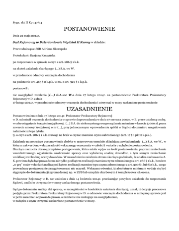 Sygn. akt II Kp 147/14 POSTANOWIENIE Dnia 22 maja 2014r. Sąd Rejonowy w Dzierżoniowie Wydział II Karny w składzie: Przewodnicząca: SSR Adriana Skorupska Protokolant: Kasjana Kaszyńska po rozpoznaniu w sprawie o czyn z art. 286 § 1 k.k. na skutek zażalenia skarżącego (...) S.A. we W. w przedmiocie odmowy wszczęcia dochodzenia na podstawie art. 465 § 2 k.p.k. w zw. z art. 329 § 1 k.p.k. postanowił : nie uwzględnić zażalenia ](...) S.A.we W.z dnia 27 lutego 2014r. na postanowienie Prokuratora Prokuratury Rejonowej w D. z dnia 17 lutego 2014r. w przedmiocie odmowy wszczęcia dochodzenia i utrzymać w mocy zaskarżone postanowienie UZASADNIENIE Postanowieniem z dnia 17 lutego 2014r. Prokurator Prokuratury Rejonowej w D. odmówił wszczęcia dochodzenia w sprawie doprowadzenia w dniu 17 czerwca 2002r. w B. przez ustaloną osobę, w celu osiągnięcia korzyści majątkowej, (...) S.A. do niekorzystnego rozporządzenia mieniem w kwocie 5.000 zł, przez zawarcie umowy kredytowej o nr (...), przy jednoczesnym wprowadzeniu spółki w błąd co do zamiaru uregulowania należności z tego tytułu, tj. o czyn z art. 286 § 1 k.k. z uwagi na brak w czynie znamion czynu zabronionego (art. 17 § 1 pkt 2 k.p.k.). Zażalenie na powyższe postanowienie złożyła w ustawowym terminie składająca zawiadomienie (...) S.A. we W., w którym zakwestionowała zasadność wskazanego orzeczenia w całości i wniosła o uchylenie postanowienia. Skarżąca zarzuciła obrazę przepisów postępowania, która miała wpływ na treść postanowienia, poprzez zaniechanie wszechstronnego wyjaśnienia okoliczności sprawy oraz wybiórczą analizę dowodów, a tym samym zaniechanie wnikliwej swobodnej oceny dowodów. W uzasadnieniu zażalenia strona skarżąca podniosła, że analiza zachowania A. K. powinna była być prowadzona nie tylko pod kątem realizacji znamion czynu zabronionego z art. 286 § 1 k.k., bowiem „w grę” może wchodzić analiza pod kątem realizacji znamion typu czynu zabronionego z art. 300 § 1 lub § 2 k.k., czego prowadzący postępowanie przygotowawcze nie uczynił. Wskazano również, iż absolutnym minimum wydaje się być sięgnięcie do dokumentacji zgromadzonej np. w ZUS lub urzędzie skarbowym i kompleksowa ich ocena. Prokurator Rejonowy w D. we wniosku z dnia 14 kwietnia 2014r. przekazując powyższe zażalenie do rozpoznania Sądowi, wniósł o utrzymanie w mocy zaskarżonego postanowienia. Sąd po dokonaniu analizy akt sprawy, w szczególności w kontekście zażalenia skarżącej, uznał, iż decyzja procesowa podjęta przez Prokuratora Prokuratury Rejonowej w D. o odmowie wszczęcia dochodzenia w niniejszej sprawie jest w pełni zasadna i odpowiada prawu, a zażalenie nie zasługuje na uwzględnienie, w związku z czym utrzymał zaskarżone postanowienie w mocy. Zgodnie z art. 286 § 1 k.k. przestępstwo oszustwa popełnia ten, kto w celu osiągnięcia korzyści majątkowej, doprowadza inną osobę do niekorzystnego rozporządzenia własnym lub cudzym mieniem za pomocą wprowadzenia jej w błąd albo wyzyskania błędu lub niezdolności do należytego pojmowania przedsiębranego działania. Określony w powołanym wyżej przepisie występek jest przestępstwem umyślnym zaliczanym do tzw. celowościowej odmiany przestępstw kierunkowych. Ustawa wymaga, aby zachowanie sprawcy było ukierunkowane na określony cel, którym w przypadku oszustwa jest uzyskanie korzyści majątkowej. Sprawca podejmując działania musi mieć, zatem wyobrażenie pożądanej dla niego sytuacji, która stanowić ma rezultat jego zachowania. Zamiar bezpośredni winien obejmować zarówno cel, jak i sam sposób działania zmierzający do realizacji tego celu. Sprawca musi chcieć takiego właśnie sposobu działania w celu osiągnięcia korzyści majątkowej i cel ten musi stanowić punkt odniesienia każdego ze znamion przedmiotowych przestępstwa ( wyrok Sądu Najwyższego z dnia 14 stycznia 2004r., w sprawie sygn. akt IV KK 192/03 ). Czynność sprawcza polega na doprowadzeniu innej osoby do niekorzystnego rozporządzenia mieniem własnym lub cudzym. Przez doprowadzenie należy rozumieć wywołanie niekorzystnej dla pokrzywdzonego decyzji rozporządzającej w odniesieniu do jego mienia. Nie każde doprowadzenie innej osoby do niekorzystnego rozporządzenia mieniem stanowi oszustwo. To ostatnie zachodzi tylko wtedy, kiedy sprawca działał w określony sposób, mianowicie wprowadzając w błąd, wyzyskując błąd lub wyzyskując niezdolność pokrzywdzonego do należytego pojmowania przedsiębranego działania. Takie ujęcie wskazuje, że omawiany czyn można popełnić wyłącznie przez działanie. Wprowadzenie w błąd polega na podjęciu przez sprawcę podstępnych zabiegów prowadzących do wywołania u pokrzywdzonego mylnego wyobrażenia o rzeczywistości. Z kolei wyzyskanie błędu zachodzi wtedy, kiedy pokrzywdzony już ma błędne wyobrażenie o rzeczywistości, zaś sprawca wyobrażenie to wykorzystuje. Niezdolność, którą sprawca wyzyskuje, może mieć charakter trwały lub czasowy, przy czym nie mają znaczenia przyczyny tej niezdolności ani sposób, w jaki sprawca ją wyzyskał. Wszelkie inne sposoby wywołania skutku w postaci niekorzystnego rozporządzenia mieniem pozostają poza zakresem kryminalizacji z art. 286 § 1 k.k. Błędem w rozumieniu znamion tego przestępstwa jest niezgodność między obiektywną rzeczywistością a jej odbiciem w świadomości człowieka. Warunkiem koniecznym istnienia błędu jest konfrontacja obiektywnej rzeczywistości ze stanem świadomości człowieka. Rozbieżność między rzeczywistym stanem rzeczy a jego odzwierciedleniem w świadomości człowieka może polegać na braku uświadomienia sobie przez daną osobę pewnych elementów pozytywnych, występujących w rzeczywistości. Wówczas błąd przyjmuje postać nieświadomości. Uwzględniając obie postaci błędu, należy stwierdzić, że błąd w rozumieniu przestępstwa oszustwa 