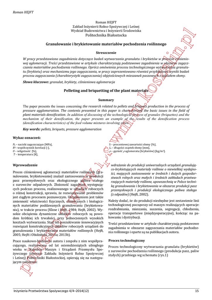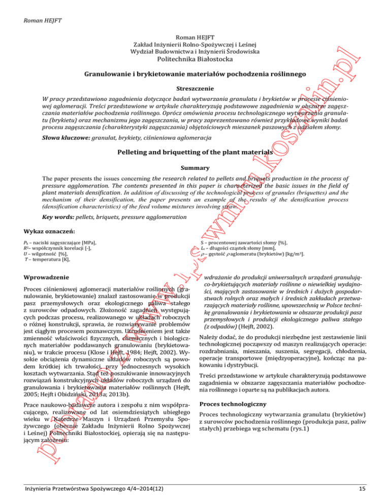 Roman HEJFT Politechnika Białostocka Streszczenie lin Granulowanie i brykietowanie materiałów pochodzenia roślinnego .pl Roman HEJFT Zakład Inżynierii Rolno-Spożywczej i Leśnej Wydział Budownictwa i Inżynierii Środowiska .w m. tu. ko sza W pracy przedstawiono zagadnienia dotyczące badań wytwarzania granulatu i brykietów w procesie ciśnieniowej aglomeracji. Treści przedstawione w artykule charakteryzują podstawowe zagadnienia w obszarze zagęszczania materiałów pochodzenia roślinnego. Oprócz omówienia procesu technologicznego wytwarzania granulatu (brykietu) oraz mechanizmu jego zagęszczania, w pracy zaprezentowano również przykładowe wyniki badań procesu zagęszczania (charakterystyki zagęszczania) objętościowych mieszanek paszowych z udziałem słomy. Słowa kluczowe: granulat, brykiety, ciśnieniowa aglomeracja Pelleting and briquetting of the plant materials Summary The paper presents the issues concerning the research related to pellets and briquets production in the process of pressure agglomeration. The contents presented in this paper is characterized the basic issues in the field of plant materials densification. In addition of discussing of the technological process of granules (briquettes) and the mechanism of their densification, the paper presents an example of the results of the densification process (densification characteristics) of the feed volume mixtures involving straw. Key words: pellets, briquets, pressure agglomeration Wykaz oznaczeń: S – procentowej zawartości słomy [%], Lt – długości cząstek słomy [mm], – gęstość aglomeratu (brykietów) [kg/m3]. ips Pk – naciski zagęszczające [MPa], R2– współczynnik korelacji [-], U – wilgotność [%], T – temperatura [K], w. Wprowadzenie bra no z ww Proces ciśnieniowej aglomeracji materiałów roślinnych (granulowanie, brykietowanie) znalazł zastosowanie w produkcji pasz przemysłowych oraz ekologicznego paliwa stałego z surowców odpadowych. Złożoność zagadnień występujących podczas procesu, realizowanego w układach roboczych o różnej konstrukcji, sprawia, że rozwiązywanie problemów jest ciągłym procesem poznawczym. Utrudnieniem jest także zmienność właściwości fizycznych, chemicznych i biologicznych materiałów poddawanych granulowaniu (brykietowaniu), w trakcie procesu (Klose i Hejft, 1984; Hejft, 2002). Wysokie obciążenia dynamiczne układów roboczych są powodem krótkiej ich trwałości, przy jednoczesnych wysokich kosztach wytwarzania. Stąd też poszukiwanie innowacyjnych rozwiązań konstrukcyjnych układów roboczych urządzeń do granulowania i brykietowania materiałów roślinnych (Hejft, 2005; Hejft i Obidziński, 2013a; 2013b). Należy dodać, że do produkcji niezbędne jest zestawienie linii technologicznej począwszy od maszyn realizujących operacje: rozdrabniania, mieszania, suszenia, segregacji, chłodzenia, operacje transportowe (międzyoperacyjne), kończąc na pakowaniu i dystrybucji. Treści przedstawione w artykule charakteryzują podstawowe zagadnienia w obszarze zagęszczania materiałów pochodzenia roślinnego i oparte są na publikacjach autora. Proces technologiczny Proces technologiczny wytwarzania granulatu (brykietów) z surowców pochodzenia roślinnego (produkcja pasz, paliw stałych) przebiega wg schematu (rys.1) po Prace naukowo-badawcze autora i zespołu z nim współpracującego, realizowane od lat osiemdziesiątych ubiegłego wieku w Katedrze Maszyn i Urządzeń Przemysłu Spożywczego (obecnie Zakładu Inżynierii Rolno Spożywczej i Leśnej) Politechniki Białostockiej, opierają się na następującym założeniu: wdrażanie do produkcji uniwersalnych urządzeń granulująco-brykietujących materiały roślinne o niewielkiej wydajności, mających zastosowanie w średnich i dużych gospodarstwach rolnych oraz małych i średnich zakładach przetwarzających materiały roślinne, upowszechnią w Polsce technikę granulowania i brykietowania w obszarze produkcji pasz przemysłowych i produkcji ekologicznego paliwa stałego (z odpadów) (Hejft, 2002). Inżynieria Przetwórstwa Spożywczego 4/4–2014(12) 15 ARTYKUŁ RECENZOWANY np. słoma zbóż, słoma roślin oleistych, łodygi roślin, trzcina, łuski gryki, wycierka ziemniaczana, wióry, kora, płyty drzewne, papier; eg. straw cereals, oil plants straw, stalks of plats, sawdust, reed, buckwheat hulls, potato pulp, wood chips, bark, wood dust, paper mieszanie materiału o wysokiej wilgotności z materiałem suchym. Należy również dodać, że w trakcie procesu granulowania (brykietowania) następuje dalszy, paroprocentowy spadek wilgotności. .pl Biomasa; Biomass Ciśnieniowa aglomeracja - granulowanie, brykietowanie Wysokie obciążenia dynamiczne układów roboczych granulująco – brykietujących powodują stosunkowo wysoką energochłonność procesu a także szybkie ich zużycie (przy jednoczesnych wysokich kosztach wytwarzania). Stąd też szczególną uwagę należałoby zwrócić na układy robocze z płaską nieruchomą matrycą (prosta konstrukcja, matryce mogą być przy wielu produktach wykorzystywane obustronnie, łatwość wymiany matrycy i rolek zagęszczających, znacząco niższa cena w porównaniu z innymi konstrukcjami itp.). lin Rozdrabnianie; Shredding Suszenie; Drying Mieszanie; Mixing .w m. tu. ko sza Przesiewanie; Sieving Granulat, brykiet; Pellet, briquet Schładzanie Schładzanie; Cooling Przesiewanie; Sieving Magazynowanie; Storage Rys. 1. Schemat procesu technologicznego wytwarzania granulatu (brykietów) (Hejft, 2002) Fig 1. The diagram of the technological process of pellets (briquettes) production (Hejft, 2002) Efektem operacji schładzania jest wzrost trwałości produktu (granulatu, brykietów). Przesiewanie Kolejna operacja przesiewania jest operacją alternatywną, w przypadku, gdy występuje niedopuszczalna ilość produktu o niedostatecznej jakości, np. wymiarach. Ta część niewymiarowego produkty zawracana 