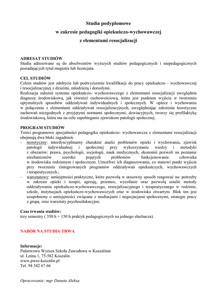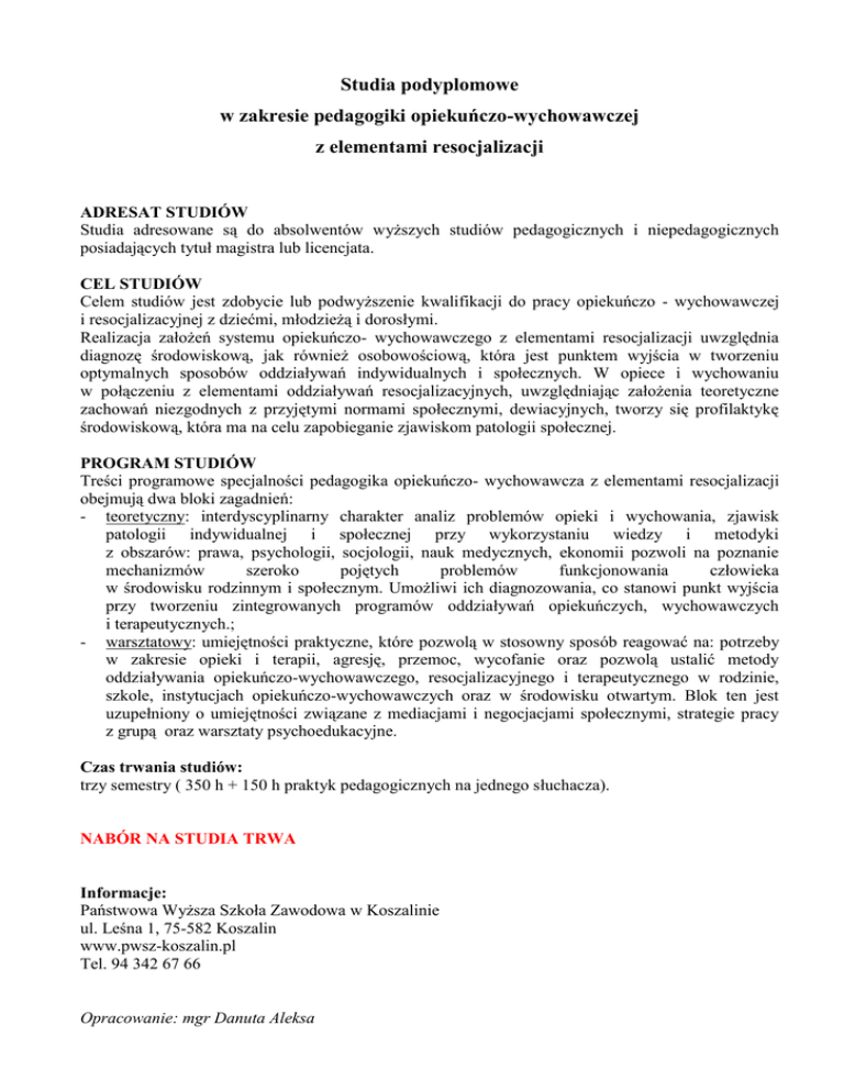 Studia podyplomowe w zakresie pedagogiki opiekuńczo-wychowawczej z elementami resocjalizacji ADRESAT STUDIÓW Studia adresowane są do absolwentów wyższych studiów pedagogicznych i niepedagogicznych posiadających tytuł magistra lub licencjata. CEL STUDIÓW Celem studiów jest zdobycie lub podwyższenie kwalifikacji do pracy opiekuńczo - wychowawczej i resocjalizacyjnej z dziećmi, młodzieżą i dorosłymi. Realizacja założeń systemu opiekuńczo- wychowawczego z elementami resocjalizacji uwzględnia diagnozę środowiskową, jak również osobowościową, która jest punktem wyjścia w tworzeniu optymalnych sposobów oddziaływań indywidualnych i społecznych. W opiece i wychowaniu w połączeniu z elementami oddziaływań resocjalizacyjnych, uwzględniając założenia teoretyczne zachowań niezgodnych z przyjętymi normami społecznymi, dewiacyjnych, tworzy się profilaktykę środowiskową, która ma na celu zapobieganie zjawiskom patologii społecznej. PROGRAM STUDIÓW Treści programowe specjalności pedagogika opiekuńczo- wychowawcza z elementami resocjalizacji obejmują dwa bloki zagadnień: - teoretyczny: interdyscyplinarny charakter analiz problemów opieki i wychowania, zjawisk patologii indywidualnej i społecznej przy wykorzystaniu wiedzy i metodyki z obszarów: prawa, psychologii, socjologii, nauk medycznych, ekonomii pozwoli na poznanie mechanizmów szeroko pojętych problemów funkcjonowania człowieka w środowisku rodzinnym i społecznym. Umożliwi ich diagnozowania, co stanowi punkt wyjścia przy tworzeniu zintegrowanych programów oddziaływań opiekuńczych, wychowawczych i terapeutycznych.; - warsztatowy: umiejętności praktyczne, które pozwolą w stosowny sposób reagować na: potrzeby w zakresie opieki i terapii, agresję, przemoc, wycofanie oraz pozwolą ustalić metody oddziaływania opiekuńczo-wychowawczego, resocjalizacyjnego i terapeutycznego w rodzinie, szkole, instytucjach opiekuńczo-wychowawczych oraz w środowisku otwartym. Blok ten jest uzupełniony o umiejętności związane z mediacjami i negocjacjami społecznymi, strategie pracy z grupą oraz warsztaty psychoedukacyjne. Czas trwania studiów: trzy semestry ( 350 h + 150 h praktyk pedagogicznych na jednego słuchacza). NABÓR NA STUDIA TRWA Informacje: Państwowa Wyższa Szkoła Zawodowa w Koszalinie ul. Leśna 1, 75-582 Koszalin www.pwsz-koszalin.pl Tel. 94 342 67 66 Opracowanie: mgr Danuta Aleksa