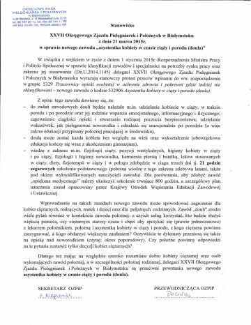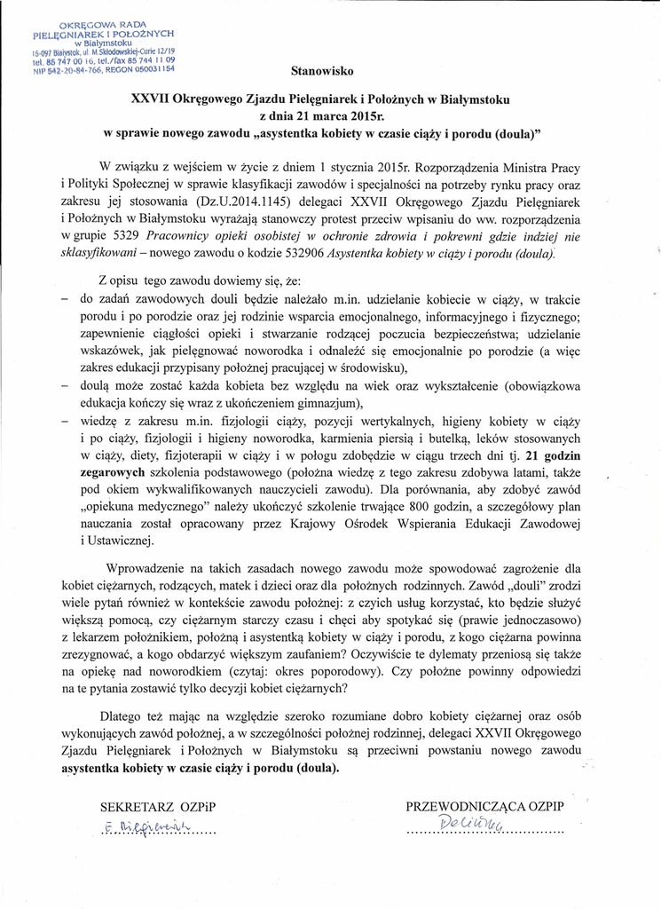 OKRĘGOWA RADA PIEt.ĘQN/AREK I POŁOŻNYCH w Białymstoku 15·097 atał'l$tok, ul. MSklodowskiej-Curie 12119 tel. 85 747 00 16. teUrax 85 744 II 09 NIP 542-10·8<\-766, REGON 050031154 Stanowisko XXVII Okręgowego Zjazdu Pielęgniarek i Położnych w Białymstoku z dnia 21 marca 2015r. w sprawie nowego zawodu "asystentka kobiety w czasie ciąży iporodu (doula)" W związku z wejściem w życie z dniem 1 stycznia 2015r. Rozporządzenia Ministra Pracy i Polityki Społecznej w sprawie klasyfikacji zawodów i specjalności na potrzeby rynku pracy oraz zakresu jej stosowania (Dz.U.2014.1145) delegaci XXVII Okręgowego Zjazdu Pielęgniarek i Położnych w Białymstoku wyrażają stanowczy protest przeciw wpisaniu do ww. rozporządzenia w grupie 5329 Pracownicy opieki osobistej w ochronie zdrowia i pokrewni gdzie indziej nie sklasyfikowani - nowego zawodu o kodzie 532906 Asystentka kobiety w ciqży i porodu (doula). Z opisu tego zawodu dowiemy się, że: do zadań zawodowych douli będzie należało m.in. udzielanie kobiecie w ciąży, w trakcie porodu i po porodzie oraz jej rodzinie wsparcia emocjonalnego, informacyjnego i fizycznego; zapewnienie ciągłości opieki i stwarzanie rodzącej poczucia bezpieczeństwa; udzielanie wskazówek, jak pielęgnować noworodka i odnaleźć się emocjonalnie po porodzie (a więc zakres edukacji przypisany położnej pracującej w środowisku), - doulą może zostać każda kobieta bez względu na wiek oraz wykształcenie edukacja kończy się wraz z ukończeniem gimnazjum), (obowiązkowa wiedzę z zakresu m.in. fizjologii ciąży, pozycji wertykalnych, higieny kobiety w ciąży i po ciąży, fizjologii i higieny noworodka, karmienia piersią i butelką, leków stosowanych w ciąży, diety, fizjoterapii w ciąży i w połogu zdobędzie w ciągu trzech dni tj. 21 godzin zegarowych szkolenia podstawowego (położna wiedzę z tego zakresu zdobywa latami, także pod okiem wykwalifikowanych nauczycieli zawodu). Dla porównania, aby zdobyć zawód "opiekuna medycznego" należy ukończyć szkolenie trwające 800 godzin, a szczegółowy plan nauczania został opracowany przez Krajowy Ośrodek Wspierania Edukacji Zawodowej i Ustawicznej. Wprowadzenie na takich zasadach nowego zawodu może spowodować zagrożenie dla kobiet ciężarnych, rodzących, matek i dzieci oraz dla położnych rodzinnych. Zawód "douli" zrodzi wiele pytań również w kontekście zawodu położnej: z czyich usług korzystać, kto będzie służyć większą pomocą, czy ciężarnym starczy czasu i chęci aby spotykać się (prawie jednoczasowo ) z lekarzem położnikiem, położną i asystentką kobiety w ciąży i porodu, z kogo ciężarna powinna zrezygnować, a kogo obdarzyć większym zaufaniem? Oczywiście te dylematy przeniosą się także na opiekę nad noworodkiem (czytaj: okres poporodowy). Czy położne powinny odpowiedzi na te pytania zostawić tylko decyzji kobiet ciężarnych? Dlatego też mając na względzie szeroko rozumiane dobro kobiety ciężarnej oraz osób wykonujących zawód położnej, a w szczególności położnej rodzinnej, delegaci XXVII Okręgowego Zjazdu Pielęgniarek i Położnych w Białymstoku są przeciwni powstaniu nowego zawodu asystentka kobiety w czasie ciąży i porodu (doula). PRZEWODNICZĄCA SEKRETARZ OZPiP f ~ ~ - ~Iv ........ . .......T?~:~~1!k OZPIP .