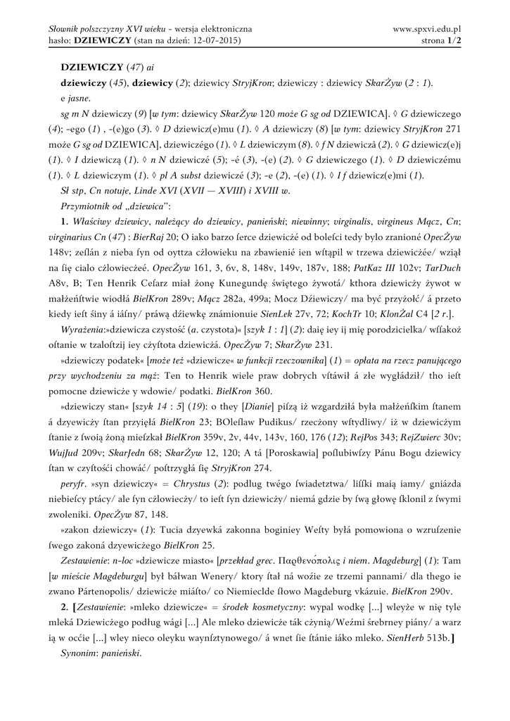 Słownik polszczyzny XVI wieku - wersja elektroniczna hasło: DZIEWICZY (stan na dzień: 12-07-2015) www.spxvi.edu.pl strona 1/2 DZIEWICZY (47) ai dziewiczy (45), dziewicy (2); dziewicy StryjKron; dziewiczy : dziewicy SkarŻyw (2 : 1). e jasne. sg m N dziewiczy (9) [w tym: dziewicy SkarŻyw 120 może G sg od DZIEWICA]. ◊ G dziewiczego (4); -ego (1) , -(e)go (3). ◊ D dziewicz(e)mu (1). ◊ A dziewiczy (8) [w tym: dziewicy StryjKron 271 może G sg od DZIEWICA], dziewiczégo (1). ◊ L dziewiczym (8). ◊ f N dziewiczå (2). ◊ G dziewicz(e)j (1). ◊ I dziewiczą (1). ◊ n N dziewiczé (5); -é (3), -(e) (2). ◊ G dziewiczego (1). ◊ D dziewiczému (1). ◊ L dziewiczym (1). ◊ pl A subst dziewiczé (3); -e (2), -(e) (1). ◊ I f dziewicz(e)mi (1). Sł stp, Cn notuje, Linde XVI (XVII — XVIII) i XVIII w. Przymiotnik od „dziewica”: 1. Właściwy dziewicy, należący do dziewicy, panieński; niewinny; virginalis, virgineus Mącz, Cn; virginarius Cn (47) : BierRaj 20; O iako barzo ſerce dziewicżé od boleſci tedy bylo zranioné OpecŻyw 148v; zeſlán z nieba ſyn od oyttza cżlowieku na zbawienié ien wſtąpil w trzewa dziewicżée/ wziął na ſię cialo cżlowiecżeé. OpecŻyw 161, 3, 6v, 8, 148v, 149v, 187v, 188; PatKaz III 102v; TarDuch A8v, B; Ten Henrik Ceſarz miał żonę Kunegundę świętego żywotá/ kthora dziewicży żywot w małżeńſtwie wiodłá BielKron 289v; Mącz 282a, 499a; Mocz Dźiewiczy/ ma być przyżołć/ á przeto kiedy ieſt śiny á iáſny/ práwą dźiewkę známionuie SienLek 27v, 72; KochTr 10; KlonŻal C4 [2 r.]. Wyrażenia:»dziewicza czystość (a. czystota)« [szyk 1 : 1] (2): daię iey ij mię porodzicielka/ wſſakoż oſtanie w tzaloſtzij iey cżyſtota dziewicżá. OpecŻyw 7; SkarŻyw 231. »dziewiczy podatek« [może też »dziewicze« w funkcji rzeczownika] (1) = opłata na rzecz panującego przy wychodzeniu za mąż: Ten to Henrik wiele praw dobrych vſtáwił á złe wygłádził/ tho ieſt pomocne dziewicże y wdowie/ podatki. BielKron 360. »dziewiczy stan« [szyk 14 : 5] (19): o they [Dianie] piſzą iż wzgardziłá była małżeńſkim ſtanem á dzyewicży ſtan przyięłá BielKron 23; BOleſlaw Pudikus/ rzecżony wſtydliwy/ iż w dziewicżym ſtanie z ſwoią żoną mieſzkał BielKron 359v, 2v, 44v, 143v, 160, 176 (12); RejPos 343; RejZwierc 30v; WujJud 209v; SkarJedn 68; SkarŻyw 12, 120; A tá [Poroskawia] poſlubiwſzy Pánu Bogu dziewicy ſtan w czyſtośći chowáć/ poſtrzygłá ſię StryjKron 274. peryfr. »syn dziewiczy« = Chrystus (2): podlug twégo ſwiadetztwa/ liſſki maią iamy/ gniázda niebieſcy ptácy/ ale ſyn cżlowiecży/ to ieſt ſyn dziewicży/ niemá gdzie by ſwą głowę ſklonil z ſwymi zwoleniki. OpecŻyw 87, 148. »zakon dziewiczy« (1): Tucia dzyewká zakonna boginiey Weſty byłá pomowiona o wzruſzenie ſwego zakoná dzyewicżego BielKron 25. Zestawienie: n-loc »dziewicze miasto« [przekład grec. Παρθενόπολις i niem. Magdeburg] (1): Tam [w mieście Magdeburgu] był báłwan Wenery/ ktory ſtał ná woźie ze trzemi pannami/ dla thego ie zwano Pártenopolis/ dziewicże miáſto/ co Niemieclde ſłowo Magdeburg vkázuie. BielKron 290v. 2. [Zestawienie: »mleko dziewicze« = środek kosmetyczny: wypal wodkę [...] wleyże w nię tyle mleká Dziewicżego podług wági [...] Ale mleko dziewicże ták cżynią/Weźmi śrebrney piány/ a warz ią w ocćie [...] wley nieco oleyku waynſztynowego/ á wnet ſie ſtánie iáko mleko. SienHerb 513b.] Synonim: panieński. Słownik polszczyzny XVI wieku - wersja elektroniczna hasło: DZIEWICZY (stan na dzień: 12-07-2015) www.spxvi.edu.pl strona 2/2 SB