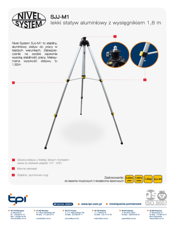 SJJ-M1 lekki statyw aluminiowy z wysiêgnikiem 1,8 m 1 Nivel System SJJ-M1 to stabilny, aluminiowy statyw do pracy w ka¿dych warunkach. Zabezpieczenie na zaciski zapewnia wysok¹ stabilnośæ pracy. Maksymalna wysokośæ statywu to 1,82m 2 3 1 G³owica statywu z libelk¹ i ³atwym monta¿em lasera (w zestawie adapter 1/4” - 5/8”) 2 Mocne zatrzaski 3 Stabilne, aluminiowe nogi Zastosowanie: do laserów krzy¿owych i niwelatorów laserowych 0,62m min 1,82m max 1,6kg SJJ-M1