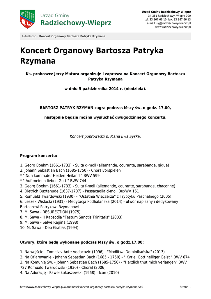 Urząd Gminy Radziechowy-Wieprz 34-381 Radziechowy, Wieprz 700 tel. 33 867 66 10, fax. 33 867 66 13 e-mail: [email protected] www.radziechowy-wieprz.pl Aktualności › Koncert Organowy Bartosza Patryka Rzymana Koncert Organowy Bartosza Patryka Rzymana Ks. proboszcz Jerzy Matura organizuje i zaprasza na Koncert Organowy Bartosza Patryka Rzymana w dniu 5 października 2014 r. (niedziela). BARTOSZ PATRYK RZYMAN zagra podczas Mszy św. o godz. 17.00, następnie będzie można wysłuchać dwugodzinnego koncertu. Koncert poprowadzi p. Maria Ewa Syska. Program koncertu: 1. Georg Boehm (1661-1733) - Suita d-moll (allemande, courante, sarabande, gigue) 2. Johann Sebastian Bach (1685-1750) - Choralvorspielen * " Nun komm,der Heiden Heiland " BWV 599 * " Auf meinen lieben Gott " BWV 744 3. Georg Boehm (1661-1733) - Suita f-moll (allemande, courante, sarabande, chaconne) 4. Dietrich Buxtehude (1637-1707) - Passacaglia d-moll BuxWV 161 5. Romuald Twardowski (1930) – "Ostatnia Wieczerza" z Tryptyku Paschalnego (2005) 6. Leszek Wisłocki (1931) - Medytacja Podhalańska (2014) - utwór napisany i dedykowany Bartoszowi Patrykowi Rzymanowi 7. M. Sawa - RESURECTION (1975) 8. M. Sawa - II Rapsodia "Festum Sanctis Trinitatis" (2003) 9. M. Sawa - Salve Regina (1998) 10. M. Sawa - Deo Gratias (1994) Utwory, które będą wykonane podczas Mszy św. o godz.17.00: 1. Na wejście - Tomislav Ante Vodacović (1996) - "Modlitwa Dominikańska" (2013) 2. Na Ofiarowanie - Johann Sebastian Bach (1685 - 1750) - " Kyrie, Gott heiliger Geist " BWV 674 3. Na Komunię Św. - Johann Sebastian Bach (1685-1750) - "Herzlich thut mich verlangen" BWV 727 Romuald Twardowski (1930) - Chorał (2006) 4. Na Adorację - Paweł Łukaszewski (1968) - Icon (2010) http://www.radziechowy-wieprz.pl/aktualnosci/koncert-organowy-bartosza-patryka-rzymana,549 Strona 1
