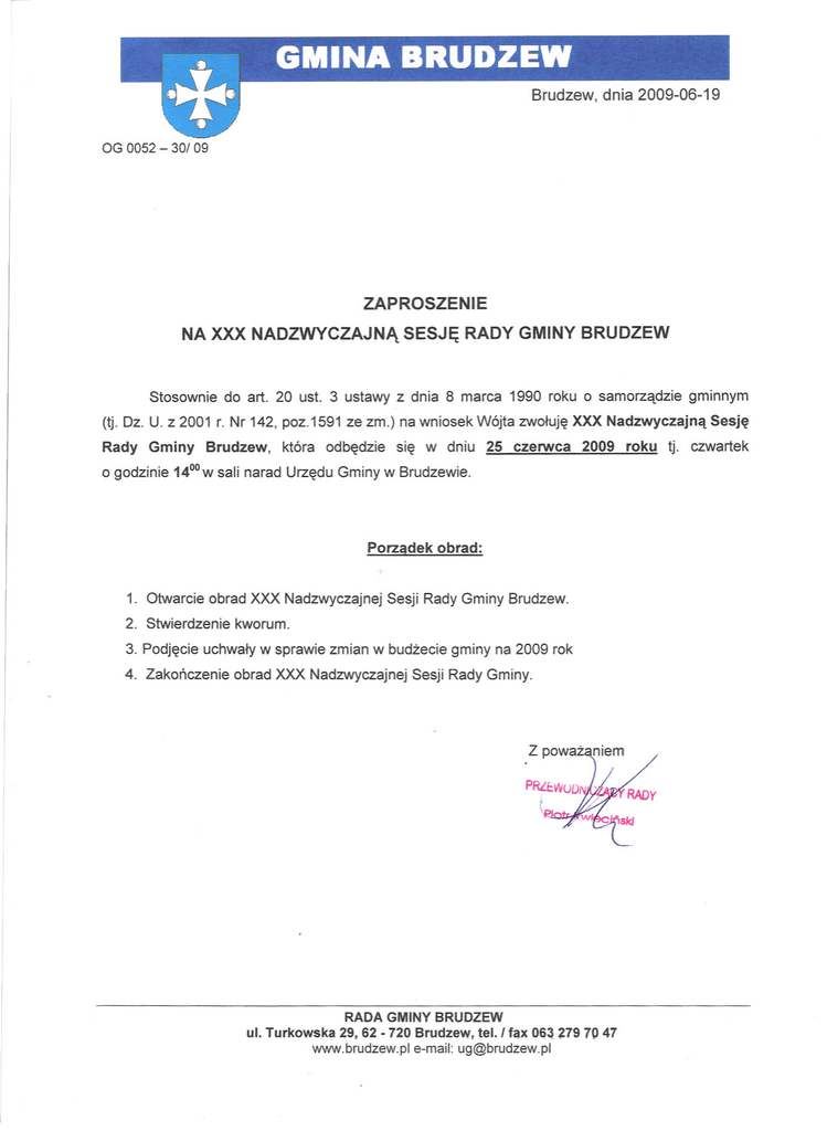 OG 0052 - 301 09 ZAPROSZENIE NA XXX NADZWYCZAJNA SESJE RADY GMINY BRUDZEW Stosownie do art. 20 ust. 3 ustawy z dnia 8 marca 1990 roku o samorzadzie gminnym (tj. Dz. U. z 2001 r. Nr 142, poz.1591 ze zm.) na wniosek Wójta zwoluje XXXNadzwyczajna Sesje Rady Gminy Brudzew, która odbedzie sie w dniu 25 czerwca 2009 roku tj. czwartek o godzinie1400w sali naradUrzeduGminyw Brudzewie. Porzadek obrad: 1. Otwarcie obrad XXX Nadzwyczajnej Sesji Rady Gminy Brudzew. 2. Stwierdzenie kworum. 3. Podjecie uchwaly w sprawie zmian w budzecie gminy na 2009 rok 4. Zakonczenie obrad XXX Nadzwyczajnej Sesji Rady Gminy. RADA GMINY BRUDZEW ul. Turkowska 29, 62 -720 Brudzew,tel.l fax 06~~797()47 www.brudzew.pl e-mail: [email protected]
