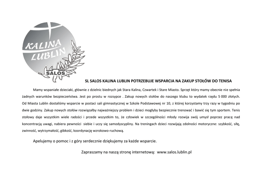 SL SALOS KALINA LUBLIN POTRZEBUJE WSPARCIA NA ZAKUP STOŁÓW DO TENISA Mamy wspaniałe dzieciaki, głównie z dzielnic biednych jak Stara Kalina, Czwartek i Stare Miasto. Sprzęt który mamy obecnie nie spełnia żadnych warunków bezpieczeństwa. Jest po prostu w rozsypce . Zakup nowych stołów do naszego klubu to wydatek rzędu 5 000 złotych. Od Miasta Lublin dostaliśmy wsparcie w postaci sali gimnastycznej w Szkole Podstawowej nr 10, z której korzystamy trzy razy w tygodniu po dwie godziny. Zakup nowych stołów rozwiązałby najważniejszy problem i dzieci mogłyby bezpiecznie trenować i bawić się tym sportem. Tenis stołowy daje wszystkim wiele radości i przede wszystkim to, że człowiek w szczególności młody rozwija swój umysł poprzez pracę nad koncentracją uwagi, nabiera pewności siebie i uczy się samodyscypliny. Na treningach dzieci rozwijają zdolności motoryczne: szybkość, siłę, zwinność, wytrzymałość, gibkość, koordynację wzrokowo-ruchową. Apelujemy o pomoc i z góry serdecznie dziękujemy za każde wsparcie. Zapraszamy na naszą stronę internetową: www.salos.lublin.pl