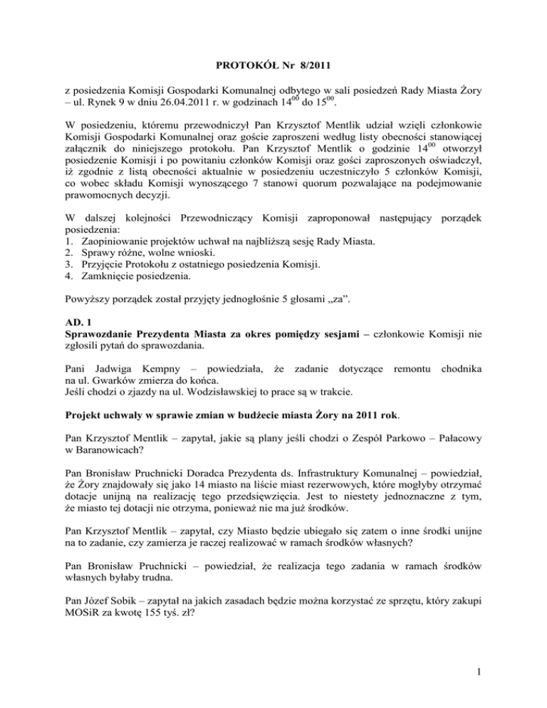 PROTOKÓŁ Nr 8/2011 z posiedzenia Komisji Gospodarki Komunalnej odbytego w sali posiedzeń Rady Miasta śory – ul. Rynek 9 w dniu 26.04.2011 r. w godzinach 1400 do 1500. W posiedzeniu, któremu przewodniczył Pan Krzysztof Mentlik udział wzięli członkowie Komisji Gospodarki Komunalnej oraz goście zaproszeni według listy obecności stanowiącej załącznik do niniejszego protokołu. Pan Krzysztof Mentlik o godzinie 1400 otworzył posiedzenie Komisji i po powitaniu członków Komisji oraz gości zaproszonych oświadczył, iŜ zgodnie z listą obecności aktualnie w posiedzeniu uczestniczyło 5 członków Komisji, co wobec składu Komisji wynoszącego 7 stanowi quorum pozwalające na podejmowanie prawomocnych decyzji. W dalszej kolejności Przewodniczący Komisji zaproponował następujący porządek posiedzenia: 1. Zaopiniowanie projektów uchwał na najbliŜszą sesję Rady Miasta. 2. Sprawy róŜne, wolne wnioski. 3. Przyjęcie Protokołu z ostatniego posiedzenia Komisji. 4. Zamknięcie posiedzenia. PowyŜszy porządek został przyjęty jednogłośnie 5 głosami „za”. AD. 1 Sprawozdanie Prezydenta Miasta za okres pomiędzy sesjami – członkowie Komisji nie zgłosili pytań do sprawozdania. Pani Jadwiga Kempny – powiedziała, Ŝe zadanie dotyczące remontu chodnika na ul. Gwarków zmierza do końca. Jeśli chodzi o zjazdy na ul. Wodzisławskiej to prace są w trakcie. Projekt uchwały w sprawie zmian w budŜecie miasta śory na 2011 rok. Pan Krzysztof Mentlik – zapytał, jakie są plany jeśli chodzi o Zespół Parkowo – Pałacowy w Baranowicach? Pan Bronisław Pruchnicki Doradca Prezydenta ds. Infrastruktury Komunalnej – powiedział, Ŝe śory znajdowały się jako 14 miasto na liście miast rezerwowych, które mogłyby otrzymać dotacje unijną na realizację tego przedsięwzięcia. Jest to niestety jednoznaczne z tym, Ŝe miasto tej dotacji nie otrzyma, poniewaŜ nie ma juŜ środków. Pan Krzysztof Mentlik – zapytał, czy Miasto będzie ubiegało się zatem o inne środki unijne na to zadanie, czy zamierza je raczej realizować w ramach środków własnych? Pan Bronisław Pruchnicki – powiedział, Ŝe realizacja tego zadania w ramach środków własnych byłaby trudna. Pan Józef Sobik – zapytał na jakich zasadach będzie moŜna korzystać ze sprzętu, który zakupi MOSiR za kwotę 155 tyś. zł? 1 Pan Daniel Wawrzyczek Doradca Prezydenta ds. Gospodarki Przestrzennej – powiedział, Ŝe zostanie opracowany regulamin, harmonogram. Pan Krzysztof Mentlik – powiedział, Ŝe na posiedzenie Komisji Kultury, Sportu i MłodzieŜy został zaproszony Dyrektor MOSiR i na pewno będzie równieŜ dyskusja w tym temacie. Dodał, Ŝe załoŜenie było takie, aby wszystkie Kluby mogły korzystać ze sprzętu sprawiedliwie. Projekt uchwały w sprawie zmian w wieloletniej prognozie finansowej miasta śory na lata 2011 – 2024 – Komisja nie omawiała projektu uchwały. Projekt uchwały w sprawie uchylenia Uchwały Nr 59/VI/11 Rady Miasta śory z dnia 31 marca 2011 r. – Komisja nie omawiała projektu uchwały. Projekt uchwały w sprawie ustalenia dla miasta śory liczby punktów sprzedaŜy napojów alkoholowych zawierających powyŜej 4,5% alkoholu (z wyjątkiem piwa), przeznaczonych do spoŜycia poza miejscem sprzedaŜy jak i w miejscu sprzedaŜy. Pan Krzysztof Mentlik – zapytał o ilość punktów sprzedaŜy? Pan Daniel Wawrzyczek – odpowiedział, Ŝe ogółem jest 220 punktów sprzedaŜy, z tego 120 punktów ma pozwolenie do spoŜywania alkoholu na miejscu (112 – 116 wydanych koncesji), a 100 do sprzedaŜy alkoholu na wynos (96 wydanych koncesji). Pan Piotr Huzarewicz – zapytał, czy jest dostępny wykaz punktów sprzedaŜy alkoholu? Pan Daniel Wawrzyczek – powiedział, Ŝe wykaz taki prowadzi Zespół Stowarzyszeń i Przedsiębiorczości. Dodał, Ŝe uchwała ta tak naprawdę dotyczy jednego obiektu. Jeśli chodzi o odległość 50 m to wynika ona z uchwały Rady Miasta, ustawa nie mówi nic na temat odległości. Pan Jerzy Marciniak – zapytał, czy jest określona odległość od głównych deptaków, którymi np. dzieci idą do szkoły? Pan Daniel Wawrzyczek – powiedział, Ŝe w ustawie nie ma w ogóle Ŝadnych ograniczeń. Jest tylko mowa o obiektach uŜyteczności publicznej. Projekt uchwały w sprawie zmiany uchwały nr 47/IV/03 Rady Miasta śory z dnia 30.01.2003 r. z późn. zmianą – Komisja nie omawiała projektu uchwały. Projekt uchwały w sprawie ustalenia zasad i trybu przyznawania wyróŜnień i nagród za wysokie wyniki we współzawodnictwie sportowym – Komisja nie omawiała projektu uchwały. Projekt uchwały w sprawie określenia zasad i trybu przyznawania, pozbawiania oraz wysokości stypendiów sportowych dla zawodników osiągających wysokie wyniki sportowe w międzynarodowym lub krajowym współzawodnictwie - Komisja nie omawiała projektu uchwały. 2 Projekt uchwały w sprawie zasad udzielania spółkom wodnym dotacji celowej z budŜetu Miasta śory oraz trybu postępowania w sprawie udzielenia dotacji i sposobu jej rozliczania – Komisja nie omawiała projektu uchwały. Projekt uchwały w sprawie dokonania zmiany treści Uchwały Nr 63/VI/2011 Rady Miasta śory z dnia 31.03.2011 r. w sprawie przekazania Komendzie Miejskiej Policji w śorach środków finansowych. Pan Daniel Wawrzyczek – powiedział, Ŝe chodzi o niewielką zmianę. Trzeba poprawić rok z 2010 na 2011. Pan Krzysztof Mentlik poddał pod głosowanie pozytywne zaopiniowanie powyŜszego projektu uchwały, który przyjęto pozytywnie jednogłośnie 6 głosami „za”. AD. 2 Pan Krzysztof Mentlik powiedział, Ŝe do Komisji wpłynęło pismo Przewodniczącego Dzielnicy Sikorskiego w sprawie schodów pomiędzy Klimawentem, a Witasportem. Mieszkańcy os. Sikorskiego i os. Pawlikowskiego regularnie zgłaszają problem z przejściem pomiędzy tymi osiedlami. Pan Michał Miłek – powiedział, Ŝe chodzi o połączenie pomiędzy tymi osiedlami. Przejście które