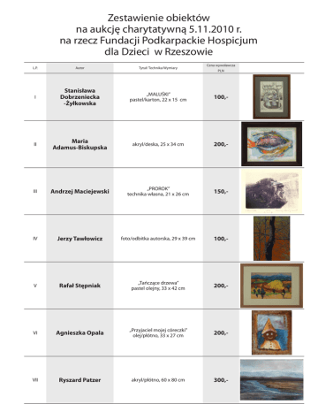 Zestawienie obiektów na aukcję charytatywną 5.11.2010 r. na rzecz Fundacji Podkarpackie Hospicjum dla Dzieci w Rzeszowie Cena wywoławcza L.P. Autor Tytuł/ Technika/Wymiary I Stanisława Dobrzeniecka -Żyłkowska „MALUŚKI” pastel/karton, 22 x 15 cm 100,- II Maria Adamus-Biskupska akryl/deska, 25 x 34 cm 200,- III Andrzej Maciejewski „PROROK” technika własna, 21 x 26 cm 150,- IV Jerzy Tawłowicz foto/odbitka autorska, 29 x 39 cm 100,- V Rafał Stępniak „Tańczące drzewa” pastel olejny, 33 x 42 cm 200,- VI Agnieszka Opala „Przyjaciel mojej córeczki” olej/płótno, 33 x 27 cm 200,- VII Ryszard Patzer akryl/płótno, 60 x 80 cm 300,- PLN VIII Barbara Frankiewicz „Impresja B” olej/płótno, 35 x 40 cm 300,- IX Robert Hübner linoryt III/CX, 23,5 x 16,5 cm 150,- X Piotr Butkiewicz „Rzeka” olej/płótno, 40 x 60 cm 300,- XI Leszek Czajka BEZ TYTUŁU gwarz/papier, 50 x 70 cm 200,- XII Jerzy Tawłowicz foto/odbitka autorska, 29 x 39 cm 100,- XIII Andrzej Maciejewski „Adam i Ewa” technika mieszana, 47 x 45 cm 150,- XIV Przemko Stachowski „Notatka” olej, 50 x 70 cm 300,- XV Benedykt Kroplewski uławy po wykopkach” olej, 22 x 37 cm 150,- XVI Kiejstut Bereźnicki „Studium w stylu włoskim” serigrafia, 22 x 15 cm 100,- XVII Marian Danielewicz „Notatki z pejzażu” olej/płótno, 15 x 34 cm 250,- XVIII Izabela Kita tryptyk/pastel, 3 x (24 x 21 cm) 300,- XIX Jerzy Tawłowicz foto/odbitka autorska, 29 x 39 cm 100,- XX Rafał Stępniak „Jest taki dzień” serigrafia VI/X, 15 x 21 cm 100,- XXI Artur Kardamasz „Róże”, akryl, 33 x 25 cm 200,- XXII Andrzej Maciejewski „Kot zimowy” technika własna, 21 x 26 cm 150,- XXIII Zbigniew Chrostek z cyklu Kontrapunkt akryl/płótno, 40 x 60 cm 300,-