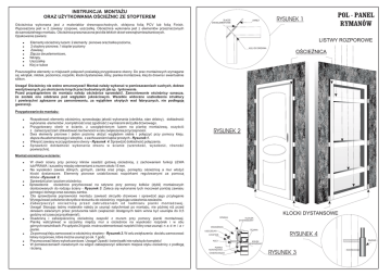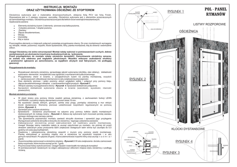 INSTRUKCJA MONTA¯U ORAZ U¯YTKOWANIA OŒCIE¯NIC ZE STOPTEREM Oœcie¿nica wykonana jest z materia³ów drewnopochodnych, oklejona foli¹ PCV lub foli¹ Finish. Wyposa¿ona jest w 2 zawiasy czopowe, uszczelkê. Oœcie¿nica wykonana jest z elementów przeznaczonych do samodzielnego monta¿u. Oœcie¿nica przeznaczona jest dla lekkich drzwi wewn¹trzmieszkaniowych. Opakowanie zawiera: ! ! ! ! ! ! ! WKRÊT Z£¥CZE DWUELEMENTOWE POL - PANEL RYMANÓW RYSUNEK 1 LISTWY ROZPOROWE Elementy oœcie¿nicy luzem: 2 elementy pionowe oraz belka pozioma, 2 stoptery pionowe, 1 stopter poziomy Zawiasy, Z³¹cza dwuelementowe, Wkrêty. Uszczelkê Klej w tubce KLEJ DO DREWNA OŒCIE¯NICA Poszczególne elementy w miejscach po³¹czeñ posiadaj¹ przygotowane otwory. Do prac monta¿owych wymagane s¹: wkrêtak, m³otek, poziomica, rozpórki, klocki dystansowe, kliny, pianka monta¿owa, klej do drewna i ewentualnie silikon. Uwaga! Oœcie¿nicy nie wolno wmurowywaæ! Monta¿ nale¿y wykonaæ w pomieszczeniach suchych, dobrze wentylowanych, po ukoñczeniu innych prac budowlanych jak np. tynkowanie. Przed przyst¹pieniem do monta¿u nale¿y oœcie¿nice sprawdziæ!. Zamontowanie oœcie¿nicy oznacza, ¿e zosta³a ona odebrana pod wzglêdem jakoœciowym. Wszelkie widoczne uszkodzenia struktury i powierzchni zg³oszone po zamontowaniu, za wyj¹tkiem ukrytych wad fabrycznych, nie podlegaj¹ gwarancji. Przygotowanie do monta¿u: ! ! ! ! ! Rozpakowaæ elementy oœcie¿nicy, sprawdzaj¹c jakoœæ wykonania (obróbka, stan okleiny), dok³adnoœæ wykonania elementów , kompletnoœæ oraz zgodnoœæ z wymiarami skrzyd³a drzwiowego. Przygotowany otwór w œcianie, z uwzglêdnionym luzem na piankê monta¿ow¹, oczyœciæ z zanieczyszczeñ i zlikwidowaæ nierównoœci w celu zwiêkszenia przyczepnoœci. Dwa elementy pionowe i jeden poziomy u³o¿yæ wzglêdem siebie i po³¹czyæ przy pomocy kleju, z³¹cza dwuelementowego i wkrêtów, z zachowaniem k¹tów prostych - Rysunek 1. Wkrêciæ zawiasy w przygotowane otwory - Rysunek 4. Sprawdziæ dok³adnoœæ po³¹czenia. Sprawdziæ dok³adnoœæ wykonania otworu w œcianie (szerokoœæ, wysokoœæ, równoœæ powierzchni). RYSUNEK 2 Monta¿ oœcie¿nicy w œcianie: ! ! ! ! ! ! ! ! ! ! W otwór œciany przy pomocy klinów osadziæ gotow¹ oœcie¿nicê, z zachowaniem funkcji LEWA lub PRAWA i szczeliny miêdzy elementami a murem oko³o 15 mm. Na wysokoœci zawias dolnych, górnych, zamka oraz progu, pomiêdzy oœcie¿nicê a mur w³o¿yæ klocki dystansowe. Elementy pionowe ustabilizowaæ rozpórkami regulowanymi za pomoc¹ klinów - Rysunek 2. Sprawdziæ pion i poziom oœcie¿nicy. Sprawdzone oœcie¿nice przymocowaæ na sztywno przy pomocy ko³ków (dybli) monta¿owych dostosowanych do rodzaju œciany - Rysunek 3. Zaleca siê wykonanie tych mocowañ poni¿ej zawiasu górnego i dolnego oraz zaczepu zamka. Dla sprawdzenia poprawnoœci monta¿u zawiesiæ skrzyd³o drzwiowe i sprawdziæ jego przyleganie Wyregulowaæ po³o¿enie skrzyd³a w stosunku do oœcie¿nicy reguluj¹c ustawienia zawiasów. Zabezpieczyæ oœcie¿nicê przed zabrudzeniem od nadmiaru pianki monta¿owej. Uwaga! Stosuj¹c taœmy malarskie nale¿y je usun¹æ natychmiast po monta¿u, nie póŸniej ni¿ przed okresem zalecanym przez producenta taœm (wiêkszoœæ dostêpnych taœm winna byæ usuniêta do 0,5 godziny od czasu jej przyklejenia!). Osadzon¹ i zabezpieczon¹ oœcie¿nicê zespoliæ z murem przy pomocy pianki monta¿owej. Piankê wstrzykiwaæ w szczeliny miêdzy mur a oœcie¿nice na wysokoœci rozpórek i w obu górnych naro¿nikach. Po up³ywie 24 godz. mo¿na zdemontowaæ rozpórki i kliny oraz usun¹æ n a d m i a r pianki. Za pomoc¹ kleju zamocowaæ w oœcie¿nicy stoptery - Rysunek 3. W celu zwiêkszenia docisku zamocowaæ listwy rozporowe, które mo¿na usun¹æ po ok. 1 godz. Przymocowaæ listwy wykoñczeniowe. Uwaga! Opaski i æwieræwa³ki nie nale¿¹ do kompletu! W pomieszczeniach nara¿onych na wilgoæ zabezpieczyæ silikonem miejsca styku oœcie¿nicy z pod³og¹ i œcian¹. KLOCKI DYSTANSOWE OPASKA KLOCEK DYSTANSOWY OŒCIE¯NICA USZCZELKA ŒCIANA STOPTER KLEJ PIANKA MONTA¯OWA ÆWIERÆWA£EK RYSUNEK 4 ZAWIAS KO£EK MONTA¯OWY RYSUNEK 3