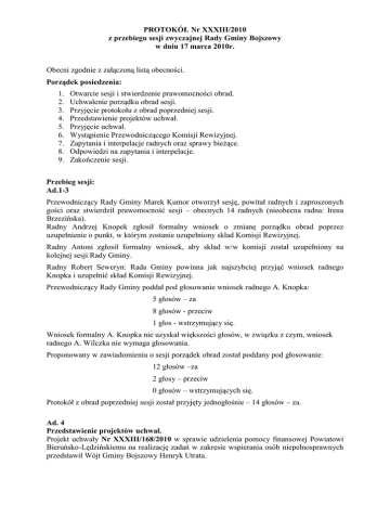 PROTOKÓŁ Nr XXXIII/2010 z przebiegu sesji zwyczajnej Rady Gminy Bojszowy w dniu 17 marca 2010r. Obecni zgodnie z załączoną listą obecności. Porządek posiedzenia: 1. 2. 3. 4. 5. 6. 7. 8. 9. Otwarcie sesji i stwierdzenie prawomocności obrad. Uchwalenie porządku obrad sesji. Przyjęcie protokołu z obrad poprzedniej sesji. Przedstawienie projektów uchwał. Przyjęcie uchwał. Wystąpienie Przewodniczącego Komisji Rewizyjnej. Zapytania i interpelacje radnych oraz sprawy bieżące. Odpowiedzi na zapytania i interpelacje. Zakończenie sesji. Przebieg sesji: Ad.1-3 Przewodniczący Rady Gminy Marek Kumor otworzył sesję, powitał radnych i zaproszonych gości oraz stwierdził prawomocność sesji – obecnych 14 radnych (nieobecna radna: Irena Brzezińska). Radny Andrzej Knopek zgłosił formalny wniosek o zmianę porządku obrad poprzez uzupełnienie o punkt, w którym zostanie uzupełniony skład Komisji Rewizyjnej. Radny Antoni zgłosił formalny wniosek, aby skład w/w komisji został uzupełniony na kolejnej sesji Rady Gminy. Radny Robert Seweryn: Rada Gminy powinna jak najszybciej przyjąć wniosek radnego Knopka i uzupełnić skład Komisji Rewizyjnej. Przewodniczący Rady Gminy poddał pod głosowanie wniosek radnego A. Knopka: 5 głosów – za 8 głosów - przeciw 1 głos - wstrzymujący się. Wniosek formalny A. Knopka nie uzyskał większości głosów, w związku z czym, wniosek radnego A. Wilczka nie wymaga głosowania. Proponowany w zawiadomieniu o sesji porządek obrad został poddany pod głosowanie: 12 głosów –za 2 głosy – przeciw 0 głosów – wstrzymujących się. Protokół z obrad poprzedniej sesji został przyjęty jednogłośnie – 14 głosów – za. Ad. 4 Przedstawienie projektów uchwał. Projekt uchwały Nr XXXIII/168/2010 w sprawie udzielenia pomocy finansowej Powiatowi Bieruńsko-Lędzińskiemu na realizację zadań w zakresie wspierania osób niepełnosprawnych przedstawił Wójt Gminy Bojszowy Henryk Utrata. Pomoc finansowa udzielona Powiatowi jest przeznaczona na realizację zadań statutowych stowarzyszenia opiekującego się osobami niepełnosprawnymi, tj. na zajęcia rehabilitacyjne takie jak: hydroterapia, dogoterapia, rehabilitacja domowa, zajęcia w świetlicy terapeutycznej, imprezy integracyjne (Mikołaj, Dzień Dziecka, Dzień Chorych, olimpiada niepełnosprawnych, biwak żeglarski, wycieczki integracyjne). Z opieki tej korzystają również mieszkańcy naszej Gminy, dlatego udzielenie wsparcia jest tu w pełni uzasadnione. Bez uwag. Projekt uchwały Nr XXXIII/169/2010 w sprawie wyrażenia zgody na odstąpienie od obowiązku przetargowego trybu zawarcia umowy dzierżawy. Wójt wniósł autopoprawkę w zakresie brzmienia §1. Dotychczasowy dzierżawca obiektu chce własnymi środkami finansowymi wykonać remont lokalu, przez co podniesie się standard usług i odnowionych pomieszczeń. Rada Gminy ma możliwość wyrazić zgodę na dzierżawę na okres 10 lat w trybie bezprzetargowym. Dzierżawa dotyczy sali i zaplecza kuchennego, nie dotyczy pomieszczeń socjalnych. Należy tu podkreślić, że umowa taka w każdej chwili i w odpowiednim trybie może zostać rozwiązana. Uwagi radnych: Radny Robert Seweryn: czy do dzisiejszej uchwały ma tez zastosowanie uchwała Rady Gminy Bojszowy z dnia 10.09.2003r. w sprawie przyjęcia zasad nabywania, zbywania i obciążania nieruchomości gruntowych oraz ich wydzierżawiania i wynajmowania na okres dłuższy niż trzy lata? Załącznik tej uchwały wymienia przesłanki pozwalające na wydzierżawienie nieruchomości na okres dłuższy niż 3 lata w trybie bezprzetargowym. Wójt: od tego roku obowiązuje nowelizacja ustawy – w/w przepis jest z nią niespójny. Radny R. Seweryn: wnioskuję o nowelizację uchwały w sprawie przyjęcia zasad nabywania, zbywania i obciążania nieruchomości gruntowych oraz ich wydzierżawiania i wynajmowania na okres dłuższy niż trzy lata. Wójt: projekt uchwały jest już przygotowywany. Radca Prawny Mirosław Nosalik: bez względu na uchwałę Rady z 2003 r., pierwszeństwo mają regulacje ustawowe. Radny A. Wilczek: dobrym rozwiązaniem jest wydzierżawienie tylko części pomieszczeń, tj. sali i zaplecza kuchennego. Projekt uchwały Nr XXXIII/170/2010 w sprawie wyrażenia zgody na wydzierżawienie nieruchomości na okres do 3 lat. W bieżącym roku wygasają umowy dzierżawy na nieruchomości wymienione w załączniku do projektu. Grunty te są dzierżawione przez rolników naszej gminy, którzy utrzymują je w tzw. kulturze rolnej. Podjęcie uchwały umożliwi dalsze użytkowanie nieruchomości. Uwagi radnych: Radny Rajmund Gondzik: czy wszystkie te grunty są dzierżawione przez rolników? Jakie są wpływy do budżetu z tytułu tych dzierżaw? Wójt: wszyscy dzierżawcy są rolnikami. Na wpływy te składają się podatki oraz stawki dzierżawne. Nie są to duże kwoty, ale dużym pożytkiem jest tu fakt, że ziemia ta jest uprawiana, nie leży odłogiem. Projekt uchwały Nr XXXIII/171/2010 w sprawie zgody na udzielenie bonifikaty od opłat rocznych za trwały zarząd. Uchwała jest konsekwencją kontroli RIO, która zwróciła uwagę, że GOPS nie może użytkować pomieszczeń na podstawie umowy najmu, należy takiej jednostce przekazać nieruchomość w trwały zarząd. Dookreślono powierzchnię pomieszczeń zajmowanych przez GOPS oraz przypisano ułamkową część gruntu, na którym GOPS prowadzi swoją działalność. Za nieruchomość oddaną w trwały zarząd pobiera się opłaty roczne. Stawka procentowa takiej opłaty dla GOPS-u w Bojszowach wynosi 0,3% ceny nieruchomości. Uchwała ta pozwoli na udzielenie bonifikaty w wysokości 100% opłaty rocznej, zgodnie z ustawą o gospodarce nieruchomościami. Nieruchomość opisana w § 1 uchwały jest oddana w trwały zarząd jeszcze dwóm jednostkom: Gminnemu Przedszkolu w Bojszowach oraz Gminnej Szkole Podstawowej w Świerczyńcu - są one zwolnione z opłaty rocznej za trwały zarząd na podstaw