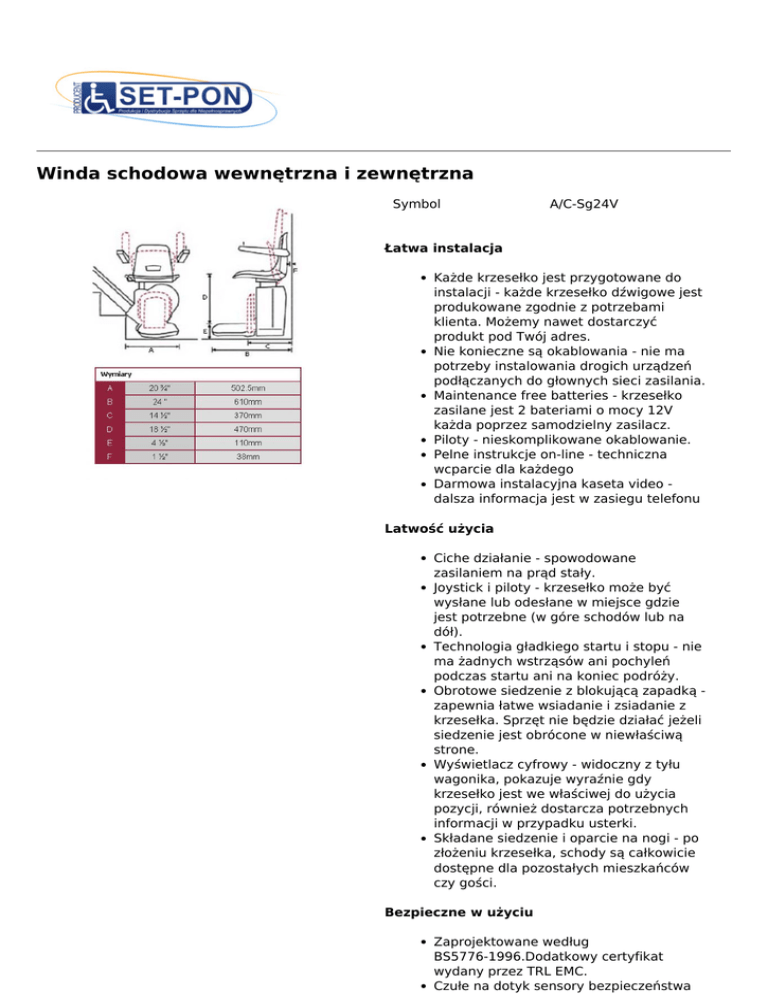 Winda schodowa wewnętrzna i zewnętrzna Symbol A/C-Sg24V Łatwa instalacja Każde krzesełko jest przygotowane do instalacji - każde krzesełko dźwigowe jest produkowane zgodnie z potrzebami klienta. Możemy nawet dostarczyć produkt pod Twój adres. Nie konieczne są okablowania - nie ma potrzeby instalowania drogich urządzeń podłączanych do głownych sieci zasilania. Maintenance free batteries - krzesełko zasilane jest 2 bateriami o mocy 12V każda poprzez samodzielny zasilacz. Piloty - nieskomplikowane okablowanie. Pelne instrukcje on-line - techniczna wcparcie dla każdego Darmowa instalacyjna kaseta video dalsza informacja jest w zasiegu telefonu Latwość użycia Ciche działanie - spowodowane zasilaniem na prąd stały. Joystick i piloty - krzesełko może być wysłane lub odesłane w miejsce gdzie jest potrzebne (w góre schodów lub na dół). Technologia gładkiego startu i stopu - nie ma żadnych wstrząsów ani pochyleń podczas startu ani na koniec podróży. Obrotowe siedzenie z blokującą zapadką zapewnia łatwe wsiadanie i zsiadanie z krzesełka. Sprzęt nie będzie działać jeżeli siedzenie jest obrócone w niewłaściwą strone. Wyświetlacz cyfrowy - widoczny z tyłu wagonika, pokazuje wyraźnie gdy krzesełko jest we właściwej do użycia pozycji, również dostarcza potrzebnych informacji w przypadku usterki. Składane siedzenie i oparcie na nogi - po złożeniu krzesełka, schody są całkowicie dostępne dla pozostałych mieszkańców czy gości. Bezpieczne w użyciu Zaprojektowane według BS5776-1996.Dodatkowy certyfikat wydany przez TRL EMC. Czułe na dotyk sensory bezpieczeństwa które zapobiegają uszkodzeniom podczas kontaktu z przeszkodami na schodach. Umieszczone one są dookoła oparcia na nogi oraz na przodzie i tyle wagonika. Sensory limitu, które zapewniają zatrzymanie się krzesełka w odpowiedniej pozycji. Elektroniczne i mechaniczne systemy hamowania eliminują prawdopodobieństwo niekontrolowanego zjazdu. Wylącznik izolacyjny 24 Volt prądu stałego - eliminuje ryzyko porażenia Wyposażenie łazienek bez barier produkt posiada znak CE. Moc silnika Prędkość podróży 22 rpm Metoda napędu zębatka Moment obrotowy 108 Nm Bateria Maksymalne obciążenie Rama Główne zasilanie Powered by TCPDF (www.tcpdf.org) 0.25 kW 24 v DC (bateria) 133 kg Aluminiowa 110v, 50Hz ładowarka