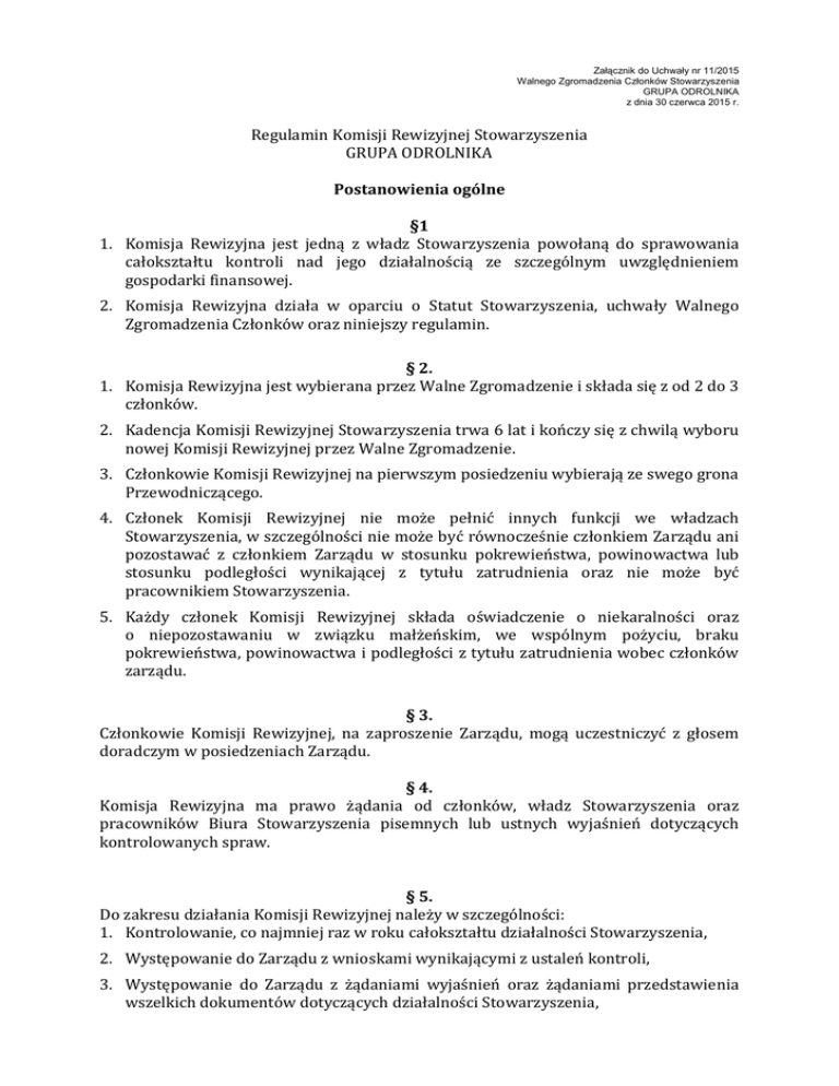 Załącznik do Uchwały nr 11/2015 Walnego Zgromadzenia Członków Stowarzyszenia GRUPA ODROLNIKA z dnia 30 czerwca 2015 r. Regulamin Komisji Rewizyjnej Stowarzyszenia GRUPA ODROLNIKA Postanowienia ogólne §1 1. Komisja Rewizyjna jest jedną z władz Stowarzyszenia powołaną do sprawowania całokształtu kontroli nad jego działalnością ze szczególnym uwzględnieniem gospodarki finansowej. 2. Komisja Rewizyjna działa w oparciu o Statut Stowarzyszenia, uchwały Walnego Zgromadzenia Członków oraz niniejszy regulamin. § 2. 1. Komisja Rewizyjna jest wybierana przez Walne Zgromadzenie i składa się z od 2 do 3 członków. 2. Kadencja Komisji Rewizyjnej Stowarzyszenia trwa 6 lat i kończy się z chwilą wyboru nowej Komisji Rewizyjnej przez Walne Zgromadzenie. 3. Członkowie Komisji Rewizyjnej na pierwszym posiedzeniu wybierają ze swego grona Przewodniczącego. 4. Członek Komisji Rewizyjnej nie może pełnić innych funkcji we władzach Stowarzyszenia, w szczególności nie może być równocześnie członkiem Zarządu ani pozostawać z członkiem Zarządu w stosunku pokrewieństwa, powinowactwa lub stosunku podległości wynikającej z tytułu zatrudnienia oraz nie może być pracownikiem Stowarzyszenia. 5. Każdy członek Komisji Rewizyjnej składa oświadczenie o niekaralności oraz o niepozostawaniu w związku małżeńskim, we wspólnym pożyciu, braku pokrewieństwa, powinowactwa i podległości z tytułu zatrudnienia wobec członków zarządu. § 3. Członkowie Komisji Rewizyjnej, na zaproszenie Zarządu, mogą uczestniczyć z głosem doradczym w posiedzeniach Zarządu. § 4. Komisja Rewizyjna ma prawo żądania od członków, władz Stowarzyszenia oraz pracowników Biura Stowarzyszenia pisemnych lub ustnych wyjaśnień dotyczących kontrolowanych spraw. § 5. Do zakresu działania Komisji Rewizyjnej należy w szczególności: 1. Kontrolowanie, co najmniej raz w roku całokształtu działalności Stowarzyszenia, 2. Występowanie do Zarządu z wnioskami wynikającymi z ustaleń kontroli, 3. Występowanie do Zarządu z żądaniami wyjaśnień oraz żądaniami przedstawienia wszelkich dokumentów dotyczących działalności Stowarzyszenia, 4. Wnioskowanie o zwołanie Nadzwyczajnego Walnego Zgromadzenia, 5. Składanie na Walnym Zgromadzeniu wniosków o udzielenie (lub odmowę udzielenia) absolutorium dla Zarządu oraz sprawozdań ze swej działalności. §6 1. Zebrania Komisji Rewizyjnej zwołuje jej Przewodniczący lub inny członek Komisji Rewizyjnej. 2. Zebrania Komisji Rewizyjnej odbywają się w miarę potrzeby jednakże nie rzadziej niż raz w roku. 3. W zebraniach mogą brać udział osoby zaproszone przez Przewodniczącego Komisji Rewizyjnej. §7 Podczas wykonywaniu swoich kontrolnych funkcji, w przypadku wyjątkowo skomplikowanej kwestii, Komisja Rewizyjna może skorzystać z usług specjalisty w danej dziedziny wiedzy. Specjalista ten nie musi być członkiem Stowarzyszenia. §8 1. Uchwały Komisji Rewizyjnej podejmowane są w głosowaniu jawnym i zapadają zwykłą większością głosów. 2. Do ważności uchwały wymagana jest obecność dwóch członków. 3. W przypadku równego rozłożenia głosów, głos decydujący ma Przewodniczący Komisji. §9 1. Z zebrań Komisji może być sporządzony protokół. Powinien on zawierać: - datę, porządek obrad, - imiona i nazwiska obecnych członków Komisji Rewizyjnej, imiona i nazwiska innych obecnych na zebraniu osób, - treść uchwał, - liczbę głosów oddanych za poszczególnymi uchwałami, - odrębne zdania członka w danej kwestii, podpisy członków Komisji Rewizyjnej uczestniczących w posiedzeniu oraz protokolanta. 2. Komisja prowadzi rejestr swoich uchwał i wniosków. Są one do wglądu w biurze Stowarzyszenia. 3. Za prawidłowość dokumentacji odpowiada Przewodniczący. Postanowienia końcowe § 10 1. Zmiana niniejszego regulaminu może nastąpić na wniosek Zarządu lub 1/3 ogółu członków zwyczajnych Stowarzyszenia. 2. Przyjęcie zmiany postanowień Regulaminu następuje w formie uchwały, w głosowaniu jawnym, zwykłą większością niezależnie od ilości członków obecnych na zebraniu. § 11 Regulamin wchodzi w życie z dniem uchwalenia.