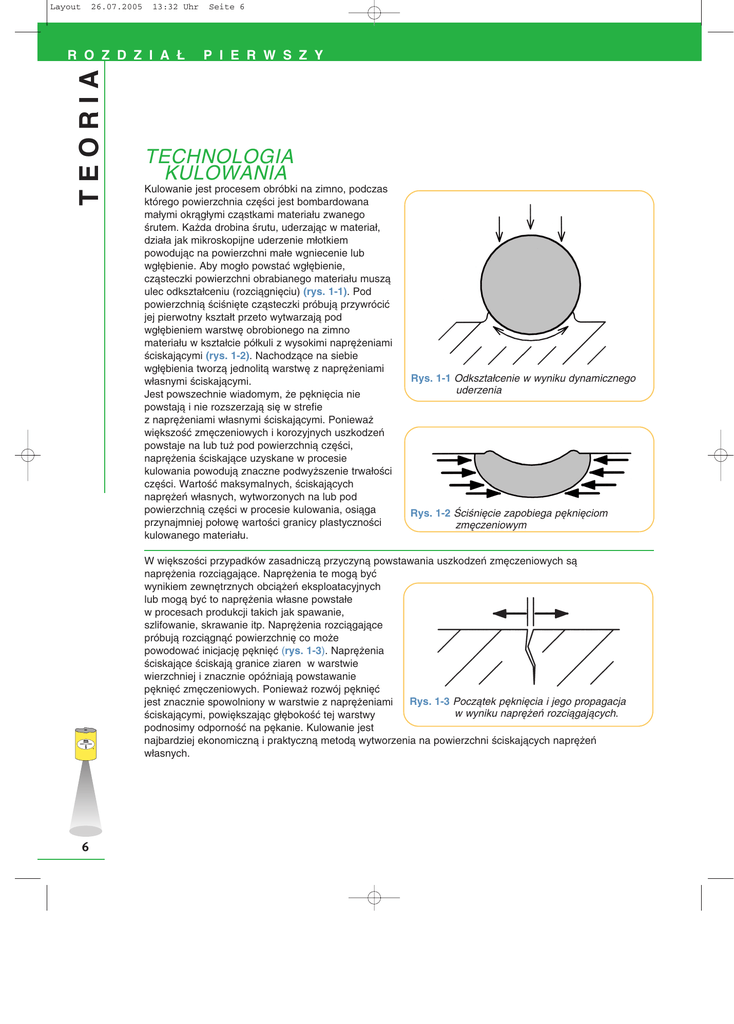 Layout 26.07.2005 13:32 Uhr TEORIA R O Z D Z I A ¸ Seite 6 P I E R W S Z Y TECHNOLOGIA KULOWANIA Kulowanie jest procesem obróbki na zimno, podczas którego powierzchnia cz´Êci jest bombardowana ma∏ymi okràg∏ymi czàstkami materia∏u zwanego Êrutem. Ka˝da drobina Êrutu, uderzajàc w materia∏, dzia∏a jak mikroskopijne uderzenie m∏otkiem powodujàc na powierzchni ma∏e wgniecenie lub wg∏´bienie. Aby mog∏o powstaç wg∏´bienie, czàsteczki powierzchni obrabianego materia∏u muszà ulec odkszta∏ceniu (rozciàgni´ciu) (rys. 1-1). Pod powierzchnià ÊciÊni´te czàsteczki próbujà przywróciç jej pierwotny kszta∏t przeto wytwarzajà pod wg∏´bieniem warstw´ obrobionego na zimno materia∏u w kszta∏cie pó∏kuli z wysokimi napr´˝eniami Êciskajàcymi (rys. 1-2). Nachodzàce na siebie wg∏´bienia tworzà jednolità warstw´ z napr´˝eniami w∏asnymi Êciskajàcymi. Jest powszechnie wiadomym, ˝e p´kni´cia nie powstajà i nie rozszerzajà si´ w strefie z napr´˝eniami w∏asnymi Êciskajàcymi. Poniewa˝ wi´kszoÊç zm´czeniowych i korozyjnych uszkodzeƒ powstaje na lub tu˝ pod powierzchnià cz´Êci, napr´˝enia Êciskajàce uzyskane w procesie kulowania powodujà znaczne podwy˝szenie trwa∏oÊci cz´Êci. WartoÊç maksymalnych, Êciskajàcych napr´˝eƒ w∏asnych, wytworzonych na lub pod powierzchnià cz´Êci w procesie kulowania, osiàga przynajmniej po∏ow´ wartoÊci granicy plastycznoÊci kulowanego materia∏u. Rys. 1-1 Odkszta∏cenie w wyniku dynamicznego uderzenia Rys. 1-2 ÂciÊni´cie zapobiega p´kni´ciom zm´czeniowym W wi´kszoÊci przypadków zasadniczà przyczynà powstawania uszkodzeƒ zm´czeniowych sà napr´˝enia rozciàgajàce. Napr´˝enia te mogà byç wynikiem zewn´trznych obcià˝eƒ eksploatacyjnych lub mogà byç to napr´˝enia w∏asne powsta∏e w procesach produkcji takich jak spawanie, szlifowanie, skrawanie itp. Napr´˝enia rozciàgajàce próbujà rozciàgnàç powierzchni´ co mo˝e powodowaç inicjacj´ p´kni´ç (rys. 1-3). Napr´˝enia Êciskajàce Êciskajà granice ziaren w warstwie wierzchniej i znacznie opóêniajà powstawanie p´kni´ç zm´czeniowych. Poniewa˝ rozwój p´kni´ç Rys. 1-3 Poczàtek p´kni´cia i jego propagacja jest znacznie spowolniony w warstwie z napr´˝eniami w wyniku napr´˝eƒ rozciàgajàcych. Êciskajàcymi, powi´kszajàc g∏´bokoÊç tej warstwy podnosimy odpornoÊç na p´kanie. Kulowanie jest najbardziej ekonomicznà i praktycznà metodà wytworzenia na powierzchni Êciskajàcych napr´˝eƒ w∏asnych. 6 26.07.2005 13:33 Uhr Seite 7 R R O Z D Z I A ¸ P I E R W S Z Y Ograniczona wytrzyma∏oÊç zm´czeniowa Napr´˝enia rozciàgajàce • Obcià˝enie zm´czeniowe sk∏ada si´ z dziesiàtek tysi´cy do kilku milionów powtarzajàcych si´ cykli obcià˝eniowych. Obcià˝enia powodujà powstawanie napr´˝eƒ rozciàgajàcych, które usi∏ujà rozciàgnàç powierzchni´ materia∏u. • Wynikiem liniowego zmniejszenia wartoÊci Nieograniczona wytrzyma∏oÊç zm´czeniowa napr´˝enia rozciàgajàcego jest wzrost wytrzyma∏oÊci zm´czeniowej (liczba Liczba cykli cykli obcià˝eƒ w skali Rys. 1- 4 Typowy wykres napr´˝eƒ w funkcji liczby cykli logarytmicznej). Na (krzywa Wehlera) wykresie (rys. 1-4) pokazano, ˝e zmniejszenie napr´˝enia o 262 MPa (32%) podwy˝sza wytrzyma∏oÊç o 150 000 cykli (300%). TEORIA Kulowanie jest przede wszystkim stosowane do zapobiegania zm´czeniu metalu. Ni˝ej wymienione czynniki majà wp∏yw na liczb´ cykli obcià˝eƒ w funkcji przy∏o˝onych napr´˝eƒ rozciàgajàcych (rys. 1-4). NAPR¢˚ENIA W¸ASNE WYWO¸ANE KULOWANIEM Napr´˝enia w∏asne wytworzone w procesie kulowania to napr´˝enia Êciskajàce. Napr´˝enia te równowa˝à lub obni˝ajà istniejàce napr´˝enia rozciàgajàce. Stwierdzono, ˝e im mniejsze napr´˝enia (rozciàgajàce) w warstwie wierzchniej tym wi´ksza ˝ywotnoÊç cz´Êci. Typowy rozk∏ad napr´˝eƒ w∏asnych, wywo∏anych kulowaniem, jest przedstawiony na rys. 1-5. G∏´bokoÊç warstwy umocnionej Napr´˝enia w∏asne Layout Napr´˝enia na powierzchni Maksymalne napr´˝enia Êciskajàce Maksymalne napr´˝enia Odleg∏oÊç od powierzchni – cale (dolna skala), mm (górna skala) Êciskajàce. Jest to maksymalna Rys. 1- 5 Typowy rozk∏ad napr´˝eƒ w∏asnych wywo∏anych wartoÊç wywo∏anych kulowaniem kulowaniem napr´˝eƒ Êciskajàcych. Zazwyczaj znajduje si´ w niewielkiej odleg∏oÊci od powierzchni. Gdy roÊnie wartoÊç maksymalnych napr´˝eƒ Êciskajàcych, wzrasta tak˝e odpornoÊç na p´kanie zm´czeniowe. G∏´bokoÊç warstwy z napr´˝eniami Êciskajàcymi. Jest to gruboÊç umocnionej warstwy, zapobiegajàcej rozwojowi p´kni´ç. GruboÊç warstwy mo˝e byç zwi´kszona poprzez wzrost energii dynamicznego uderzenia. Grubsza warstwa jest po˝àdana dla zwi´kszenia odpornoÊci na powstawanie p´kni´ç. Napr´˝enia na powierzchni. – Sà to napr´˝enia wyst´pujàce na powierzchni kulowanej. WielkoÊç ta jest zazwyczaj mniejsza ni˝ maksymalne napr´˝enia Êciskajàce. 7 Layout 26.07.2005 13:33 Uhr TEORIA R O Z D Z I A ¸ Seite 8 P I E R W S Z Y SUMA NAPR¢˚E¡ OD OBCIÑ˚E¡ ZEWN¢TRZNYCH I NAPR¢˚E¡ W¸ASNYCH Rozciàganie Âciskanie JeÊli kulowanà cz´Êç z wywo∏anymi w niej napr´˝eniami Êciskajàcymi poddamy dzia∏aniu obcià˝eƒ zewn´trznych, wywo∏ujàcych Napr´˝enia od obcià˝eƒ Napr´˝enia w∏asne napr´˝enia rozciàgajàce, to wypadkowa zewn´trznych wywo∏ane rozk∏adu napr´˝eƒ mo˝e przebiegaç tak jak na kulowaniem Napr´˝enia wypadkowe rys. 1-6. (sumaryczne) Gdy na kulowanà cz´Êç dzia∏ajà obcià˝enia zewn´trzne (eksploatacyjne) to powierzchnia jej podlega dzia∏aniu sumy napr´˝eƒ wynikajàcych z przy∏o˝onych obcià˝eƒ zewn´trznych oraz napr´˝eƒ w∏asnych, Rys. 1-6 Wykres napr´˝eƒ w wyniku przy∏o˝onych powsta∏ych w wyniku kulowania. obcià˝eƒ zewn´trznych i uzyskan