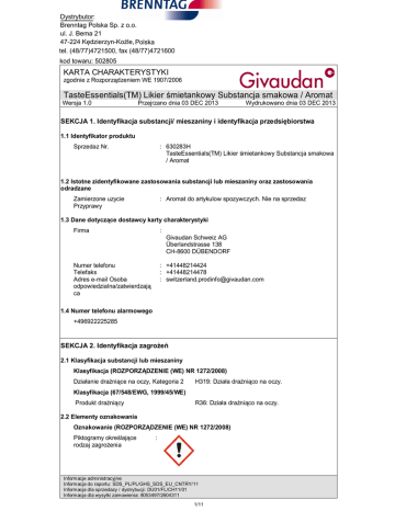 Dystrybutor: Brenntag Polska Sp. z o.o. ul. J. Bema 21 47-224 Kędzierzyn-Koźle, Polska tel. (48/77)4721500, fax (48/77)4721600 kod towaru: 502805 KARTA CHARAKTERYSTYKI zgodnie z Rozporządzeniem WE 1907/2006 TasteEssentials(TM) Likier śmietankowy Substancja smakowa / Aromat Wersja 1.0 Przejrzano dnia 03 DEC 2013 Wydrukowano dnia 03 DEC 2013 SEKCJA 1. Identyfikacja substancji/ mieszaniny i identyfikacja przedsiębiorstwa 1.1 Identyfikator produktu Sprzedaz Nr. : 630283H TasteEssentials(TM) Likier śmietankowy Substancja smakowa / Aromat 1.2 Istotne zidentyfikowane zastosowania substancji lub mieszaniny oraz zastosowania odradzane : Aromat do artykulow spozywczych. Nie na sprzedaz Zamierzone uzycie Przyprawy 1.3 Dane dotyczące dostawcy karty charakterystyki Firma : Givaudan Schweiz AG Überlandstrasse 138 CH-8600 DÜBENDORF Numer telefonu Telefaks Adres e-mail Osoba odpowiedzialna/zatwierdzają ca : +41448214424 : +41448214478 : [email protected] 1.4 Numer telefonu alarmowego +496922225285 SEKCJA 2. Identyfikacja zagrożeń 2.1 Klasyfikacja substancji lub mieszaniny Klasyfikacja (ROZPORZĄDZENIE (WE) NR 1272/2008) Działanie drażniące na oczy, Kategoria 2 H319: Działa drażniąco na oczy. Klasyfikacja (67/548/EWG, 1999/45/WE) Produkt drażniący R36: Działa drażniąco na oczy. 2.2 Elementy oznakowania Oznakowanie (ROZPORZĄDZENIE (WE) NR 1272/2008) Piktogramy określające rodzaj zagrożenia : Informacje administracyjne: Informacja do raportu: SDS_PL/PL/GHS_SDS_EU_CNTRY/11 Informacja dla sprzedazy / dystrybucji: DU01/FL/CH11/01 Informacja dla wysylki zamowienia: 8053497/2604311 1/11 KARTA CHARAKTERYSTYKI zgodnie z Rozporządzeniem WE 1907/2006 TasteEssentials(TM) Likier śmietankowy Substancja smakowa / Aromat Wersja 1.0 Przejrzano dnia 03 DEC 2013 Hasło ostrzegawcze : Uwaga Zwroty wskazujące rodzaj zagrożenia Zwroty wskazujące środki ostrożności : H319 : Zapobieganie: P264 P280 Wydrukowano dnia 03 DEC 2013 Działa drażniąco na oczy. Dokładnie umyć ciało po manipulowaniu. Stosować rękawice ochronne/ ochronę oczu/ ochronę twarzy. Reagowanie: P305 + P351 + P338 W PRZYPADKU DOSTANIA SIĘ DO OCZU: Ostrożnie płukać wodą przez kilka minut. Wyjąć soczewki kontaktowe, jeżeli są i można je łatwo usunąć. Nadal płukać. P337 + P313 W przypadku utrzymywania się działania drażniącego na oczy: Zasięgnąć porady/ zgłosić się pod opiekę lekarza. Oznakowanie zgodne z Dyrektywami UE (67/548/EWG, 1999/45/WE) Piktogramy określające rodzaj zagrożenia : Produkt drażniący Zwrot(y) R : R36 Działa drażniąco na oczy. Zwrot(y) S : S22 S26 Nie wdychać pyłu. Zanieczyszczone oczy przemyć natychmiast dużą ilością wody i zasięgnąć porady lekarza. Produkt i opakowanie usuwać jako odpad niebezpieczny. S60 2.3 Inne zagrożenia brak dostępnych danych SEKCJA 3. Skład/ informacja o składnikach 3.2 Mieszaniny Informacje administracyjne: Informacja do raportu: SDS_PL/PL/GHS_SDS_EU_CNTRY/11 Informacja dla sprzedazy / dystrybucji: DU01/FL/CH11/01 Informacja dla wysylki zamowienia: 8053497/2604311 2/11 KARTA CHARAKTERYSTYKI zgodnie z Rozporządzeniem WE 1907/2006 TasteEssentials(TM) Likier śmietankowy Substancja smakowa / Aromat Wersja 1.0 Przejrzano dnia 03 DEC 2013 Wydrukowano dnia 03 DEC 2013 Składniki niebezpieczne Nazwa Chemiczna 3-methoxy-4-hydroxybenzaldehyde (vanillin) Nr CAS Nr WE Numer rejestru 121-33-5 204-465-2 Klasyfikacja Klasyfikacja Stężenie [%] (67/548/EWG) (ROZPORZĄDZ ENIE (WE) NR 1272/2008) Eye Irrit. 2; >= 20 - < 25 Xi; R36 H319 01-2119516040-600000 Pełen tekst zwrotów R zawartych w tej Sekcji umieszczonow w Sekcji 16. Pełny tekst zwrotów H przytoczonych w tej Sekcji znajduje się w Sekcji 16. Węglowodory : nie dotyczy SEKCJA 4. Środki pierwszej pomocy 4.1 Opis środków pierwszej pomocy Porady ogólne : Usunąć z zagrożonej strefy. Przedstawić lekarzowi dołączoną Kartę Charakterystyki Substancji Niebezpiecznej. Nie pozostawiać osoby poszkodowanej bez opieki. W przypadku wdychania : Osobie nieprzytomnej zapewnić wygodną pozycję i zasięgnąć porady medycznej. Jeśli objawy utrzymują się, wezwać lekarza. W przypadku kontaktu ze skórą : Natychmiast zdjąć skażone obuwie i ubranie. W przypadku zanieczyszczenia skóry - dobrze spłukać wodą. W przypadku kontaktu z oczami : Niezwłocznie przemyć oczy dużą ilością wody. Usunąć szkła (szkło) kontaktowe. Zabezpieczyć nieuszkodzone oko. W trakcie przemywania należy szeroko otwierać oczy. Jeśli podrażnienie oczu utrzymuje się, skonsultować się ze specjalistą. W przypadku połknięcia : Zachować drożność dróg oddechowych. Nie podawać mleka lub napoju alkoholowego. Nieprzytomnej osobie nigdy nie podawać nic doustnie. Jeśli objawy utrzymują się, wezwać lekarza. 4.2 Najważniejsze ostre i opóźnione objawy oraz skutki narażenia Objawy : brak dostępnych danych Zagrożenia : brak dostępnych danych 4.3 Wskazania dotyczące wszelkiej natychmiastowej pomocy lekarskiej i szczególnego Informacje administracyjne: Informacja do raportu: SDS_PL/PL/GHS_SDS_EU_CNTRY/11 Informacja dla sprzedazy / dystrybucji: DU01/FL/CH11/01 Informacja dla wysylki zamowienia: 8053497/2604311 3/11 KARTA CHARAKTERYSTYKI zgodnie z Rozporządzeniem WE 1907/2006 TasteEssentials(TM) Likier śmietankowy Substancja smakowa / Aromat Wersja 1.0 Przejrzano dnia 03 DEC 2013 Wydrukowano dnia 03 DEC 2013 postępowania z poszkodowanym Kuracja : brak dostępnych danych SEKCJA 5. Postępowanie w przypadku pożaru 5.1 Środki gaśnicze Odpowiednie środki gaśnicze : Suche proszki gaśnicze Piana alkoholoodporna Aerozol wodny Dwutlenek węgla (CO2) Niewłaściwe środki gaśnicze : brak dostępnych danych 5.2 Szczególne zagrożenia związane z substancją lub mieszaniną Specyficzne zagrożenia w : brak dostępnych danych czasie zwalczania pożaru 5.3 Informacje dla straży pożarnej Specjalny sprzęt ochronny dla strażaków : W razie konieczności w trakcie akcji gaśniczej założyć a