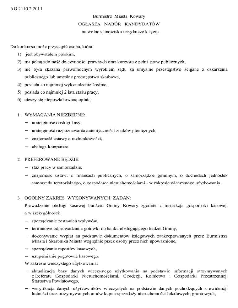 AG.2110.2.2011 Burmistrz Miasta Kowary OGŁASZA NABÓR KANDYDATÓW na wolne stanowisko urzędnicze kasjera Do konkursu może przystąpić osoba, która: 1) jest obywatelem polskim, 2) ma pełną zdolność do czynności prawnych oraz korzysta z pełni praw publicznych, 3) nie była skazana prawomocnym wyrokiem sądu za umyślne przestępstwo ścigane z oskarżenia publicznego lub umyślne przestępstwo skarbowe, 4) posiada co najmniej wykształcenie średnie, 5) posiada co najmniej 2 lata stażu pracy, 6) cieszy się nieposzlakowaną opinią. 1. WYMAGANIA NIEZBĘDNE: − umiejętność obsługi kasy, − umiejętność rozpoznawania autentyczności znaków pieniężnych, − znajomość ustawy o rachunkowości, − obsługa komputera. 2. PREFEROWANE BĘDZIE: − staż pracy w samorządzie, − znajomość ustaw: o finansach publicznych, o samorządzie gminnym, o dochodach jednostek samorządu terytorialnego, o gospodarce nieruchomościami - w zakresie wieczystego użytkowania. 3. OGÓLNY ZAKRES WYKONYWANYCH ZADAŃ: Prowadzenie obsługi kasowej budżetu Gminy Kowary zgodnie z instrukcja gospodarki kasowej, a w szczególności: − sporządzanie zestawień wpływów, − terminowe odprowadzania gotówki do banku obsługującego budżet Gminy, − dokonywanie wypłat na podstawie dokumentów księgowych zaakceptowanych przez Burmistrza Miasta i Skarbnika Miasta względnie przez osoby przez nich upoważnione, − sporządzanie raportów kasowych, − uzupełnianie pogotowia kasowego. W zakresie wieczystego użytkowania: − aktualizacja bazy danych wieczystego użytkowania na podstawie informacji otrzymywanych z Referatu Gospodarki Nieruchomościami, Geodezji, Rolnictwa i Gospodarki Przestrzennej, Starostwa Powiatowego, − weryfikacja danych użytkowników wieczystych na podstawie danych pochodzących z ewidencji ludności oraz otrzymywanych umów kupna-sprzedaży nieruchomości lokalowych, gruntowych, − pilnowanie terminowości wpłat opłaty użytkowania wieczystego, − sporządzanie dla zalegających z płatnością wezwań do zapłaty w trybie przepisów K.C., − wszczynanie i prowadzenie sądowej egzekucji komorniczej, współpraca z Sądem Rejonowym, − współpraca z komornikiem Sądowym prowadzącym postępowanie egzekucyjne na podstawie wniosku Gminy. 4. WYMAGANE DOKUMENTY: − list motywacyjny, opisujący: ▪ powody, dla których osoba ubiega się o stanowisko, ▪ dotychczasowe doświadczenia w pracy zawodowej i aktualną sytuację zawodową, ▪ ewentualnie - inne informacje uzasadniające przekonanie kandydata o spełnianiu opisanych w ogłoszeniu oczekiwań wobec kasjera, ▪ własne oczekiwania, jakie kandydat wiąże z tym stanowiskiem pracy, − kwestionariusz kandydata CV (do pobrania), − kserokopia dokumentu potwierdzającego poziom i kierunek wykształcenia, − kserokopie dokumentów potwierdzających doświadczenie zawodowe, − kserokopia dokumentu potwierdzającego odbycie szkolenia z zakresu rozpoznawania autentyczności pieniędzy, − oświadczenie o treści: „oświadczam, że posiadam pełną zdolność do czynności prawnych, korzystam z pełni praw publicznych, cieszę się nieposzlakowaną opinią, nie byłam/em skazana/y prawomocnym wyrokiem sądu za umyślne przestępstwo ścigane z oskarżenia publicznego lub umyślne przestępstwo skarbowe, ” (do pobrania). 5. SKŁADANIE OFERT: Ofertę należy złożyć w Biurze Obsługi Klienta Urzędu Miejskiego w Kowarach, pok. nr 1 (parter), osobiście lub przesłać na adres Urzędu Miejskiego w Kowarach, w zamkniętej kopercie z dopiskiem: „nabór na stanowisko kasjera”, z podaniem imienia, nazwiska i adresu, do 27 października 2011r. (decyduje data wpływu do urzędu). Aplikacje niekompletne oraz te, które wpłyną do urzędu po wyżej określonym terminie nie będą rozpatrywane. Informacje o ewentualnym rozstrzygnięciu zostaną upowszechnione w trybie i zakresie określonym w art. 15 ustawy o pracownikach samorządowych. Informacje na temat naboru można uzyskać pod numerem telefonu 75 64 56 116. Burmistrz Miasta Kowary Mirosław Górecki Kowary, 17.10.2011