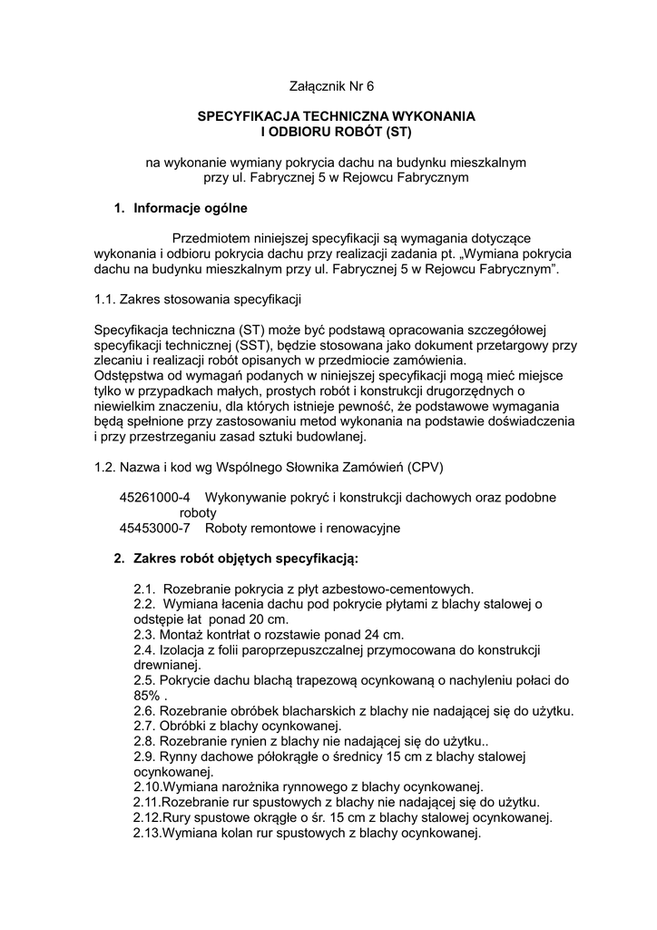 Załącznik Nr 6 SPECYFIKACJA TECHNICZNA WYKONANIA I ODBIORU ROBÓT (ST) na wykonanie wymiany pokrycia dachu na budynku mieszkalnym przy ul. Fabrycznej 5 w Rejowcu Fabrycznym 1. Informacje ogólne Przedmiotem niniejszej specyfikacji są wymagania dotyczące wykonania i odbioru pokrycia dachu przy realizacji zadania pt. „Wymiana pokrycia dachu na budynku mieszkalnym przy ul. Fabrycznej 5 w Rejowcu Fabrycznym”. 1.1. Zakres stosowania specyfikacji Specyfikacja techniczna (ST) może być podstawą opracowania szczegółowej specyfikacji technicznej (SST), będzie stosowana jako dokument przetargowy przy zlecaniu i realizacji robót opisanych w przedmiocie zamówienia. Odstępstwa od wymagań podanych w niniejszej specyfikacji mogą mieć miejsce tylko w przypadkach małych, prostych robót i konstrukcji drugorzędnych o niewielkim znaczeniu, dla których istnieje pewność, że podstawowe wymagania będą spełnione przy zastosowaniu metod wykonania na podstawie doświadczenia i przy przestrzeganiu zasad sztuki budowlanej. 1.2. Nazwa i kod wg Wspólnego Słownika Zamówień (CPV) 45261000-4 Wykonywanie pokryć i konstrukcji dachowych oraz podobne roboty 45453000-7 Roboty remontowe i renowacyjne 2. Zakres robót objętych specyfikacją: 2.1. Rozebranie pokrycia z płyt azbestowo-cementowych. 2.2. Wymiana łacenia dachu pod pokrycie płytami z blachy stalowej o odstępie łat ponad 20 cm. 2.3. Montaż kontrłat o rozstawie ponad 24 cm. 2.4. Izolacja z folii paroprzepuszczalnej przymocowana do konstrukcji drewnianej. 2.5. Pokrycie dachu blachą trapezową ocynkowaną o nachyleniu połaci do 85% . 2.6. Rozebranie obróbek blacharskich z blachy nie nadającej się do użytku. 2.7. Obróbki z blachy ocynkowanej. 2.8. Rozebranie rynien z blachy nie nadającej się do użytku.. 2.9. Rynny dachowe półokrągłe o średnicy 15 cm z blachy stalowej ocynkowanej. 2.10.Wymiana narożnika rynnowego z blachy ocynkowanej. 2.11.Rozebranie rur spustowych z blachy nie nadającej się do użytku. 2.12.Rury spustowe okrągłe o śr. 15 cm z blachy stalowej ocynkowanej. 2.13.Wymiana kolan rur spustowych z blachy ocynkowanej. 2.14.Przemurowanie kominów z cegły pełnej na zaprawie cementowej. 2.15.Wykonanie czapek żelbetowych na kominach o średniej grubości 7 cm 2.16 Wywiezienie gruzu po rozebranych kominach. 3. Ogólne wymagania dotyczące robót: 3.1 Organizacja robót budowlanych Planowane roboty należy zorganizować i prowadzić z ograniczeniami wynikającymi z funkcji użytkowej budynku. Należy uwzględnić czasowe zabezpieczenie odkrytych połaci dachowych podczas wykonywania remontu. 3.2. Zabezpieczenie interesów osób trzecich Przeprowadzenie robót wymaga od wykonawcy zapewnienia bezpieczeństwa osób postronnych i użytkowników budynku poprzez dostosowanie organizacji robót oraz odpowiednie wydzielenie stref, wykonanie zabezpieczeń i zamknięć dostępu do strefy niebezpiecznej wraz z oznakowaniem ostrzegawczym i informacyjnym na zewnątrz. 3.3. Ochrona środowiska Zdjęte pokrycie należy zabezpieczyć folią i złożyć na terenie wskazanym przez inwestora. 3.4. Warunki bezpieczeństwa pracy Prace remontowe mogą wykonywać przeszkoleni pracownicy posiadający aktualne badania do pracy na wysokości i zaopatrzenie w środki ochrony osobistej. Szczególne środki ostrożności należy zachować przy demontażu pokrycia dachowego z płyt azbestowo-cementowych. W szczególności należy przestrzegać „Ogólne przepisy bezpieczeństwa i higieny pracy” (Dz.U. z 1997 r. Nr 129, poz. 844, zm. DZ.U. z 2002 r. Nr 91, poz. 811) oraz przepisy „w sprawie bezpieczeństwa i higieny pracy podczas wykonywania robót budowlanych” (Dz.U. z 2003 r. Nr 47, poz. 401). oraz przepisy Rozporządzenia Ministra Gospodarki i Pracy z dnia 14 października 2005 r. w sprawie zasad bezpieczeństwa i higieny pracy przy zabezpieczaniu i usuwaniu wyrobów zawierających azbest oraz szkolenie w zakresie bezpiecznego użytkowania takich wyrobów (Dz.U. 2005 r. Nr 216, poz.1824) 3.5. Zabezpieczenie chodników Należy wygrodzić i oznakować strefę niebezpieczną na chodnikach, przejściach i terenie wokół budynku w czasie prac na wysokości. Stanowiska robót należy przygotować w sposób uniemożliwiający zniszczenie i zabrudzenie terenu i zieleni przy budynku. 4. Obmiar robót. 4.1. Jednostką obmiarową robót jest: – dla robót – krycie dachów blachą trapezową – m2 pokrytej powierzchni dachu, – dla robót – obróbki blacharskie – m2 – dla robót rynny i rury spustowe – m wykonanych rynien i rur spustowych – dla przebudowy kominów – m3 przebudowanych kominów, – dla czapek kominowych – m2 wykonanych czapek kominowych. 4.2. Ilość robót określa się na podstawie przedmiaru robót 5. Szczegółowy zakres robót budowlanych występujących podczas realizacji remontu: 5.1. Wykonanie remontu więźby dachowej - po zdemontowaniu pokrycia dachowego należy dokładnie sprawdzić stan konstrukcji dachowej, wszystkie elementy konstrukcji więźby dachowej dokładnie oczyścić z powierzchniowych skorodowań i zanieczyszczeń. Wzmocnienie zniszczonych i przegniłych elementów więźby wykonać poprzez zastosowanie nakładek bocznych o wysokości równej wysokości wzmacnianego elementu. - pod łatami należy ułożyć folię dachową wysoko paroprzepuszczalną, poliuretanową, zbrojona siatką polipropylenową. - wszystkie łaty należy zaimpregnować środkiem grzybobójczym. 5.2. Wykonanie rynien i rur spustowych z blachy stalowej ocynkowanej Ø 15 cm - rury spustowe należy zamocować uchwytami nie rzadziej niż co 2 m, oraz na końcach i pod kolankami. Uchwyt należy umocować w sposób trwały przez wbicie w spoiny muru. - rynny dachowe wykonane z blachy stalowej ocynkowanej półokrągłe Ø15 cm, uchwyty do rynien mocowane co 50 cm z zachowaniem spadku podłużnego. 5.3. Wykonanie nowego pokrycia z blachy ocynkowanej - blachę trapezową ocynkowaną należy układać na łatach i m