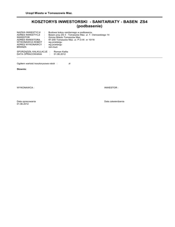 Urząd Miasta w Tomaszowie Maz. KOSZTORYS INWESTORSKI - SANITARIATY - BASEN ZS4 (podbasenie) NAZWA INWESTYCJI ADRES INWESTYCJI INWESTOR ADRES INWESTORA WYKONAWCA ROBÓT ADRES WYKONAWCY BRANŻA : : : : : : : Budowa boksu sanitarnego w podbaseniu Basen przy ZS 4 - Tomaszów Maz. ul. T. Ostrowskiego 14 Gmina Miasto Tomaszów Maz. 97-200 Tomaszów Maz. ul. P.O.W. nr 10/16 wg przetargu wg przetargu rem-bud. SPORZĄDZIŁ KALKULACJE : DATA OPRACOWANIA : Roman Kalita 01.06.2012 Ogółem wartość kosztorysowa robót : zł Słownie: WYKONAWCA : INWESTOR : Data opracowania 01.06.2012 Data zatwierdzenia OGÓLNA CHARAKTERYSTYKA OBIEKTU Kosztorys dotyczy wykonania boksu sanitarnego ( natrysk, umywalka, WC ) dla pracowników obsługi basenu, usytuowanego w przeszczeni technicznej podbasenia. Z uwagi na wysoką temperaturę, wilgoć oraz chlor wydzielający się z otwartych filtrów wody basenowej - boks musi być wykonany z materiałów odpornych na takie środowisko. Podczas osadzania się wilgoci ( z chlorem ) na materiałach w tej przeszczeni następuje zatężanie się na nich związków chlorowych i zwiększone odziaływanie kordynujące. Przewiduje się wykonanie instalacji przyłonczeniowych wod-kan do istniejących rurociągów biegnących w pobliżu projektowanego boksu oraz adaptację instalacji elektrycznej znajdującej się w rozpatrywanym miejscu. Przewiduje się wydzielenie przestrzeni 1,5 x 3,3 m za pomocą ścianek działowych z PCV z drzwiami szer. 1,0 m. Wykończenie posadzki płytkami ceramicznymi, oświetlenie elektryczne, wentylacja poprzez wentylację podbasenia. Wszystkie urządzenia sanitarne łączone z kanalizacją poprzez syfony a z wewnętrznymi sieciami wody zimneji ciepłej poprzez zawory. Norma STD Wersja 4.16 -2- Lp. 1 Podstawa Opis i wyliczenia j.m. Poszcz Razem 1. Roboty ogólnobudowlane 1 KNR 0-19 d.1 1023-12 (analog) Montaż ścianki działowej z PCV z obróbką obsadzenia i montażem drzwi o sze- m2 rokości 100 cm dla boksu sanitarnego w podbaseniu o pow. ponad 1.0 m2 2.5*(1.5+3.3+1.5) m2 2 KNR-W 4-01 Dwukrotne malowanie farbami olejnymi starych tynków wewnętrznych ścian z d.1 1206-04 jednokrotnym szpachlowaniem 3.3*3.0 m2 3 KNR-W 4-01 Zabezpieczenie podłóg folią d.1 1216-01 3.3*1.5 m2 4 KNR-W 7-12 Malowanie lakierem, emalią chlorokauczukową powierzchni poziomych konsd.1 0402-01 trukcji betonowych - malowanie podłogi betonowej (analog) 3.3*1.5 m2 m2 m2 m2 5 KNR-W 4-01 Mechaniczna rozbiórka elementów konstrukcji betonowych niezbrojonych o gru- m3 d.1 0212-04 bości ponad 15 cm ( wykucie fragmentu posadzki pod przyłacze kanalizacji wewn.) 0.25*0.35*3.5 m3 6 KNR-W 4-01 Zasypanie wykopów ziemią z ukopów oraz z przerzutem ziemi na odległość do d.1 0105-02 3 m i ubiciem warstwami co 15 cm w gruncie kat. III 0.20*0.30*3.3 m3 7 KNR-W 4-01 Przewóz ziemi taczkami na odległość 40 m w gruncie kat. I-II d.1 0105-04 0105-07 0.306-0.198 m3 m3 m3 8 KNR-W 4-01 Uzupełnienie posadzki cementowej o powierzchni 1.0-5.0 m2 w jednym miejscu m2 d.1 0803-02 z zatarciem na gładko 0.3*3.5 m2 9 KNR-W 2-02 Warstwy niwelująco-wyrównawcze cementowe grubości 2 mm zatarte na gładko m2 d.1 1105-01 1.5*3.3 m2 10 KNR 2-02 d.1 1104-05 11 KNR 2-02 d.1 1105-04 12 KNR AT-23 d.1 0218-01 Posadzki jedno- i dwubarwne z płytek ceramicznych podłogowych(terakotowych), luzem 150x150 mm 1.5*3.3 m2 Cokoliki z płytek ceramicznych podłogowych terakotowych 150x150 mm m 3.30 m Listwy zakończeniowe obsadzane w grubowarstwowej zaprawie klejowej m 3.3+1.5+1.5 m m2 15.750 RAZEM 15.750 9.900 RAZEM 9.900 4.950 RAZEM 4.950 4.950 RAZEM 4.950 0.306 RAZEM 0.306 0.198 RAZEM 0.198 0.108 RAZEM 0.108 1.050 RAZEM 1.050 4.950 RAZEM 4.950 4.950 RAZEM 4.950 3.300 RAZEM 3.300 6.300 RAZEM 6.300 2.000 RAZEM 2.000 18.000 RAZEM 18.000 11.000 RAZEM 11.000 2 2. Instalacje wodociągowe ( wz. wc ) 13 KNR-W 2-15 Zawory przelotowe i zwrotne instalacji wodociągowych z rur z tworzyw sztuczd.2 0132-02 nych o śr. nominalnej 20 mm 2 szt. 14 KNR-W 2-15 Rurociągi z tworzyw sztucznych (PP, PE, PB) o śr. zewnętrznej 25 mm o połąd.2 0112-02 czeniach zgrzewanych, na ścianach w budynkach niemieszkalnych hydrofornie, kotłownie itp. z.sz.3.3. 9903-1 18 m 15 KNR-W 2-15 Rurociągi z tworzyw sztucznych (PP, PE, PB) o śr. zewnętrznej 20 mm o połąd.2 0112-01 czeniach zgrzewanych, na ścianach w budynkach niemieszkalnych hydrofornie, kotłownie itp. z.sz.3.3. 9903-1 11 m Norma STD Wersja 4.16 szt. m m Lp. Podstawa Opis i wyliczenia 16 KNR-W 2-16 Jednowarstwowa izolacja o grubości 30 mm otulinami z wełny mineralnej rurod.2 0303-01 ciągów o śr.zew.21-33 - temperatura 29 do 40 st.C - kotłownie, wymiennikownie, orurowanie urządzeń energetycznych i aparatury chemicznej z.o.3.1.3. 9903-01 9904-01 2.105 17 KNR 0-31 d.2 0111-01 18 KNR 0-35 d.2 0113-02 19 KNR 0-31 d.2 0111-06 20 KNR 0-31 d.2 0107-05 j.m. m2 m2 Baterie umywalkowe, śr. 15 mm montowane na ścianie szt. 1 szt. Zawory kulowe i zwrotne przelotowe, gwintowane do wody zimnej lub ciepłej o śr. nominalnej 15 mm - zawór przed spłuczką sedesową 1 szt. Baterie natryskowe śr. 15 mm montowane na ścianie w kabinie szt. 1 szt. Wykonanie podejść dopływowych o śr. 15 mm do wody zimnej lub ciepłej do płuczek ustępowych, elastycznych gumowych w oplocie stalowym 1 szt. szt. szt. 21 KNR-W 2-15 Dodatki za podejścia dopływowe w rurociągach z tworzyw sztucznych do zawo- szt. d.2 0116-01 rów czerpalnych, baterii, mieszaczy, hydrantów itp. o połączeniu sztywnym o śr. zewnętrznej 20 mm - hydrofornie, kotłownie itp. z.sz.3.3. 9903-1 4 szt. 22 KNR-W 2-15 Dodatki za wykonanie obejść elementów konstrukcyjnych w rurociągach z twod.2 0119-02 rzyw sztucznych o śr. zewnętrznej 25 mm - hydrofornie, kotłownie itp. z.sz.3.3. 9903-1 4 szt. 23 KNR-W 2-15 Punkty stałe w rurociągach z tworzyw sztucznych o śr. zewnętrznej 25 mm d.2 0121-02 ściany z betonu żwirowego - hydrofornie, kotłownie itp. z.o.2.5. 9901 z.sz.3.3. 9903-1 4 szt. 24 KNR-W 2-15 Punkty stałe 