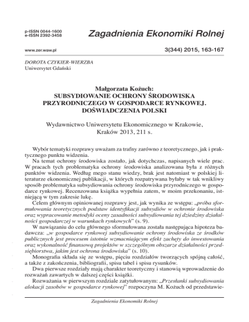 p-ISSN 0044-1600 e-ISSN 2392-3458 Zagadnienia Ekonomiki Rolnej 3(344) 2015, 163-167 www.zer.waw.pl DOROTA CZYKIER-WIERZBA Uniwersytet Gdański Małgorzata Kożuch: SUBSYDIOWANIE OCHRONY ŚRODOWISKA PRZYRODNICZEGO W GOSPODARCE RYNKOWEJ. DOŚWIADCZENIA POLSKI Wybór tematyki rozprawy uważam za trafny zarówno z teoretycznego, jak i praktycznego punktu widzenia. Na temat ochrony środowiska zostało, jak dotychczas, napisanych wiele prac. W pracach tych problematyka ochrony środowiska analizowana była z różnych punktów widzenia. Według mego stanu wiedzy, brak jest natomiast w polskiej literaturze ekonomicznej publikacji, w których rozpatrywana byłaby w tak wnikliwy sposób problematyka subsydiowania ochrony środowiska przyrodniczego w gospodarce rynkowej. Recenzowana książka wypełnia zatem, w moim przekonaniu, istniejącą w tym zakresie lukę. Celem głównym opiniowanej rozprawy jest, jak wynika ze wstępu: „próba sformułowania teoretycznych podstaw identyfikacji subsydiów w ochronie środowiska oraz wypracowanie metodyki oceny zasadności subsydiowania tej dziedziny działalności gospodarczej w warunkach rynkowych” (s. 9). W nawiązaniu do celu głównego sformułowana została następująca hipoteza badawcza: „w gospodarce rynkowej subsydiowanie ochrony środowiska ze środków publicznych jest procesem istotnie wzmacniającym efekt zachęty do inwestowania oraz wykonalność finansową projektów w szczególnym obszarze działalności przedsiębiorstwa, jakim jest ochrona środowiska” (s. 10). Monografia składa się ze wstępu, pięciu rozdziałów tworzących spójną całość, a także z zakończenia, bibliografii, spisu tabel i spisu rysunków. Dwa pierwsze rozdziały mają charakter teoretyczny i stanowią wprowadzenie do rozważań zawartych w dalszej części książki. Rozważania w pierwszym rozdziale zatytułowanym: „Przesłanki subsydiowania alokacji zasobów w gospodarce rynkowej” rozpoczyna M. Kożuch od przedstawie- - - - - - Wydawnictwo Uniwersytetu Ekonomicznego w Krakowie, Kraków 2013, 211 s. Zagadnienia Ekonomiki Rolnej Recenzje – Polemiki nia, sformułowanych w literaturze przez różnych autorów, definicji państwa. Żałować jednak należy, że autorka, prezentując te definicje, nie zaproponowała własnej lub nie podała, która z przytoczonych w rozprawie definicji jest, jej zdaniem, najlepsza i dlaczego? Następnie, w sposób syntetyczny ujęte zostały funkcje pełnione przez państwo według głównych doktryn ekonomicznych. W kolejnym fragmencie rozdziału I omówiono funkcje państwa w gospodarce rynkowej oraz narzędzia, którymi oddziałuje państwo na procesy gospodarcze. Wśród scharakteryzowanych narzędzi szczególną grupę, zdaniem M. Kożuch, stanowią wydatki publiczne i transfery (s. 32). Te ostatnie, jak stwierdza autorka, „są głównym źródłem subsydiów” (s. 34), będących przedmiotem rozważań w dalszej części pracy. W rozważaniach tych zamieszczono definicje subsydiów. Nie wiadomo jednak, za którą z przytoczonych definicji opowiada się autorka. M. Kożuch polemizuje z występującymi w literaturze poglądami, według których subsydia utożsamiane są na przykład z dotacjami lub subwencjami. Uzasadnia dlaczego „kategoria subsydium jest szersza i obejmuje grupę instrumentów, w tym dotacje i subwencje (...)” s. 39. Subsydia pełnią szereg funkcji omówionych w dalszej części książki (nie zostało jednak podane źródło, z którego autorka korzystała). Końcowy fragment rozdziału I dotyczy obszarów oddziaływania subsydiów. Jednym z tych obszarów, obok gospodarki i społeczeństwa, jest środowisko przyrodnicze. Rozdział II pt.: „Teoretyczne i metodologiczne podstawy subsydiowania ochrony środowiska przyrodniczego” ma, jak wspomniano, również charakter teoretyczny. Rozważania w tym rozdziale rozpoczyna autorka od wyjaśnienia przesłanek ekonomicznych i ekologicznych subsydiowania ochrony środowiska, skutkiem bowiem zawodności rynku jest powstawanie zanieczyszczenia środowiska. W celu jego ograniczenia konieczna jest, zdaniem dr M. Kożuch, interwencja państwa za pośrednictwem polityki ekologicznej, która prowadzona jest według ściśle określonych zasad uwzględnionych w monografii. W ramach prowadzonej polityki ekologicznej państwo wykorzystuje zarówno regulacje administracyjne, jak i bodźce ekonomiczne (np. subsydia publiczne). Szczególnie wartościowymi fragmentami w rozdziale II, w moim przekonaniu, są paragrafy 2.4 i 2.5. Pierwszy z nich zawiera bowiem zaproponowaną przez M. Kożuch klasyfikację subsydiów publicznych stosowanych w ochronie środowiska. W klasyfikacji tej, przy zastosowaniu prawidłowo dobranych kryteriów, wyodrębnione zostały rodzaje i formy subsydiów publicznych. Syntetyczne ujęcie zaproponowanej klasyfikacji zamieszczono w tabeli 2.1., co znacznie ułatwia percepcję omawianej problematyki. Ze względu na specyficzne cechy subsydiów ujęto je w dwóch grupach, tj. subsydia zwiększające wydatki i subsydia zmniejszające dochody publiczne. Ta ostatnia klasyfikacja stanowiła podstawę rozważań w rozdziale III. Równie wartościowy, jak paragraf 2.4, jest paragraf 2.5. W tym ostatnim fragmencie rozdziału II autorka zaprezentowała metodologię oceny subsydiów publicznych stosowanych w ochronie środowiska, dokonując wielowymiarowej analizy porównawczej. Ocena ta winna dać odpowiedź na pytanie: czy celowe jest dalsze utrzymywanie subsydiów publicznych w ochronie środowiska, czy też powinny one - - - - - 164 3(344) 2015 165 ulec likwidacji? Zaproponowana metodologia została wykorzystana do analiz zamieszczonych w rozdziale V. Rozdział III stanowi rozwinięcie rozważań zawartych w paragrafie 2.4. Przedstawione zostały formy i zasady subsydiowania ochrony środowiska przyrodniczego: dotacje, dopłaty do oprocentowania preferencyjnych kredytów i pożyczek oraz gwarancje i poręczenia. Następnie szeroko omów