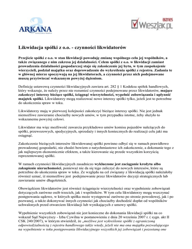 Likwidacja spółki z o.o. - czynności likwidatorów Przejście spółki z o.o. w stan likwidacji powoduję zmianę wspólnego celu jej wspólników, a także związanego z nim zakresu jej działalności. Celem spółki z o.o. w likwidacji zamiast prowadzenia działalności gospodarczej staje się zakończenie jej bytu, w tym zaspokojenie wierzycieli, podział majątku oraz doprowadzenie do wykreślenia spółki z rejestru. Zadania te w głównej mierze spoczywają na jej likwidatorach, a czynności przez nich podejmowane muszą przyświecać wskazanym powyżej dążeniom. Definicję ustawową czynności likwidacyjnych zawiera art. 282 § 1 Kodeksu spółek handlowych, który wskazuje, że należy przez nie rozumieć czynności podejmowane przez likwidatorów, mające zakończyć interesy bieżące spółki, ściągnąć wierzytelności, wypełnić zobowiązania i upłynnić majątek spółki. Likwidatorzy mogą realizować nowe interesy spółki tylko, jeżeli jest to potrzebne do ukończenia spraw w toku. Likwidatorzy mają w pierwszej kolejności zakończyć bieżące interesy spółki. Nie jest jednak niemożliwe zawieranie chociażby nowych umów, w tym przypadku istotne, żeby służyło to wskazanemu powyżej celowi. Likwidator ma więc możliwość zawarcia przykładowo umów komisu pojazdów należących do spółki, przewozowych, spedycyjnych, sprzedaży i innych koniecznych do realizacji celu jaki ma osiągnąć. Zakończenie bieżących interesów likwidowanej spółki powinno odbyć się w ramach prawidłowo prowadzonej gospodarki, nie chodzi bowiem o natychmiastowe ich zakończenie, a dokonanie tego z jak najlepszym ekonomicznie efektem, a także kierowanie się przede wszystkim korzyścią reprezentowanej spółki. W ramach czynności likwidacyjnych zasadniczo wykluczone jest zaciąganie kredytu albo zakupienie nieruchomości, ponieważ nie da się tego zaliczyć do nowych interesów, które są potrzebne do ukończenia spraw w toku. Ze względu na cel związany z likwidacją spółki należałoby również uznać, iż niemożliwe jest podejmowanie przez likwidatorów decyzji strategicznych lub zawieranie umów długoletnich. Obowiązkiem likwidatorów jest również ściągnięcie wierzytelności oraz wypełnienie zobowiązań dotyczących zarówno osób trzecich, jak i wspólników. W tym celu likwidatorzy mogą wszczynać postępowania sądowe, w których spółka może występować zarówno po stronie powodowej, jak i po pozwanej, a także dokonywać innych czynności jak chociażby dochodzić dopłat od wspólników uchwalonych przed otwarciem likwidacji lub wynikających z umowy spółki. Wypełnienie wszystkich zobowiązań nie jest konieczne do dokonania likwidacji spółki na co wskazał Sąd Najwyższy - Izba Cywilna w postanowieniu z dnia 20 września 2007 r. ( sygn. akt II CSK 240/2007), w którym stwierdził, że „możliwe jest wykreślenie spółki z ograniczoną odpowiedzialnością z rejestru handlowego także wtedy, jeżeli nie ma ona majątku pozwalającego na wypełnienie w toku postępowania likwidacyjnego wszystkich jej zobowiązań i pozostaną one niezaspokojone”. Czynnościami likwidacyjnym są także te związane z upłynnieniem majątku spółki. Nie mogą polegać one jedynie na jak najszybszym sprzedaniu rzeczy, ponieważ wymagają często prowadzenia negocjacji lub dokonania czynności dodatkowych, takich jak chociażby dokonanie remontu budynku albo naprawy maszyn, aby mogły zostać one sprzedane później po wyższej cenie. Zasadą postępowania likwidacyjnego jest spieniężenie majątku spółki jednak należy uznać, że możliwe jest również chociażby rozliczenie się z wierzycielem za pomocą składnika majątkowego należącego do spółki. Czynności likwidacyjne likwidatorzy mogą co do zasady podejmować swobodnie jednak ograniczenie występuje w przypadku nieruchomości, które mogą być zbywane jedynie w drodze publicznej licytacji, a z wolnej ręki tylko na mocy uchwały wspólników po cenie nie niższej od uchwalonej przez nich zgodnie z art. 282 § 1 KSH. Możliwe jest również zbycie przez likwidatorów całego przedsiębiorstwa. Wymagane jest wtedy zachowanie formy pisemnej z podpisem notarialnie poświadczonym, chyba że w jego skład wchodzi nieruchomość, wtedy wymagana będzie forma aktu notarialnego. Problematyczne jest, czy w tym przypadku konieczne jest uzyskanie zgody zgromadzenia wspólników. Wydaje się, że zgoda taka będzie konieczna jedynie w przypadku zbycia przedsiębiorstwa sprzedawanego z wolnej ręki, w skład którego będzie wchodziła nieruchomość zgodnie z art. 275 § 1 KSH w związku z art. 282 § 1 zdanie 3 KSH, chociaż spotkać się można z odmiennymi poglądami. Likwidatorzy w stosunkach wewnętrznych czyli związanych z prowadzeniem spraw spółki zgodnie z art. 282 § 2 obowiązani są stosować się do uchwał zgromadzenia wspólników, w przypadku zaś likwidatorów ustanowionych przez sąd do jednomyślnych uchwał wspólników oraz osób, które ich ustanowiły. Podsumowując - czynności dokonywane przez likwidatorów spółki z o.o. powinny być nastawione nie tylko na szybkie zakończenie jej bytu, ale również, a może przede wszystkim na racjonalnym ich prowadzeniu. W toku ich podejmowania należy chronić interesy spółki, a działania powinny charakteryzować się zgodnością z zasadami prawidłowej gospodarki i najlepszym z ekonomicznego punktu widzenia efektem. Marcin Kamiński Kancelaria Prawna ARKANA
