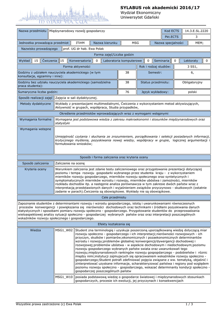 SYLABUS rok akademicki 2016/17 Wydział Ekonomiczny Uniwersytet Gdański Nazwa przedmiotu Międzynarodowy rozwój gospodarczy Jednostka prowadząca przedmiot Nazwisko prowadzącego ITiHM Nazwa kierunku MSG Kod ECTS 14.3.E.SL.2220 Pkt.ECTS 3 Nazwa specjalności MEM; prof. UG dr hab. Ewa Polak Forma zajęć/Liczba godzin Wykład 15 Ćwiczenia 15 Konwersatoria 0 Laboratoria komputerowe Forma aktywności 0 Seminaria 0 Lektoraty Rok i rodzaj studiów: 3 SS1, Godziny z udziałem nauczyciela akademickiego (w tym konsultacje, egzaminy i inne): 38 Semestr: 6, Godziny bez udziału nauczyciela akademickiego (samodzielna praca studenta): 38 Status przedmiotu: Obligatoryjny Sumaryczna liczba godzin: 76 Język wykładowy: polski 0 Sposób realizacji zajęć Zajęcia w sali dydaktycznej. Metody dydaktyczne Wykłady z prezentacjami multimedialnymi, Ćwiczenia z wykorzystaniem metod aktywizujących, Aktywność w grupach, współpraca, Studia przypadków, Określenie przedmiotów wprowadzających wraz z wymogami wstępnymi Wymagania formalne Wymagana jest podstawowa wiedza z zakresu makroekonomii i stosunków międzynarodowych oraz statystyki Wymagania wstepne Umiejętność czytania i słuchania ze zrozumieniem, porządkowania i selekcji posiadanych informacji, krytycznego myślenia, pozyskiwania nowej wiedzy, współpracy w grupie, logicznej argumentacji i formułowania wniosków; Sposób i forma zaliczenia oraz kryteria oceny Sposób zaliczenia Kryteria oceny Zaliczenie na ocenę Warunkiem zaliczenia jest zdanie testu zaliczeniowego oraz przygotowanie prezentacji dotyczącej poziomu i tempa rozwoju gospodarki wybranego przez studenta kraju - z wykorzystaniem mierników rozwoju gospodarczego, mierników rozwoju społecznego oraz syntetycznych i symptomatycznych mierników wzrostu i rozwoju, mierników ubóstwa i zamożności, mierników rozkładu dochodów itp. a następnie analiza porównawcza w tym zakresie dwóch państw wraz z interpretacją przedstawionych danych i wyjaśnieniem związków przyczynowo - skutkowych (ostatnie zadanie w parach).Ćwiczenia są obowiązkowe. Wykłady nie są obowiązkowe. Cele przedmiotu Zapoznanie studentów z determinantami rozwoju i wzrostu gospodarczego, istotą i uwarunkowaniami równoczesnych procesów konwergencji i powiększania się nierówności dochodowych oraz technikami i źródłami pozyskiwania danych statystycznych i sposobami pomiaru rozwoju społeczno - gospodarczego. Przygotowanie studentów do przeprowadzania wieloaspektowej analizy sytuacji społeczno - gospodarczej wybranych państw oraz oraz interpretacji poszczególnych wskaźników rozwoju społecznego i gospodarczego. Efekty kształcenia się Wiedza MSG1_W02 Student zna terminologię i uzyskuje poszerzoną uporządkowaną wiedzę dotyczącą miar rozwoju społeczno - gospodarczego i ich interpretacji;nierówności rozwojowych - ich przyczyn, skutków i pomiarów;ekonomicznych i pozaekonomicznych determinantów wzrostu i rozwoju;problemów globalnej konwergencji/dywergencji dochodowej i rozwojowej;problemów ubóstwa - w aspekcie dochodowym i niedochodowym;poziomu rozwoju gospodarczego wybranych państw swiata oraz uwarunkowań tego rozwoju;międzynarodowych rankingów rozwoju gospopdarczego - podobieństw i róznic między nimi;instytucji zajmujacych się opracowaniem wskaźników rozwoju społeczno gospodarczego;Student potrafi zdefiniować pojęcia związane z ww. tematyką, objaśnić i zinterpretować uzyskane informacje, scharakteryzować państwa i regiony pod względem poziomu rozwoju społeczno - gospodarczego, wskazać determinanty kondycji społeczno gospodarczej poszczególnych państw MSG1_W10 posiada podstawową wiedzę o gospodarce światowej i międzynarodowych stosunkach gospodarczych, procesie ich ewolucji, jej przyczynach i konsekwencjach Wszystkie prawa zastrzeżone (c) Ewa Polak 1/3 SYLABUS rok akademicki 2016/17 Wydział Ekonomiczny Uniwersytet Gdański Weryfikacja efektów kształcenia - Wiedza Efekty MSG1_W02 X X X MSG1_W09 X X X Umiejętności MSG1_U03 Student potrafi interpretować podstawowe problemy i procesy współczesnej gospodarki światowej, ich przyczyny i przebieg MSG1_U04 potrafi dokonywać obserwacji i analiz podstawowych procesów gospodarczych zachodzących w gospodarce otwartej, potrafi interpretować niezbędne w tym zakresie dane statystyczne oraz wskaźniki ekonomiczne MSG1_U09 prawidłowo posługuje się pojęciami z zakresu międzynarodowych stosunków gospodarczych Weryfikacja efektów kształcenia - Umiejętności Efekty MSG1_U03 X X X MSG1_U04 X X X MSG1_U09 X X X Kompetencje MSG1_K01 zna ograniczenia własnej wiedzy oraz umiejętności i rozumie potrzebę uczenia się przez całe życie oraz pogłębiania i uzupełniania MSG1_K02 potrafi współpracować w zespole, w tym przyjmować różne role zespołowe, posiada elementarne umiejętności organizacyjne Weryfikacja efektów kształcenia - Kompetencje Efekty MSG1_K01 X X MSG1_K02 X X Treści programowe 1. Pojęcie wzrostu i rozwoju gospodarczego, produkt krajowy brutto, parytet siły nabywczej, wartości nominalne i realne, stopy wzrostu, indeksy. 2. Pomiar rozwoju gospodarczego, wybrane miary indeksowe służące ocenie poziomu rozwoju gospodarczego. Międzynarodowej instytucje/organizacje zajmujące się problematyką rozwoju gospodarczego. 3. Wskaźniki rozwoju społecznego i ich znaczenie i interpretacja. 4. Rozwój zrównoważony, rozwój zintegrowany. 5. Współczesne determinanty wzrostu i rozwoju gospodarczego. Determinanty ekonomiczne i pozaekonomiczne. 6. Problemy globalnej konwergencji/dywergencji dochodowej oraz rozwojowej. Konwergencja absolutna oraz względna, Wszystkie prawa zastrzeżone (c) Ewa Polak 2/3 SYLABUS rok akademicki 2016/17 Wydział Ekonomiczny Uniwersytet Gdański konwergencja technologiczna. Koncepcja luki rozwojowej i technologicznej. Metody pomiaru procesu konwergencji. 7. Problemy ubóstwa. Koncepcje ubóstwa - koncepcje dochodowe i niedochodowe. Metody pomiaru. S