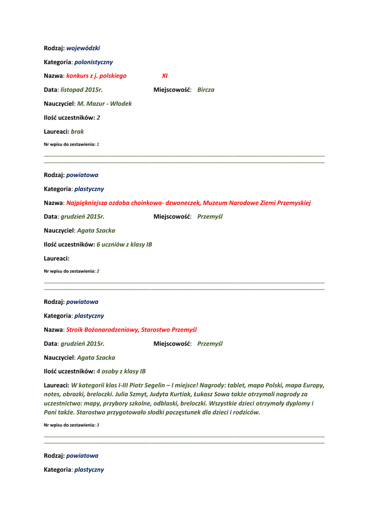 Rodzaj: wojewódzki Kategoria: polonistyczny Nazwa: konkurs z j. polskiego Data: listopad 2015r. XI Miejscowość: Bircza Nauczyciel: M. Mazur - Włodek Ilość uczestników: 2 Laureaci: brak Nr wpisu do zestawienia: 1 --------------------------------------------------------------------------------------------------------------------------------------------------------------------------------------------------------------------------------------------------------------------------------------------------------------------------------------------------------------------------------- Rodzaj: powiatowa Kategoria: plastyczny Nazwa: Najpiękniejsza ozdoba choinkowa- dzwoneczek, Muzeum Narodowe Ziemi Przemyskiej Data: grudzień 2015r. Miejscowość: Przemyśl Nauczyciel: Agata Szacka Ilość uczestników: 6 uczniów z klasy IB Laureaci: Nr wpisu do zestawienia: 2 --------------------------------------------------------------------------------------------------------------------------------------------------------------------------------------------------------------------------------------------------------------------------------------------------------------------------------------------------------------------------------- Rodzaj: powiatowa Kategoria: plastyczny Nazwa: Stroik Bożonarodzeniowy, Starostwo Przemyśl Data: grudzień 2015r. Miejscowość: Przemyśl Nauczyciel: Agata Szacka Ilość uczestników: 4 osoby z klasy IB Laureaci: W kategorii klas I-III Piotr Segelin – I miejsce! Nagrody: tablet, mapa Polski, mapa Europy, notes, obrazki, breloczki. Julia Szmyt, Judyta Kurtiak, Łukasz Sowa także otrzymali nagrody za uczestnictwo: mapy, przybory szkolne, odblaski, breloczki. Wszystkie dzieci otrzymały dyplomy i Pani także. Starostwo przygotowało słodki poczęstunek dla dzieci i rodziców. Nr wpisu do zestawienia: 3 --------------------------------------------------------------------------------------------------------------------------------------------------------------------------------------------------------------------------------------------------------------------------------------------------------------------------------------------------------------------------------- Rodzaj: powiatowa Kategoria: plastyczny Nazwa: Bożonarodzeniowe ozdoby świąteczne, Centrum Kulturalne w Przemyślu Data: grudzień 2015r. Miejscowość: Przemyśl Nauczyciel: Agata Szacka Ilość uczestników: 4 osoby z klasy IB Laureaci: Wyróżnienie spośród 473 prac- Piotr Segelin. Nagrody: dyplom, słuchawki, przybory szkolne. Nr wpisu do zestawienia: 4 --------------------------------------------------------------------------------------------------------------------------------------------------------------------------------------------------------------------------------------------------------------------------------------------------------------------------------------------------------------------------------- Rodzaj: ogólnopolska-płatna Kategoria: czytelniczy Nazwa: "Abecadło" Data: 01.12.2015r. Miejscowość: Skierniewice Nauczyciel: Emilia Kubicka Ilość uczestników: 1 Laureaci: wyniki w marcu Nr wpisu do zestawienia: 5 --------------------------------------------------------------------------------------------------------------------------------------------------------------------------------------------------------------------------------------------------------------------------------------------------------------------------------------------------------------------------------- Rodzaj: ogólnopolska-płatna Kategoria: ortograficzny Nazwa: "Ortografek" Data: 02.12.2015r. Miejscowość: Skierniewice Nauczyciel: Emilia Kubicka Ilość uczestników: 3 Laureaci: wyniki w marcu Nr wpisu do zestawienia: 6 --------------------------------------------------------------------------------------------------------------------------------------------------------------------------------------------------------------------------------------------------------------------------------------------------------------------------------------------------------------------------------- Rodzaj: ogólnopolska-płatna Kategoria: matematyczny Nazwa: "Plusik" Data: 03.12.2015r. Nauczyciel: Emilia Kubicka Miejscowość: Skierniewice Ilość uczestników: 6 Laureaci: wyniki w marcu Nr wpisu do zestawienia: 7 --------------------------------------------------------------------------------------------------------------------------------------------------------------------------------------------------------------------------------------------------------------------------------------------------------------------------------------------------------------------------------- Rodzaj: ogólnopolska-płatna Kategoria: plastyczny Nazwa: "Plastuś" Data: 10.12.2015r. Miejscowość: Skierniewice Nauczyciel: Emilia Kubicka Ilość uczestników: 8 Laureaci: wyniki w marcu Nr wpisu do zestawienia: 8 --------------------------------------------------------------------------------------------------------------------------------------------------------------------------------------------------------------------------------------------------------------------------------------------------------------------------------------------------------------------------------- Rodzaj: powiatowa Kategoria: plastyczny Nazwa: "Bożonarodzeniowe ozdoby świąteczne" Data: 05.12.2015r. Miejscowość: Przemyśl Nauczyciel: Emilia Kubicka Ilość uczestników: 5 Laureaci: brak Nr wpisu do zestawienia: 9 --------------------------------------------------------------------------------------------------------------------------------------------------------------------------------------------------------------------------------------------------------------------------------------------------------------------------------------------------------------------------------- Rodzaj: powiatowa Kategoria: plastyczny Nazwa: "Najpiękniejsza ozdoba choinkow