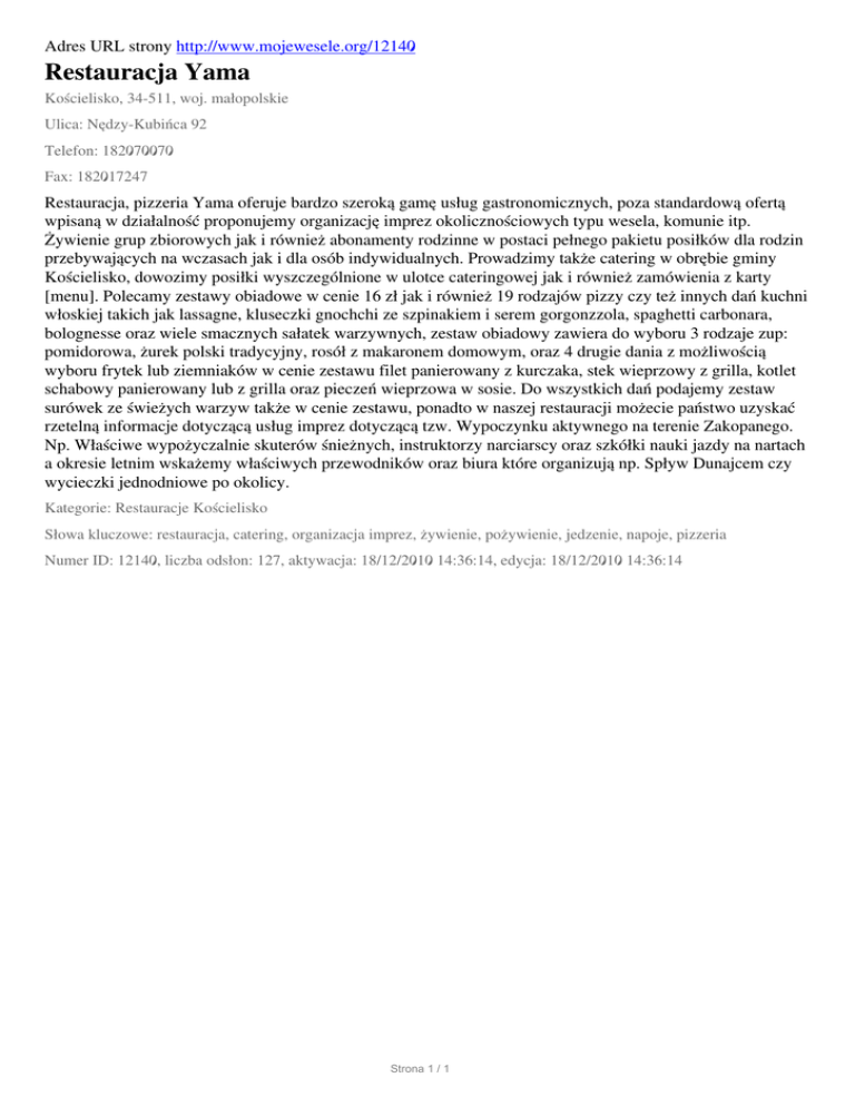 Adres URL strony http://www.mojewesele.org/12140 Restauracja Yama Kościelisko, 34-511, woj. małopolskie Ulica: Nędzy-Kubińca 92 Telefon: 182070070 Fax: 182017247 Restauracja, pizzeria Yama oferuje bardzo szeroką gamę usług gastronomicznych, poza standardową ofertą wpisaną w działalność proponujemy organizację imprez okolicznościowych typu wesela, komunie itp. Żywienie grup zbiorowych jak i również abonamenty rodzinne w postaci pełnego pakietu posiłków dla rodzin przebywających na wczasach jak i dla osób indywidualnych. Prowadzimy także catering w obrębie gminy Kościelisko, dowozimy posiłki wyszczególnione w ulotce cateringowej jak i również zamówienia z karty [menu]. Polecamy zestawy obiadowe w cenie 16 zł jak i również 19 rodzajów pizzy czy też innych dań kuchni włoskiej takich jak lassagne, kluseczki gnochchi ze szpinakiem i serem gorgonzzola, spaghetti carbonara, bolognesse oraz wiele smacznych sałatek warzywnych, zestaw obiadowy zawiera do wyboru 3 rodzaje zup: pomidorowa, żurek polski tradycyjny, rosół z makaronem domowym, oraz 4 drugie dania z możliwością wyboru frytek lub ziemniaków w cenie zestawu filet panierowany z kurczaka, stek wieprzowy z grilla, kotlet schabowy panierowany lub z grilla oraz pieczeń wieprzowa w sosie. Do wszystkich dań podajemy zestaw surówek ze świeżych warzyw także w cenie zestawu, ponadto w naszej restauracji możecie państwo uzyskać rzetelną informacje dotyczącą usług imprez dotyczącą tzw. Wypoczynku aktywnego na terenie Zakopanego. Np. Właściwe wypożyczalnie skuterów śnieżnych, instruktorzy narciarscy oraz szkółki nauki jazdy na nartach a okresie letnim wskażemy właściwych przewodników oraz biura które organizują np. Spływ Dunajcem czy wycieczki jednodniowe po okolicy. Kategorie: Restauracje Kościelisko Słowa kluczowe: restauracja, catering, organizacja imprez, żywienie, pożywienie, jedzenie, napoje, pizzeria Numer ID: 12140, liczba odsłon: 127, aktywacja: 18/12/2010 14:36:14, edycja: 18/12/2010 14:36:14 Strona 1 / 1